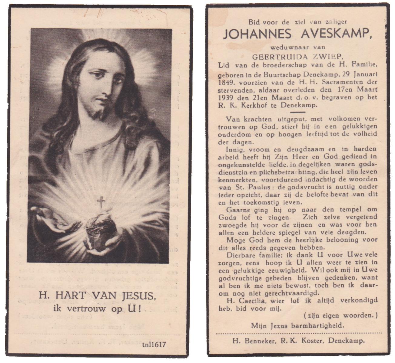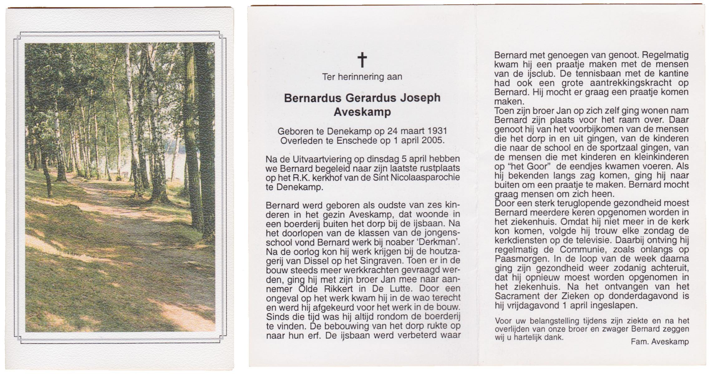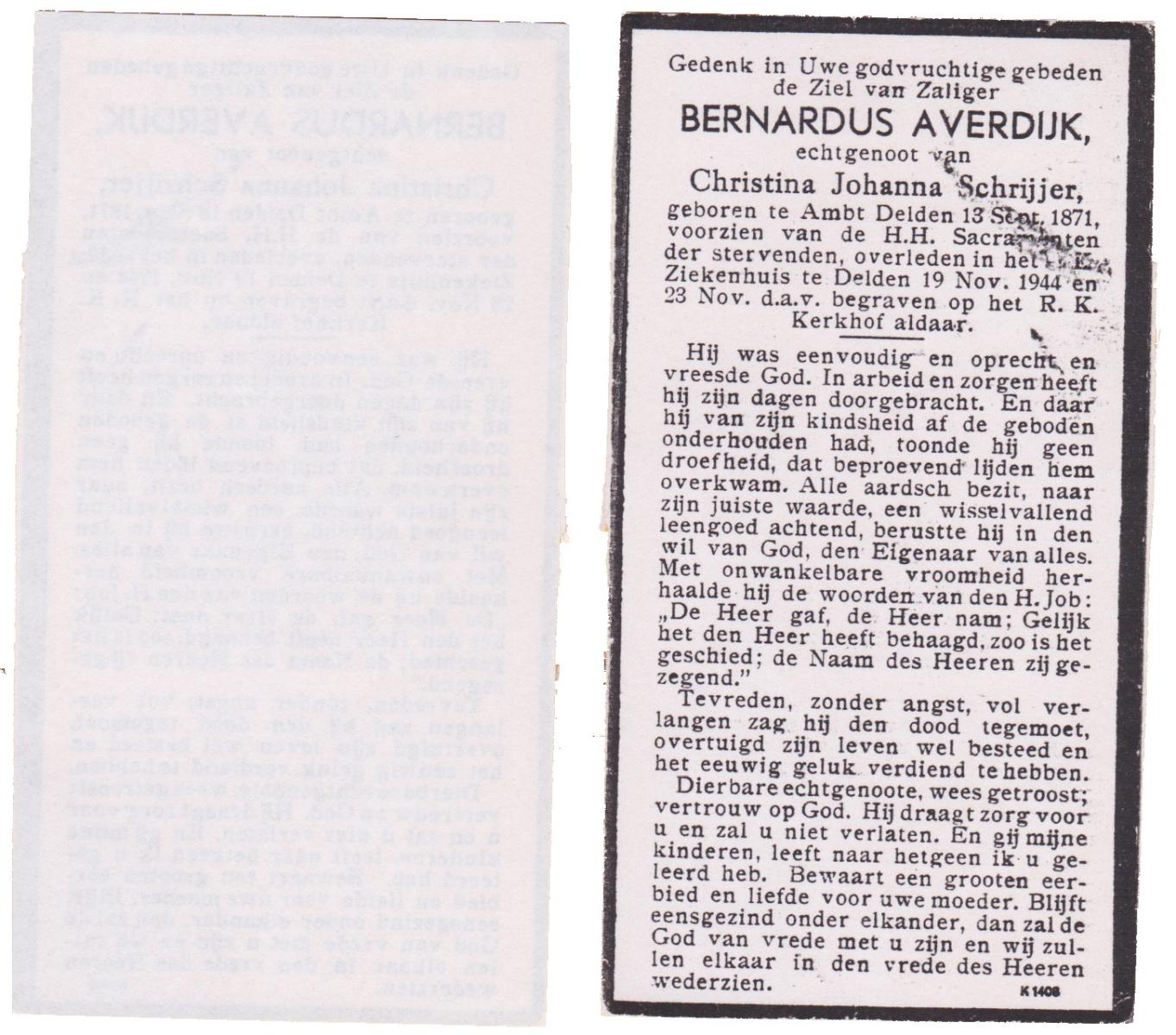 AVERDIJK, Bernardus, geboren op 13-09-1871 te Delden, Ambt, overleden op 19-11-1944 te Delden op 73-jarige leeftijd, begraven op 23-11-1944 te Delden.