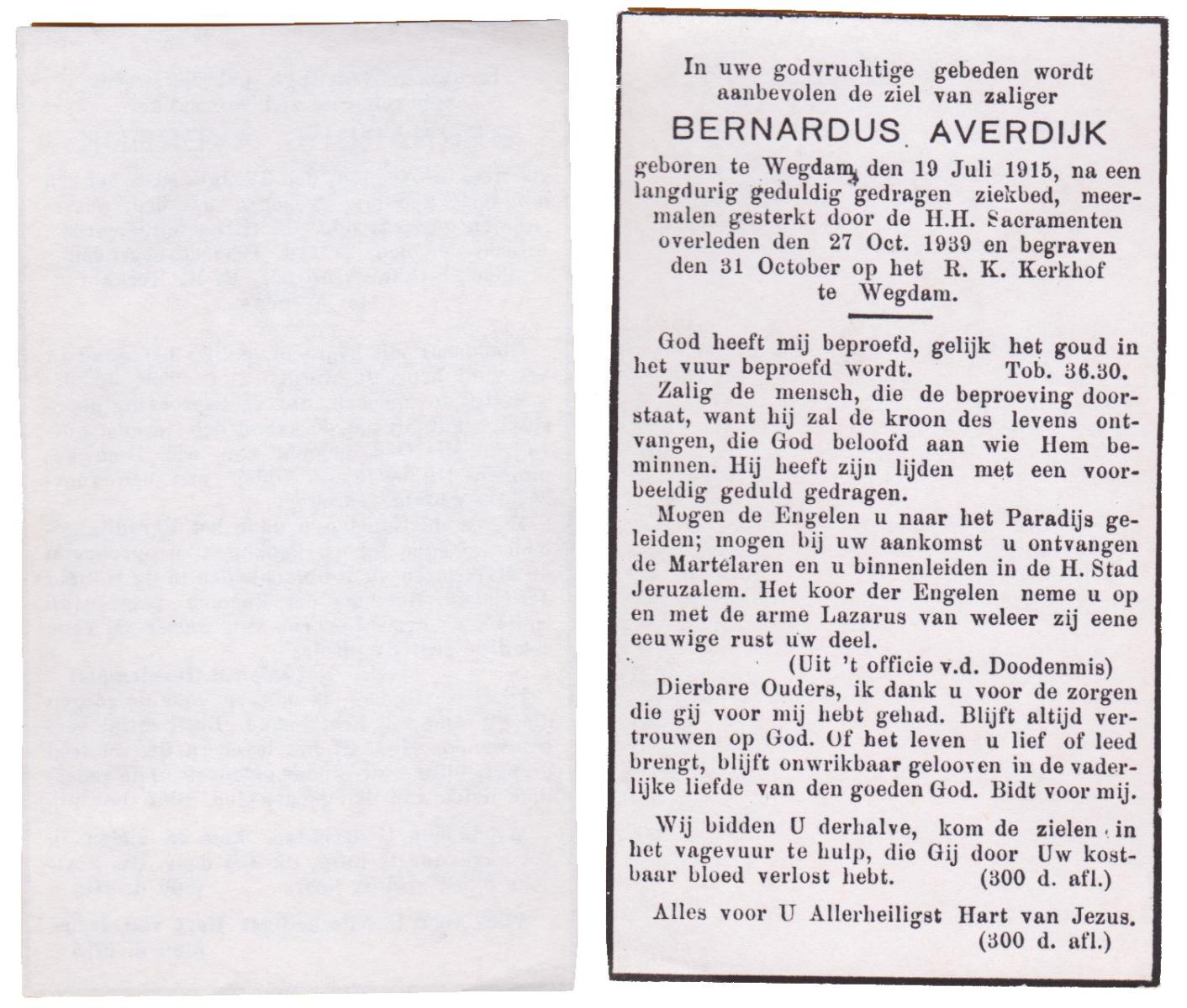 AVERDIJK, Bernardus, geboren op 19-7-1915 te Wegdam, overleden op 27-10-1939 op 24-jarige leeftijd, begraven op 31-10-1939 te Wegdam.