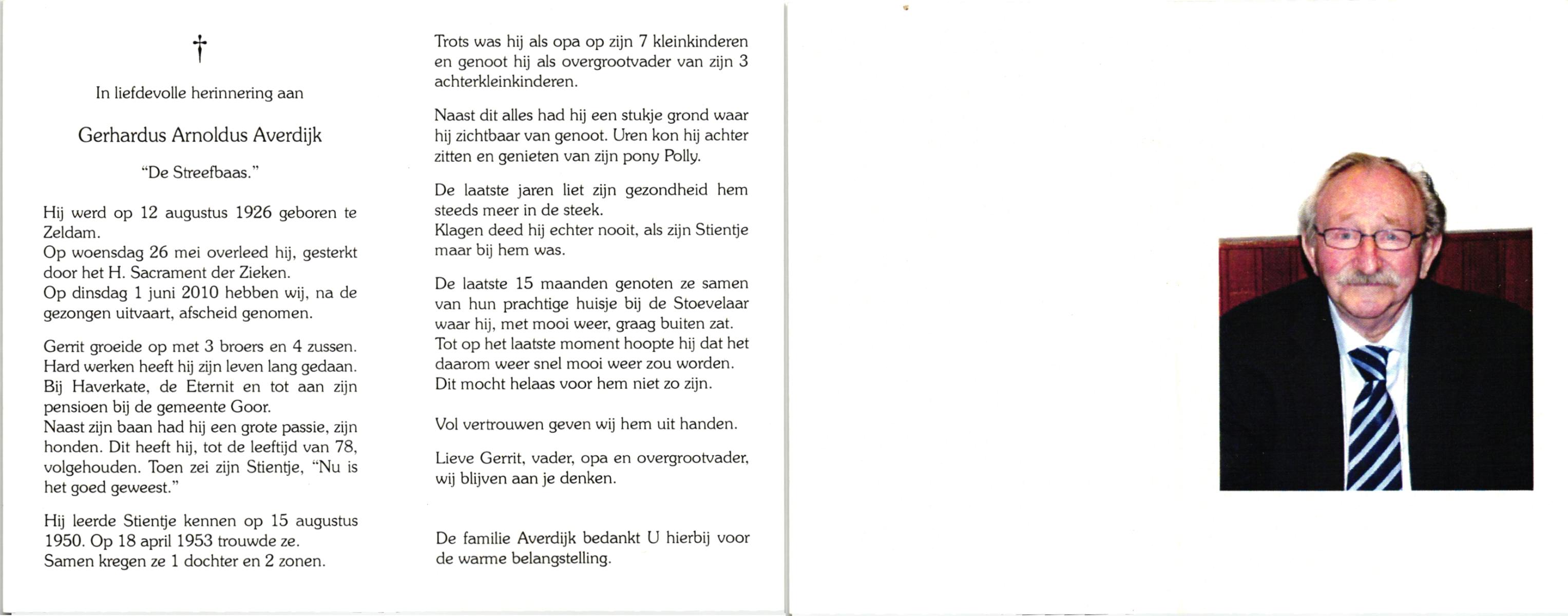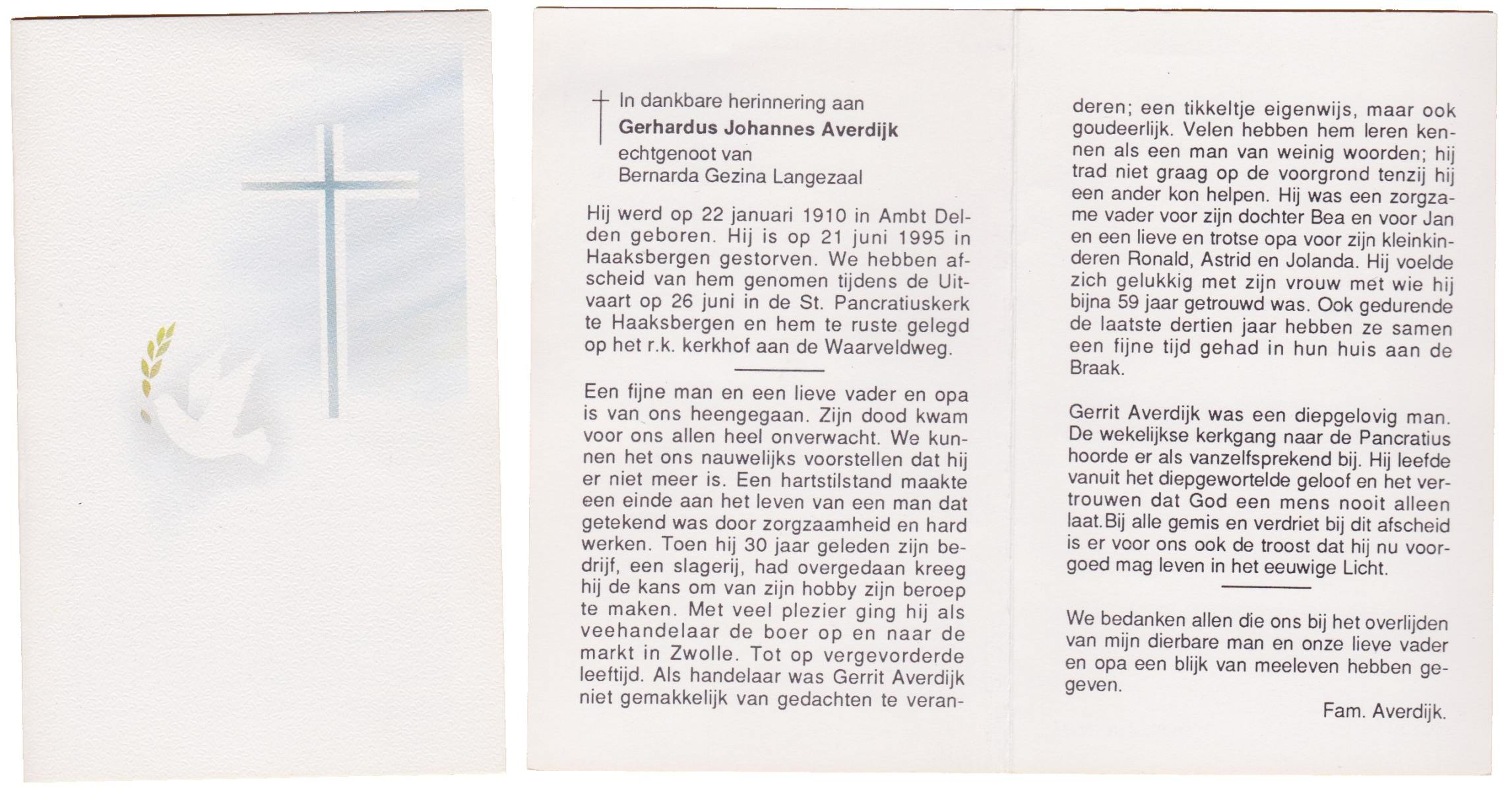 AVERDIJK, Gerhardus Johannes, geboren op 22-1-1910 te Delden, Ambt, overleden op 21-6-1995 te Haaksbergen op 85-jarige leeftijd, begraven op 26-6-1995 te Haaksbergen.