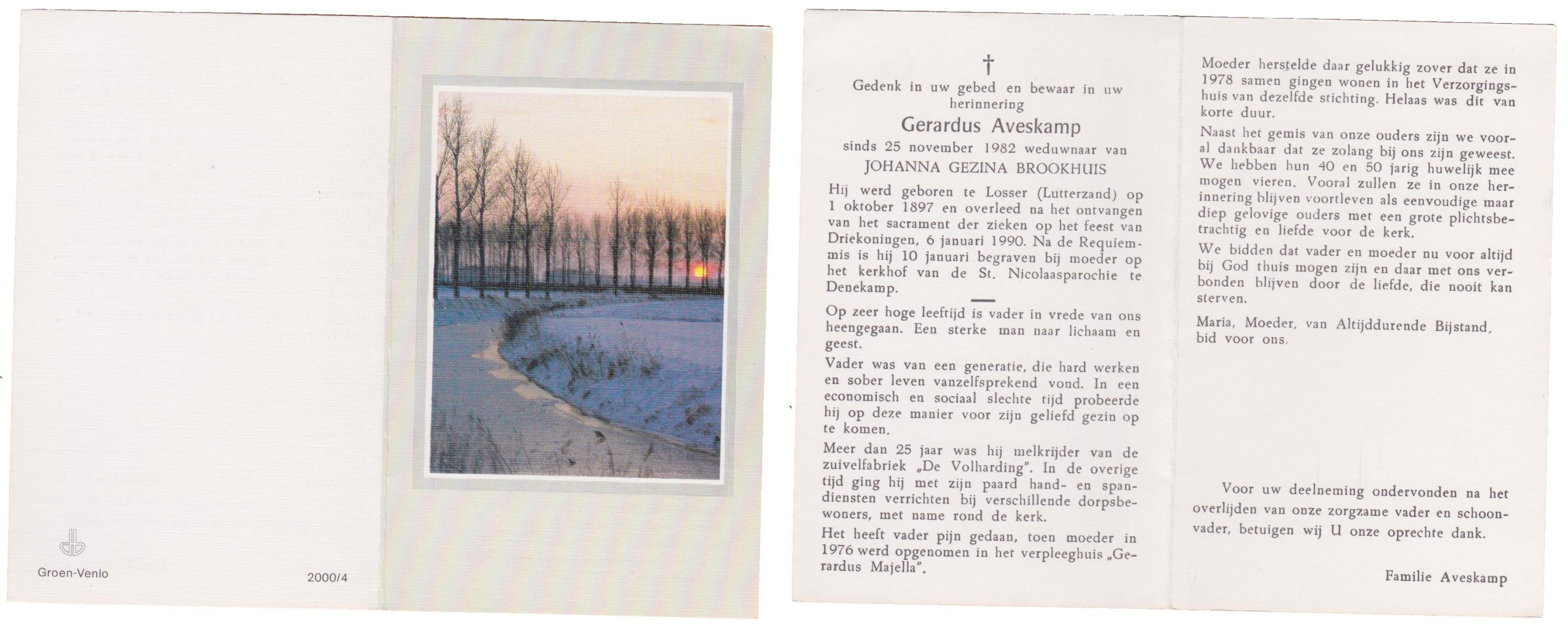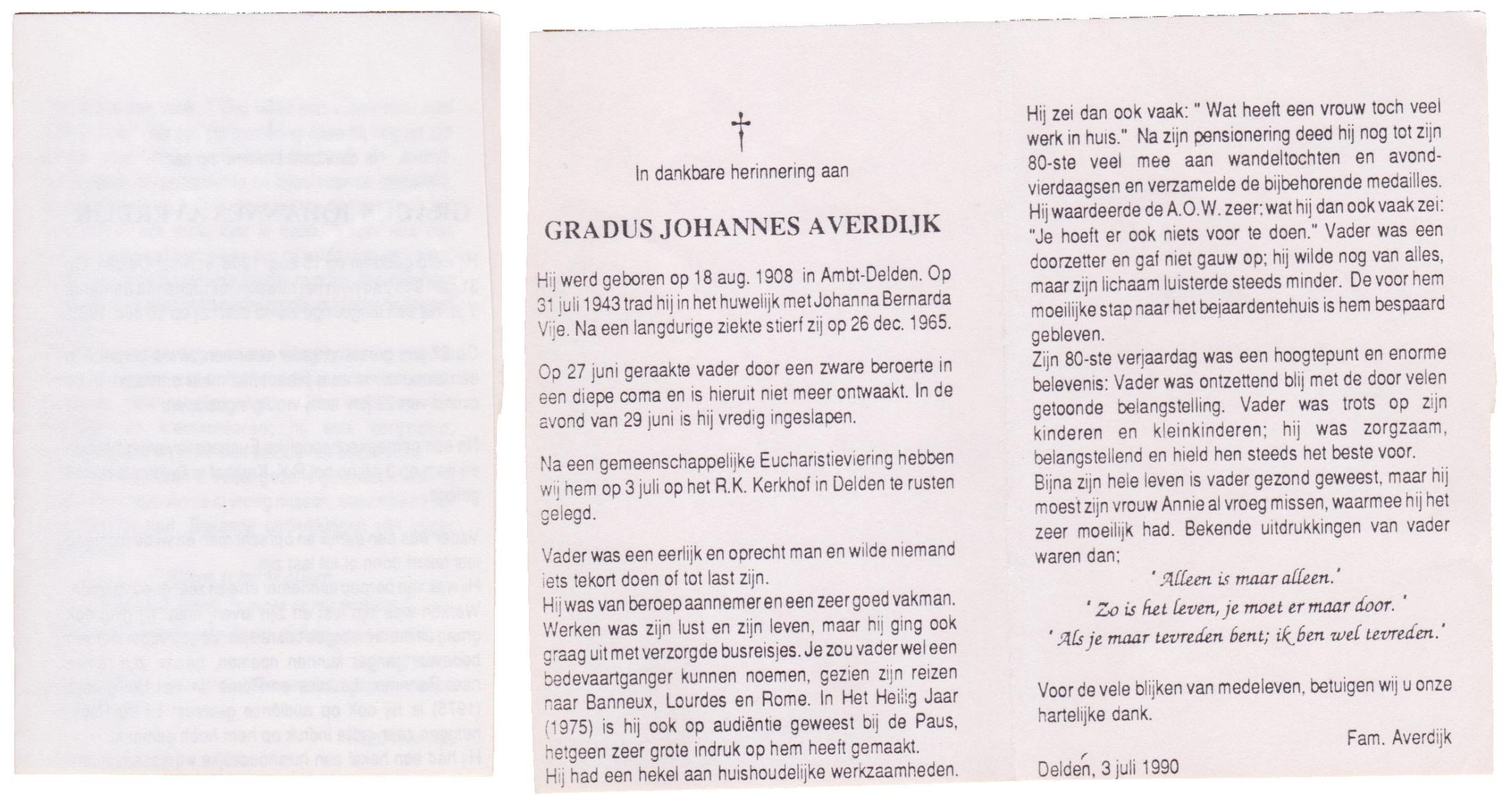 AVERDIJK, Gradus Johannes, geboren op 18-8-1908 te Delden, Ambt, overleden op 29-6-1990 te Delden op 81-jarige leeftijd, begraven op 3-7-1990 te Delden.
