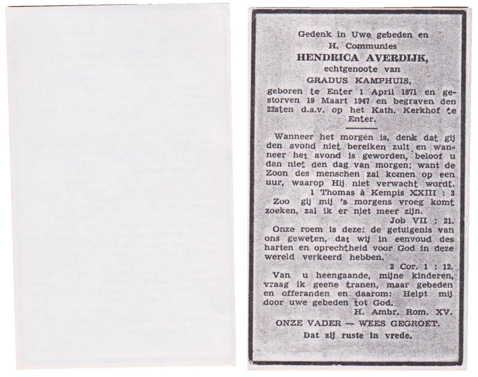AVERDIJK, Hendrica, geboren op 01-04-1871 te Enter, overleden op 19-3-1947 te Enter op 75-jarige leeftijd, begraven op 22-3-1947 te Enter.