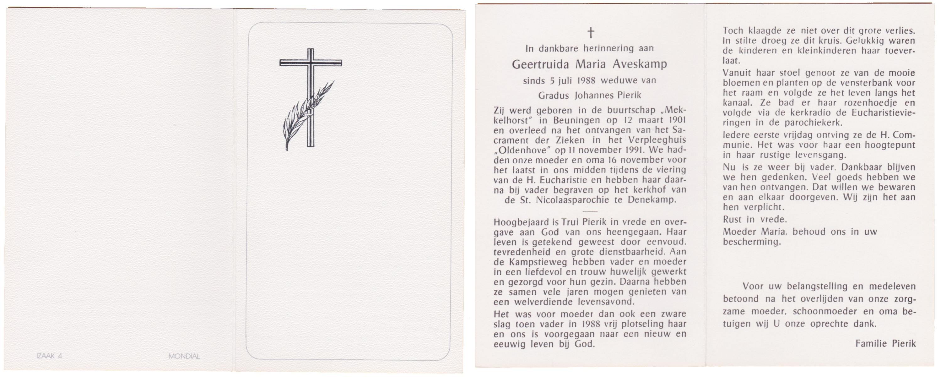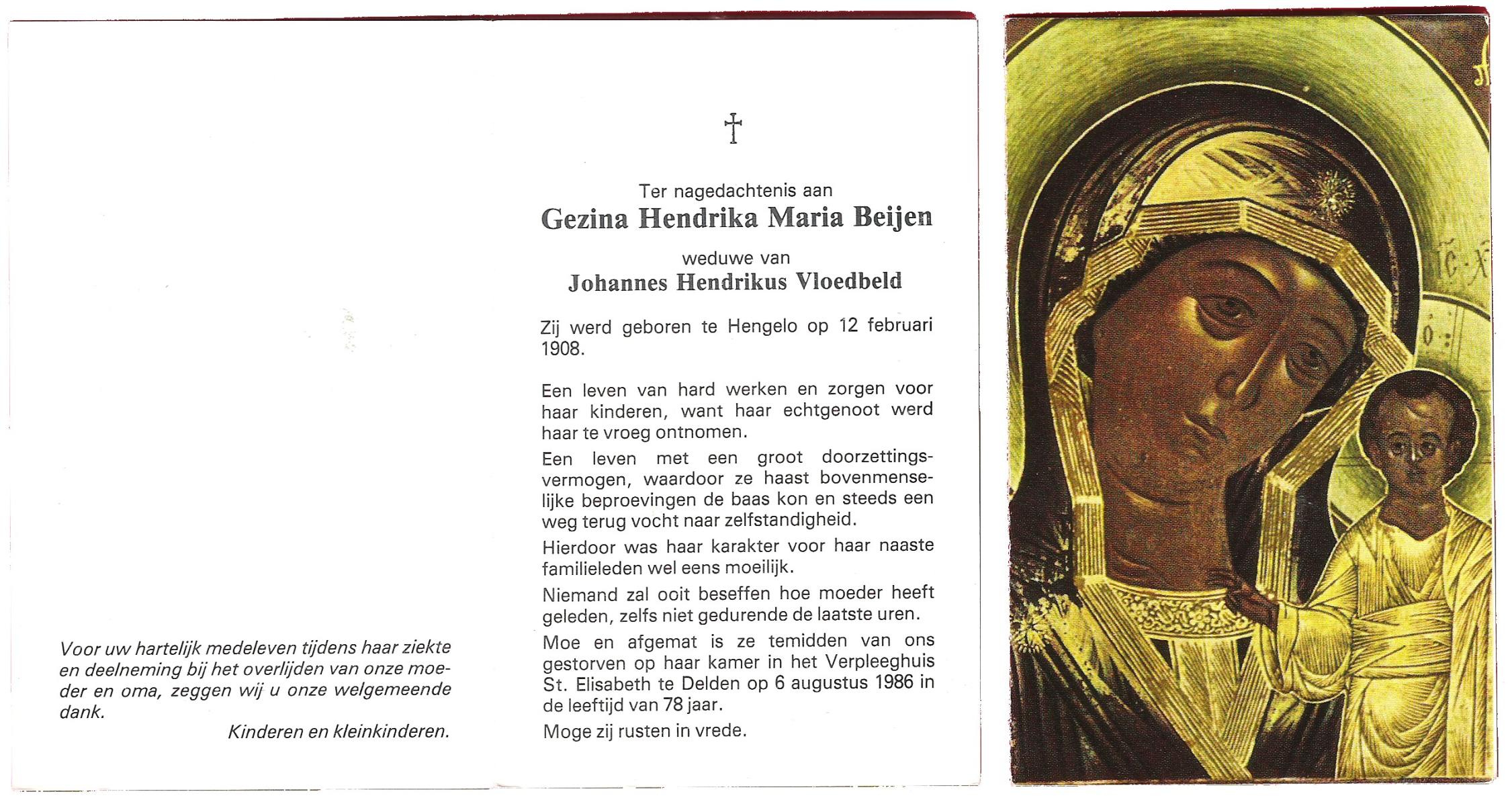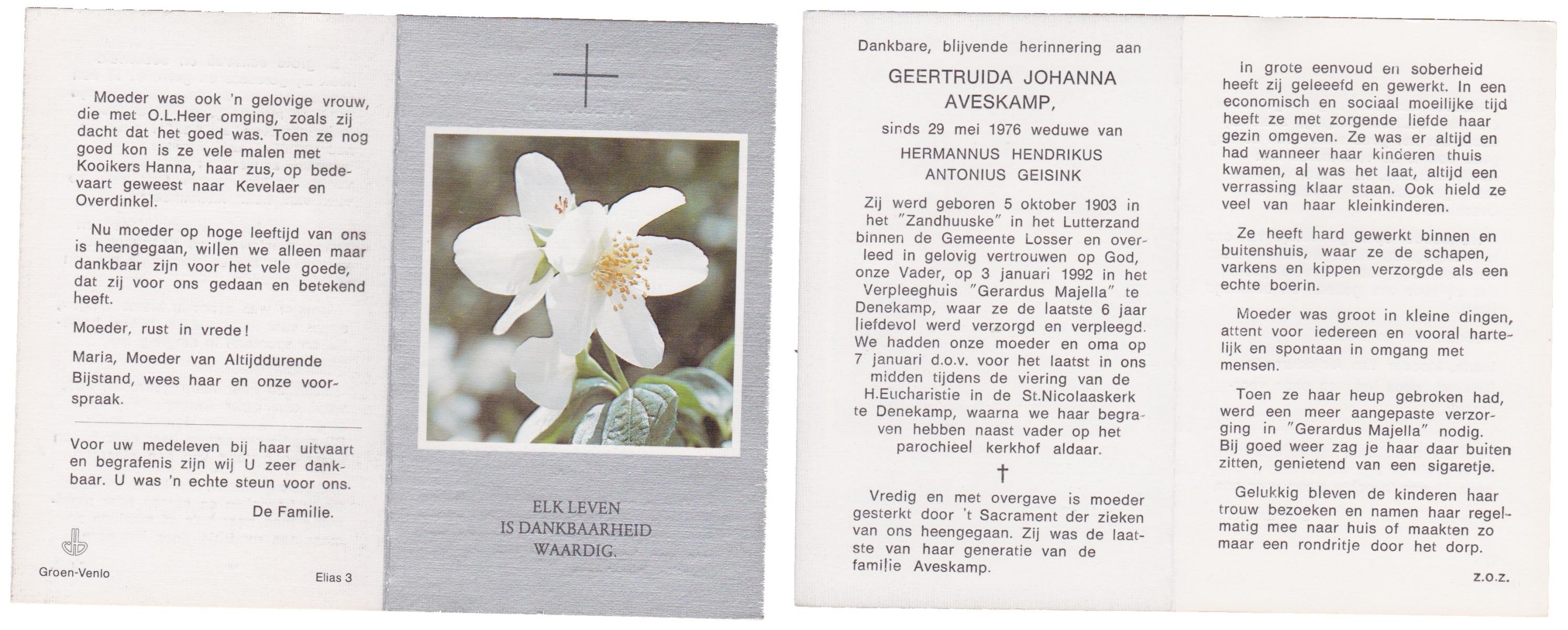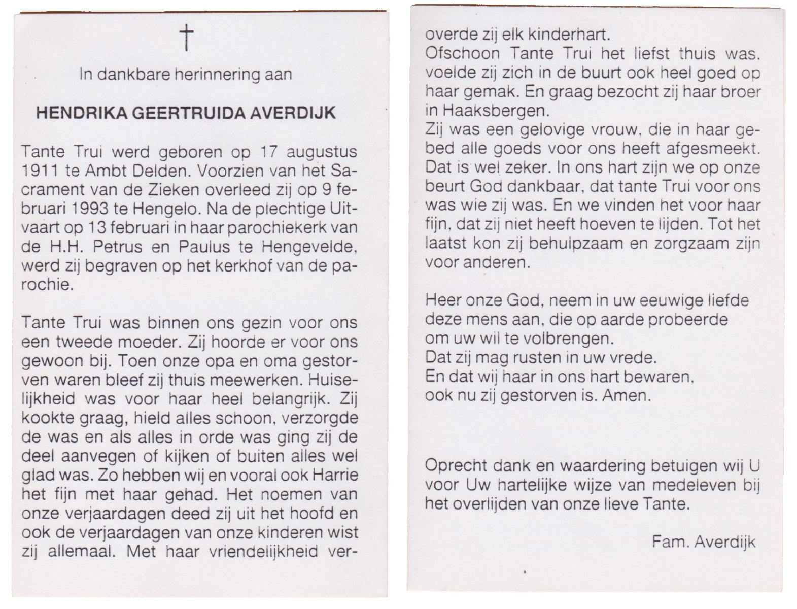 AVERDIJK, Hendrika Geertruida (tante Trui), geboren op 17-8-1911 te Delden, Ambt, overleden op 9-2-1993 te Hengelo (Ov.) op 81-jarige leeftijd, begraven op 13-2-1993 te Hengevelde.