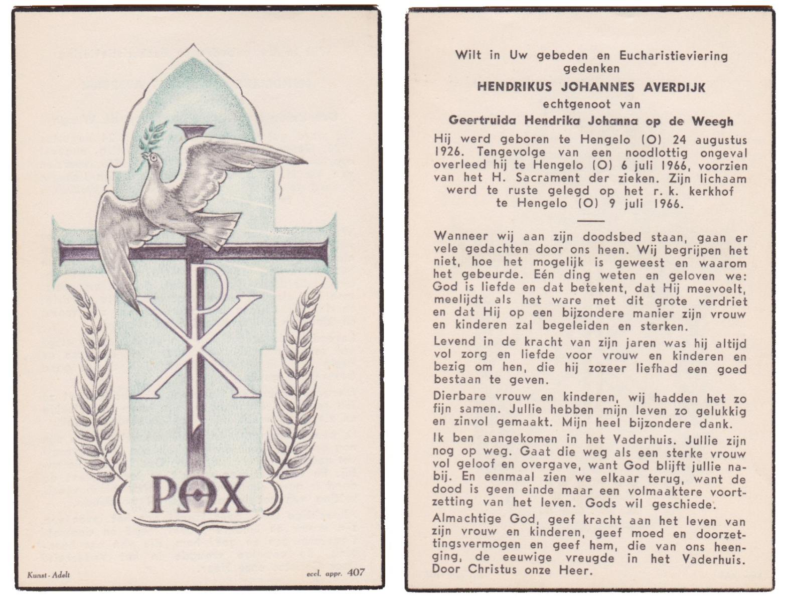 AVERDIJK, Hendrikus Johannes, geboren op 24-8-1926 te Hengelo (O), overleden op 6-7-1966 te Hengelo (Ov.) op 39-jarige leeftijd, begraven op 9-7-1966 te Hengelo (O).