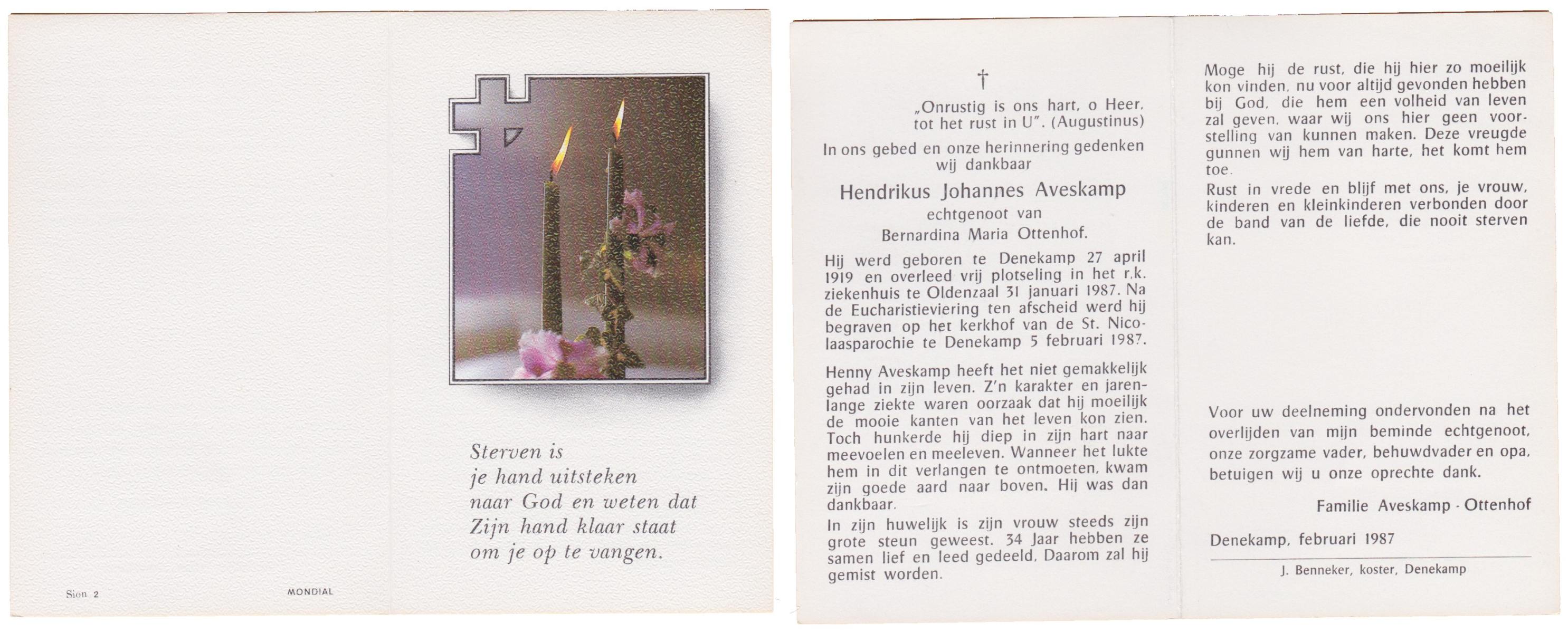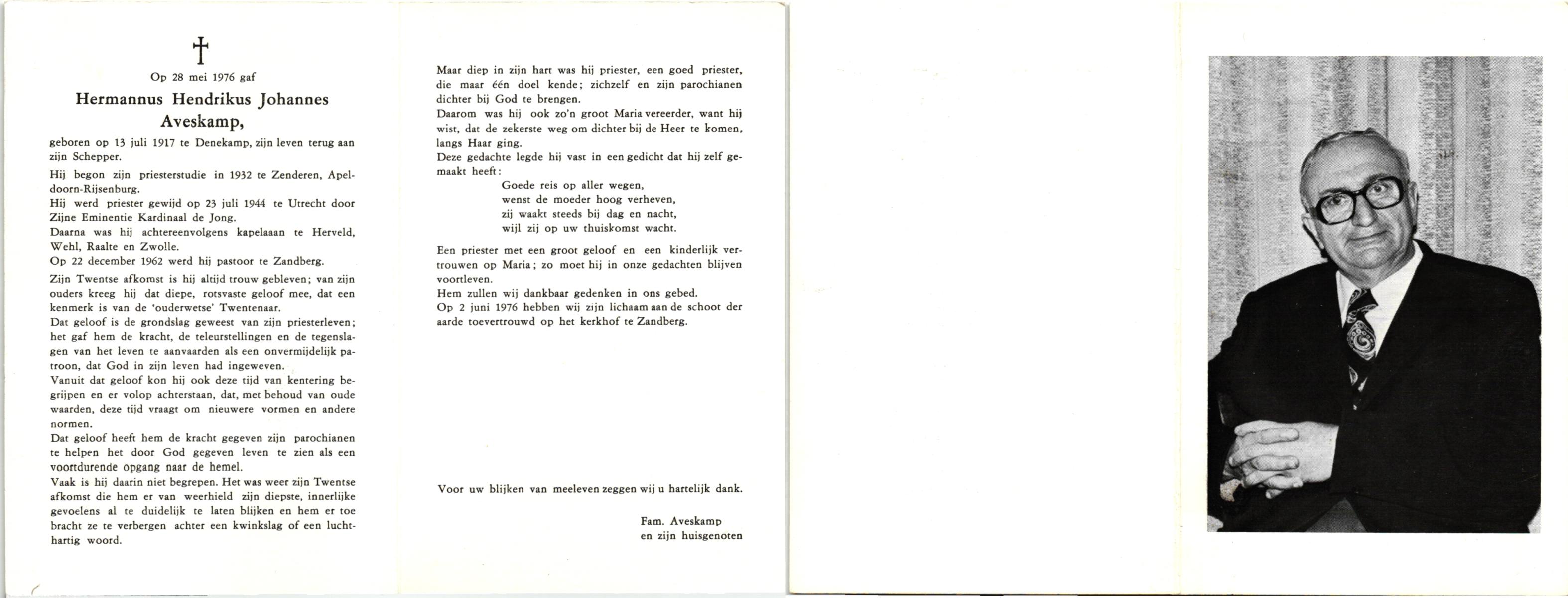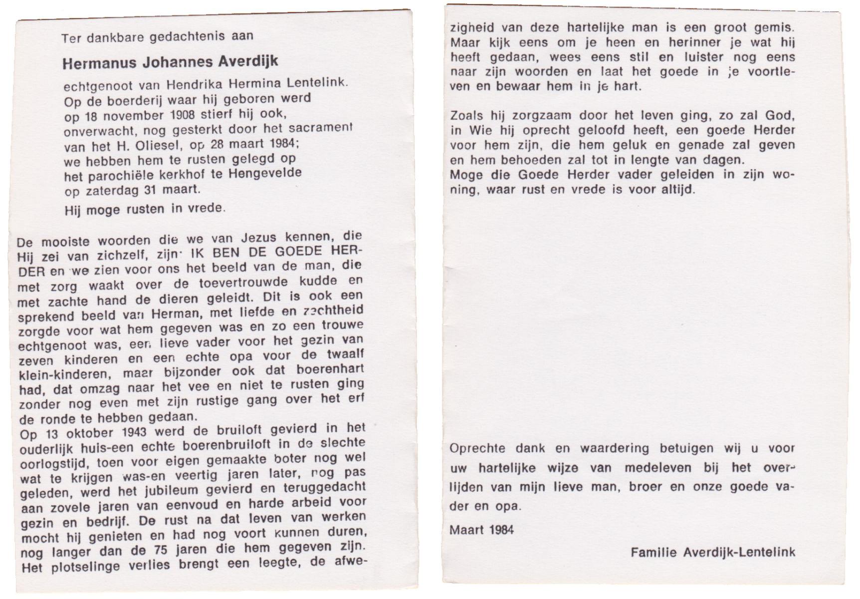 AVERDIJK, Hermanus Johannes, geboren op 18-11-1908 te Hengevelde, overleden op 28-3-1984 te Hengevelde op 74-jarige leeftijd, begraven op 31-3-1984 te Hengevelde.