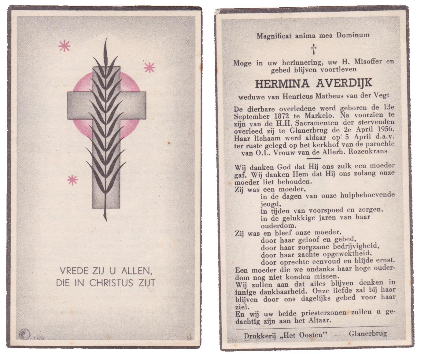 AVERDIJK, Hermina, geboren op 13-09-1872 te Markelo, overleden op 2-4-1956 te Glanerbrug op 83-jarige leeftijd, begraven op 5-4-1956 te Glanerbrug.