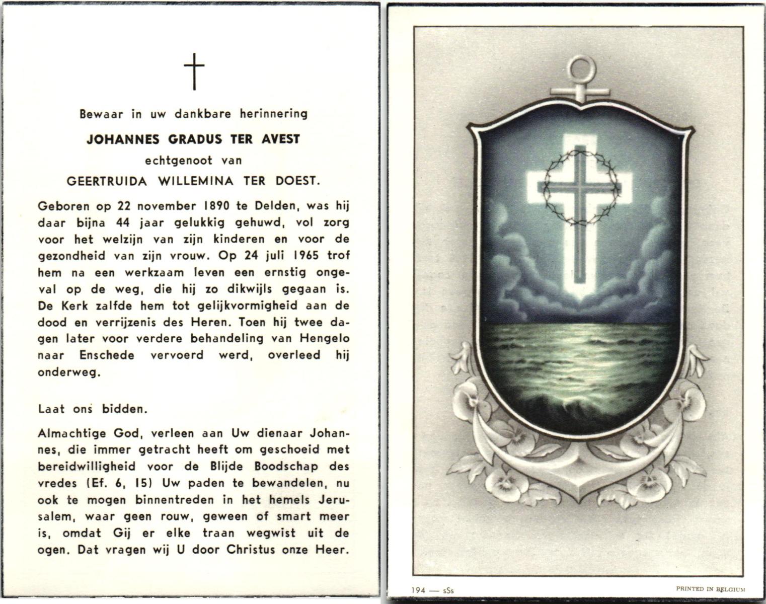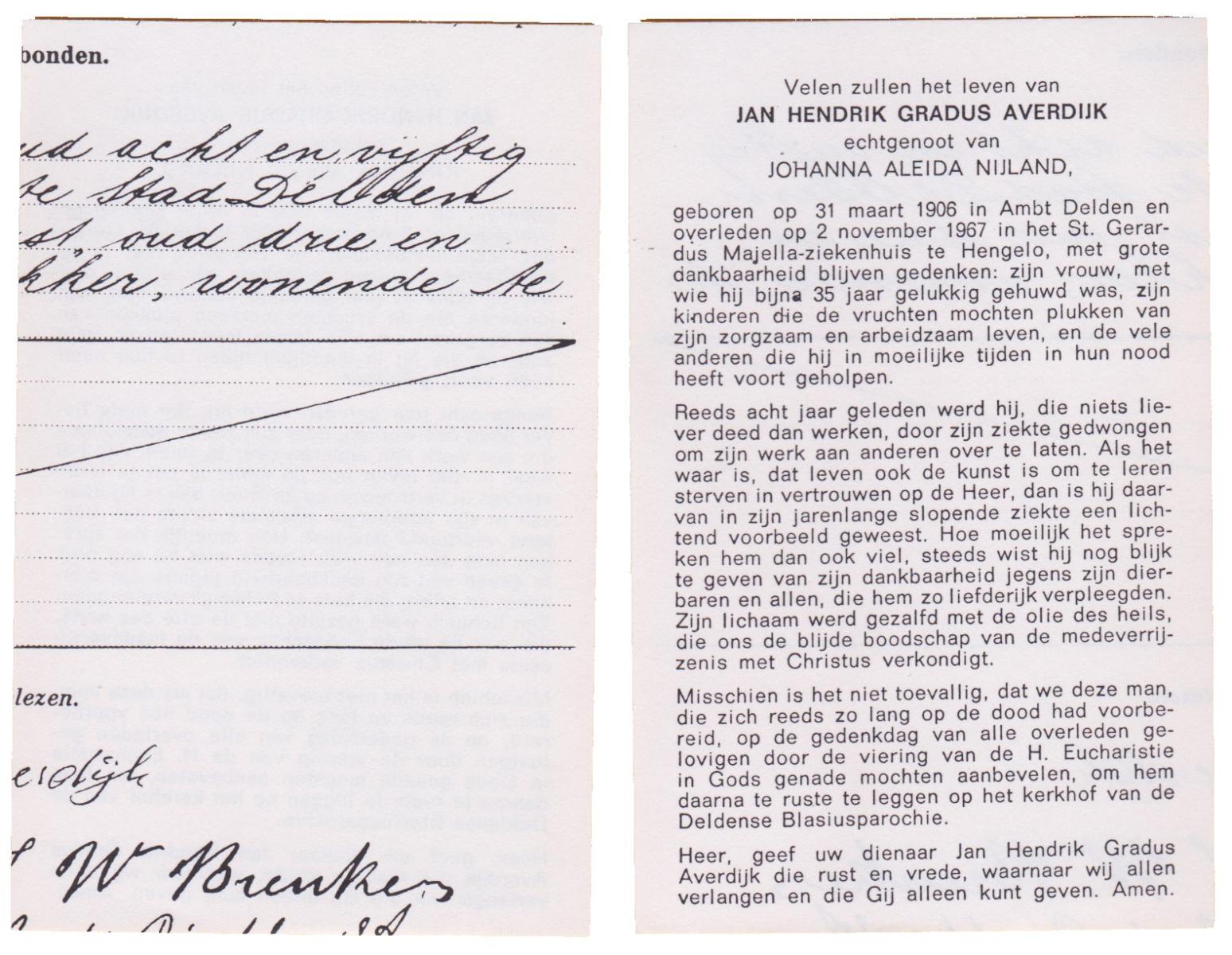 AVERDIJK, Jan Hendrik Gradus, geboren op 31-3-1906 te Delden, Ambt, overleden op 2-11-1967 te Hengelo (Ov.) op 61-jarige leeftijd, begraven te Delden.