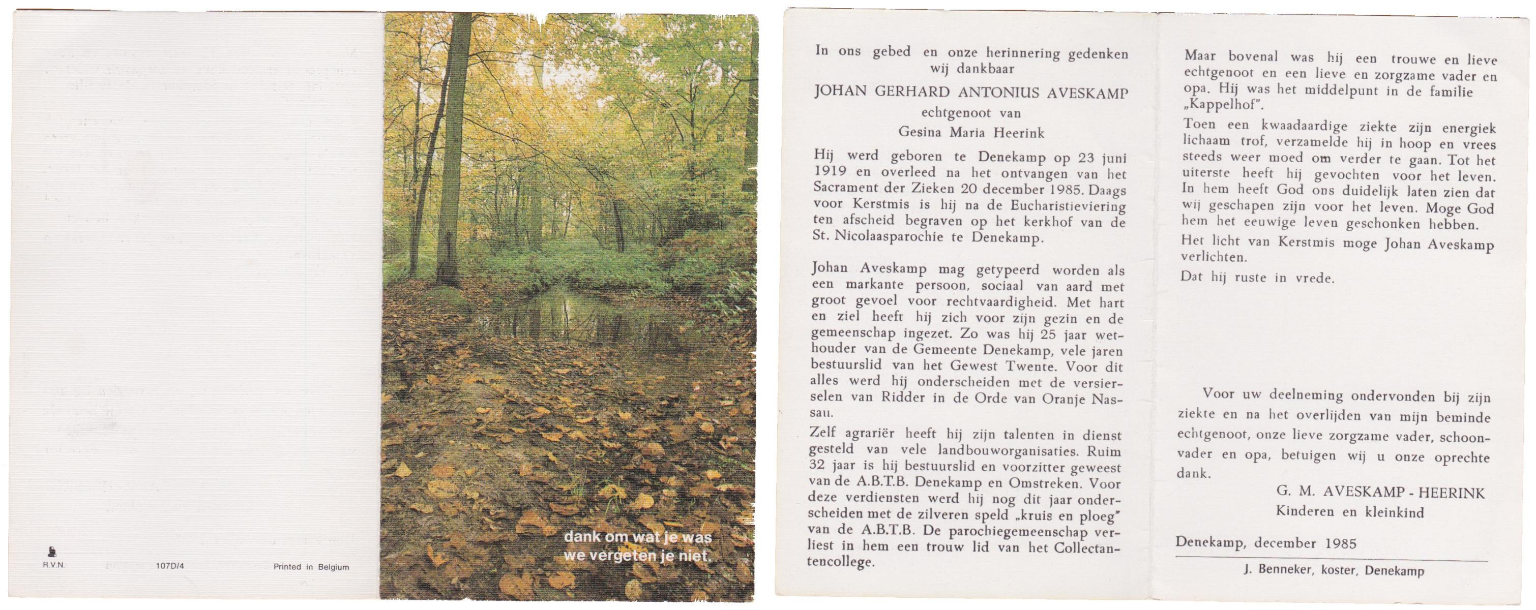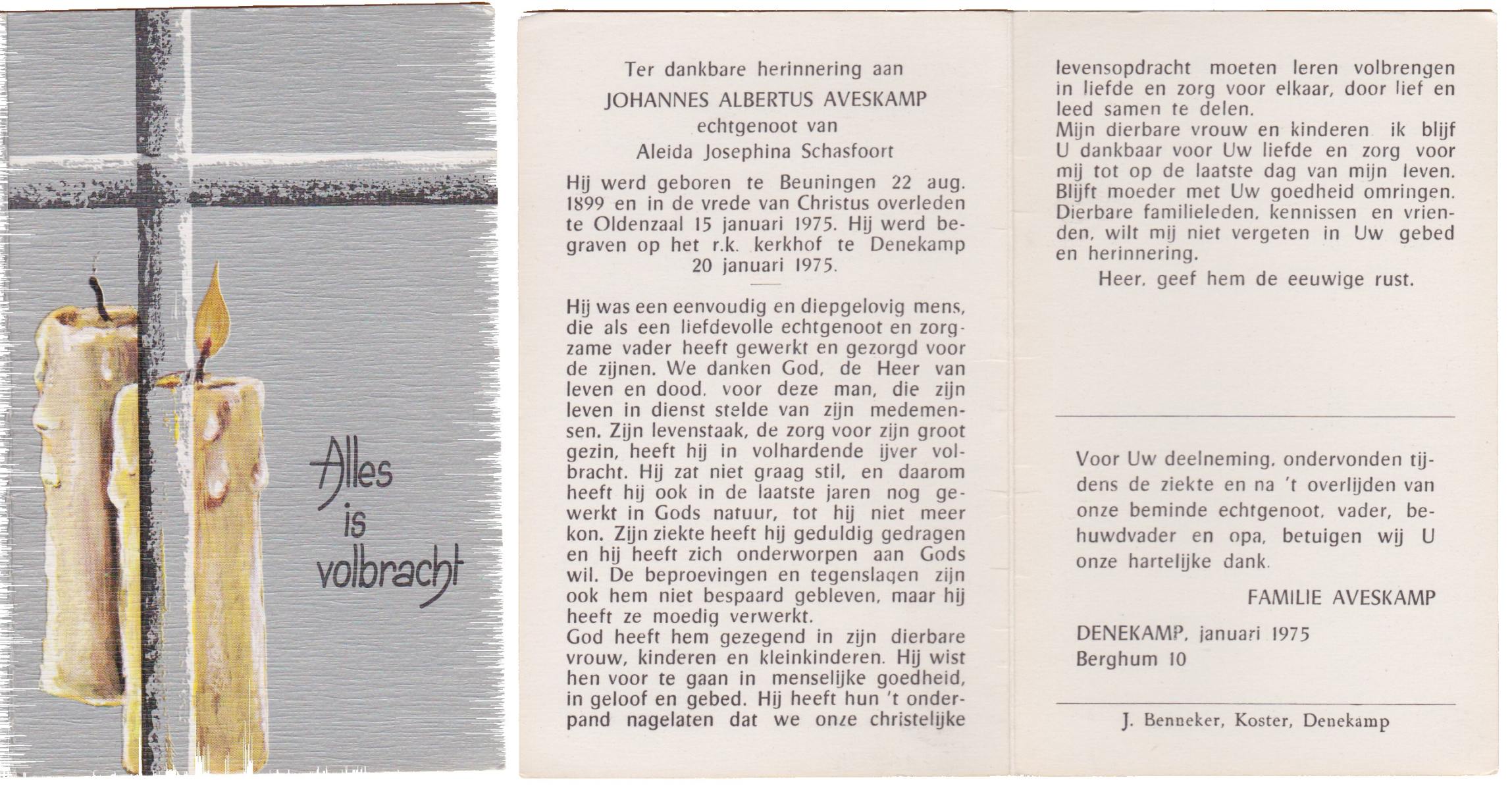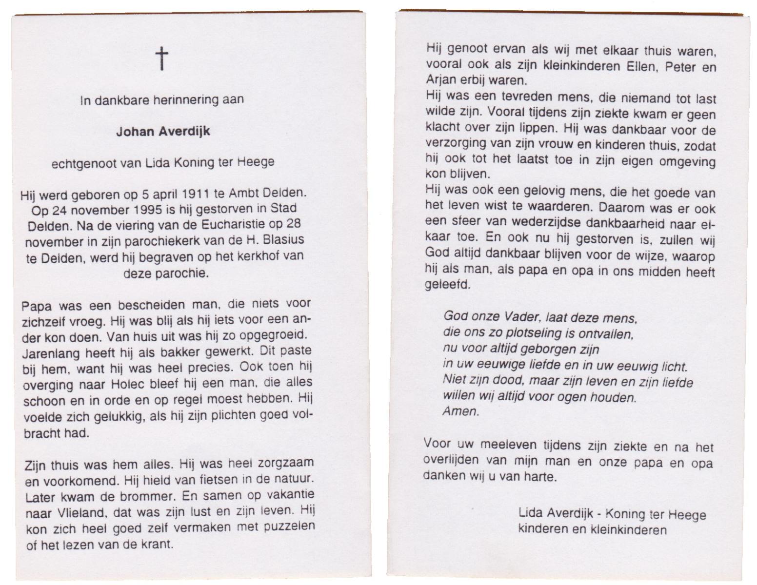 AVERDIJK, Johan, geboren op 5-4-1911 te Delden, Ambt, overleden op 24-11-1995 te Delden, Stad op 84-jarige leeftijd, begraven op 28-11-1995 te Delden.