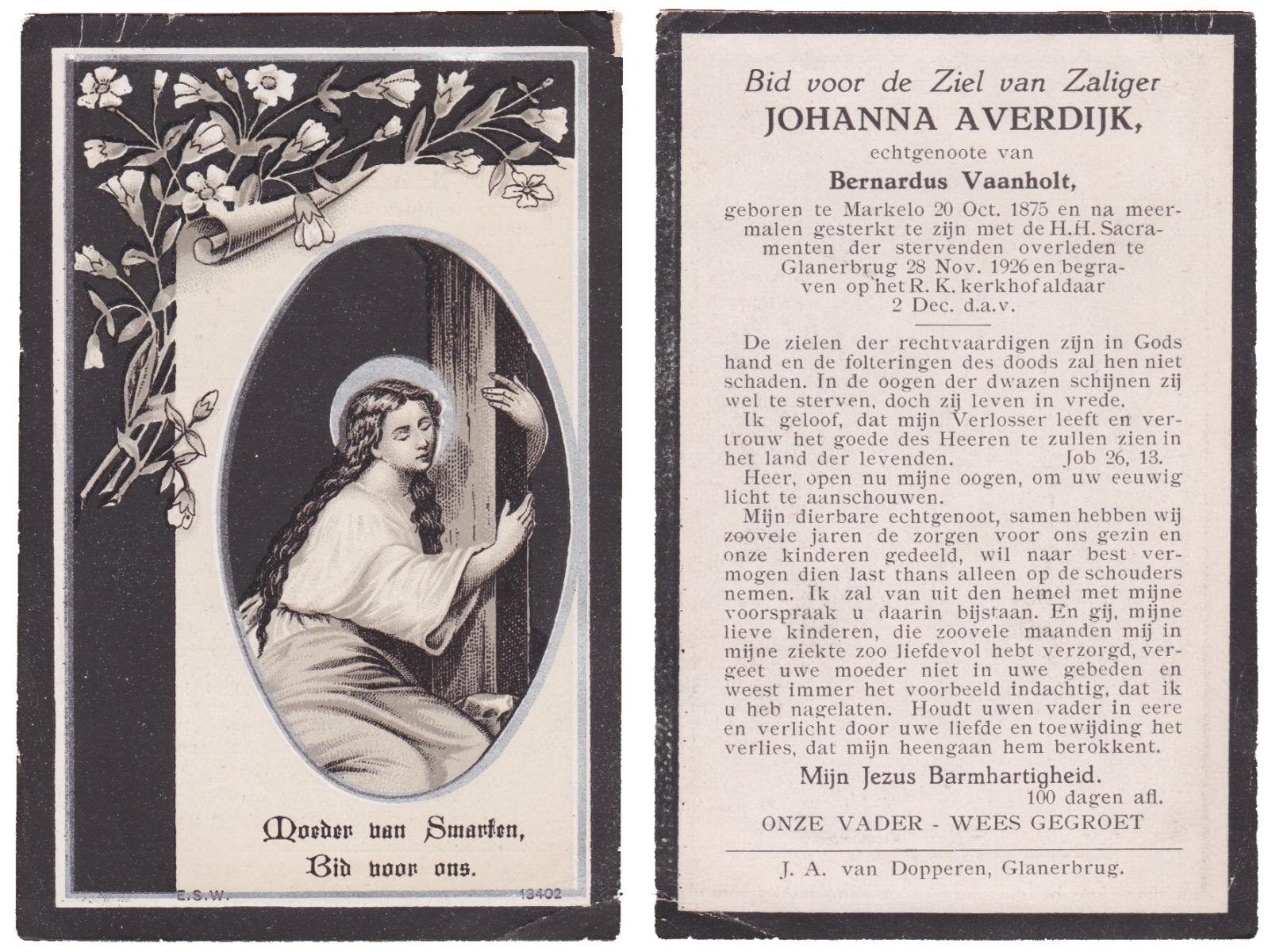 AVERDIJK, Johanna, geboren op 20-10-1875 te Markelo, overleden op 28-11-1926 te Glanerbrug op 51-jarige leeftijd, begraven op 2-12-1926 te Glanerbrug.