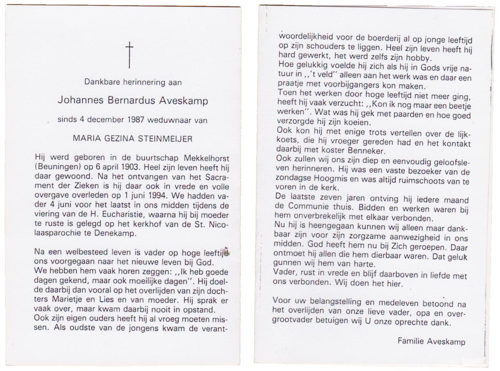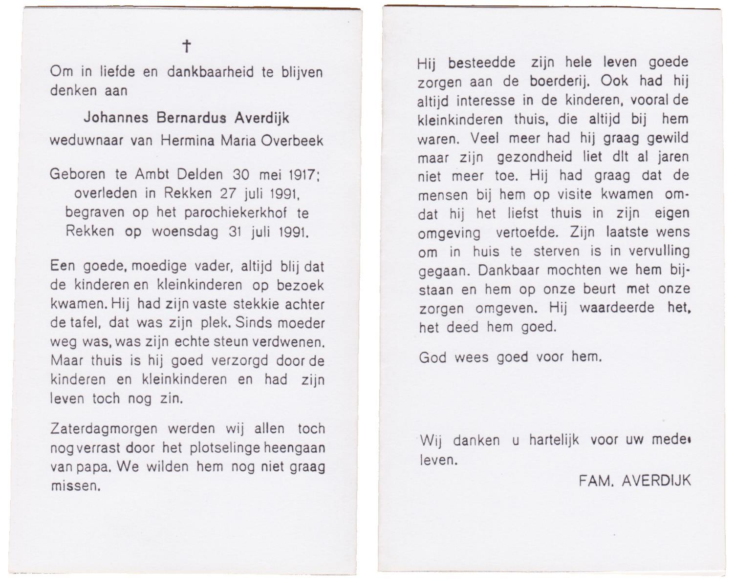 AVERDIJK, Johannes Bernardus, geboren op 30-5-1917 te Delden, Ambt, overleden op 27-7-1991 te Rekken op 74-jarige leeftijd, begraven op 31-7-1991 te Rekken.