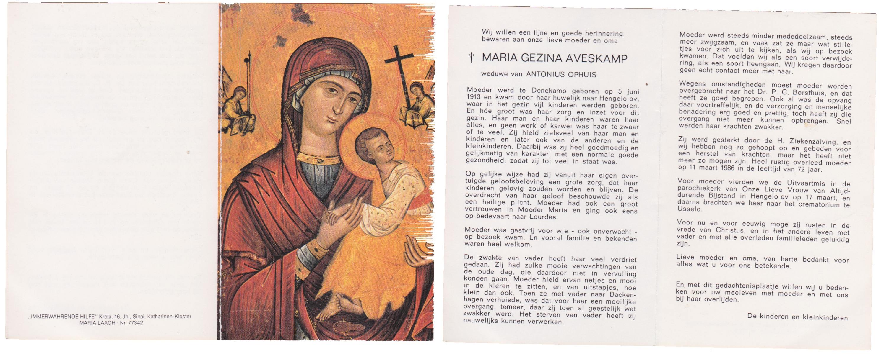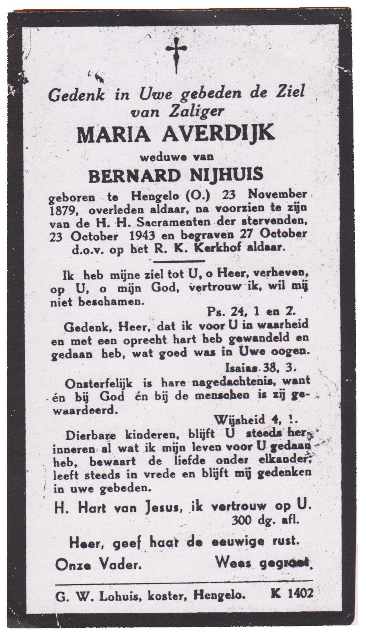 AVERDIJK, Maria, geboren op 23-11-1879 te Hengelo (O), overleden op 23-10-1943 te Hengelo (Ov.) op 63-jarige leeftijd, begraven op 27-10-1943 te Hengelo (O).