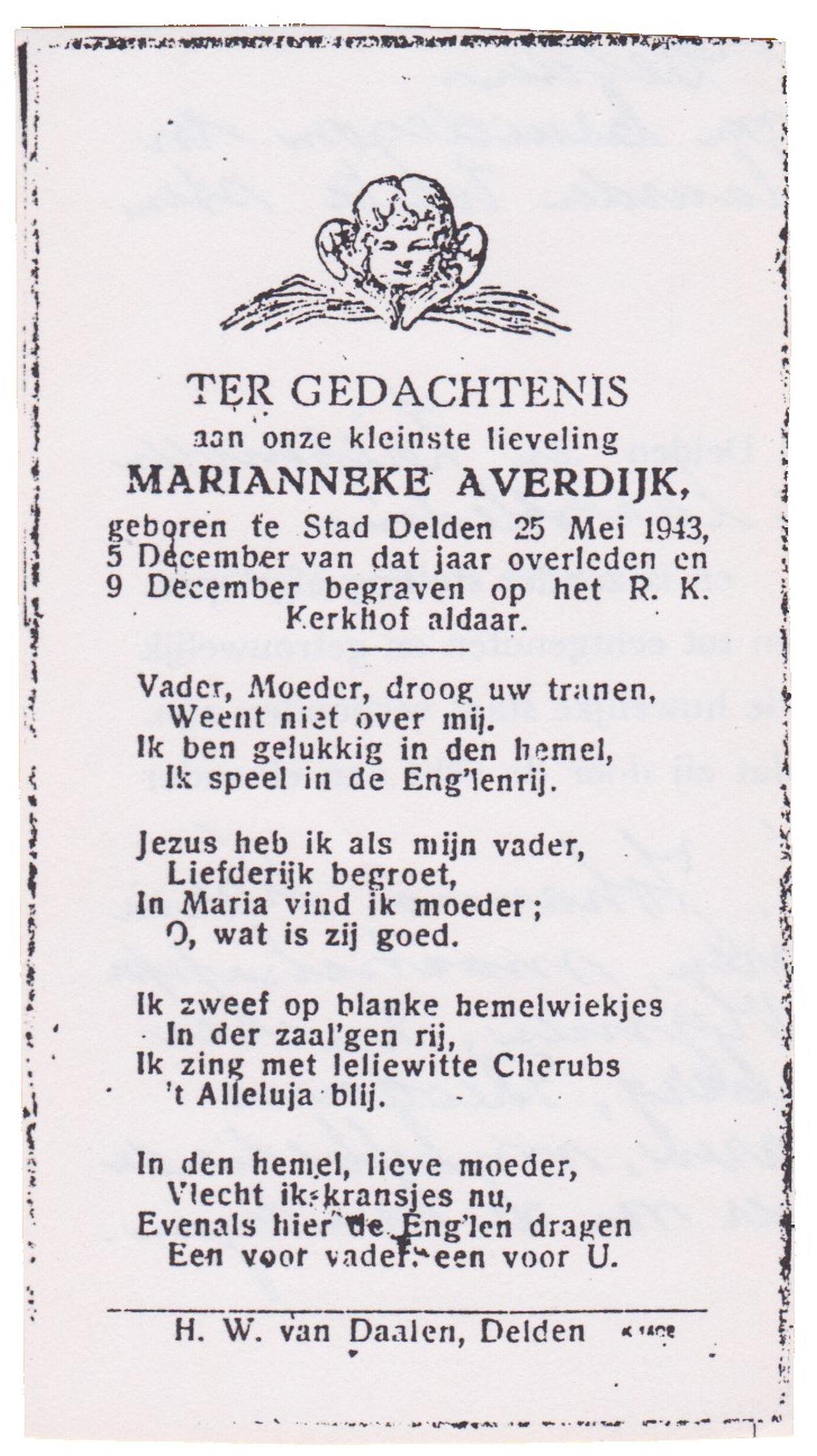 AVERDIJK, Marianneke, geboren op 25-5-1943 te Delden, Stad, overleden op 5-12-1943 te Delden, Stad op 0-jarige leeftijd, begraven op 9-12-1943 te Delden.