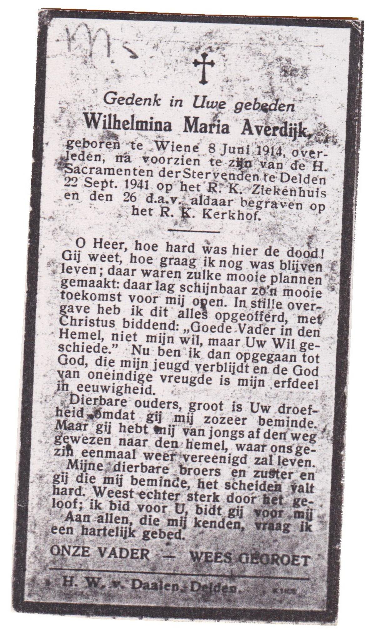 AVERDIJK, Wilhelmina Maria, geboren op 8-6-1914 te Wiene, overleden op 22-9-1941 te Delden op 27-jarige leeftijd, begraven op 26-9-1941 te Delden.