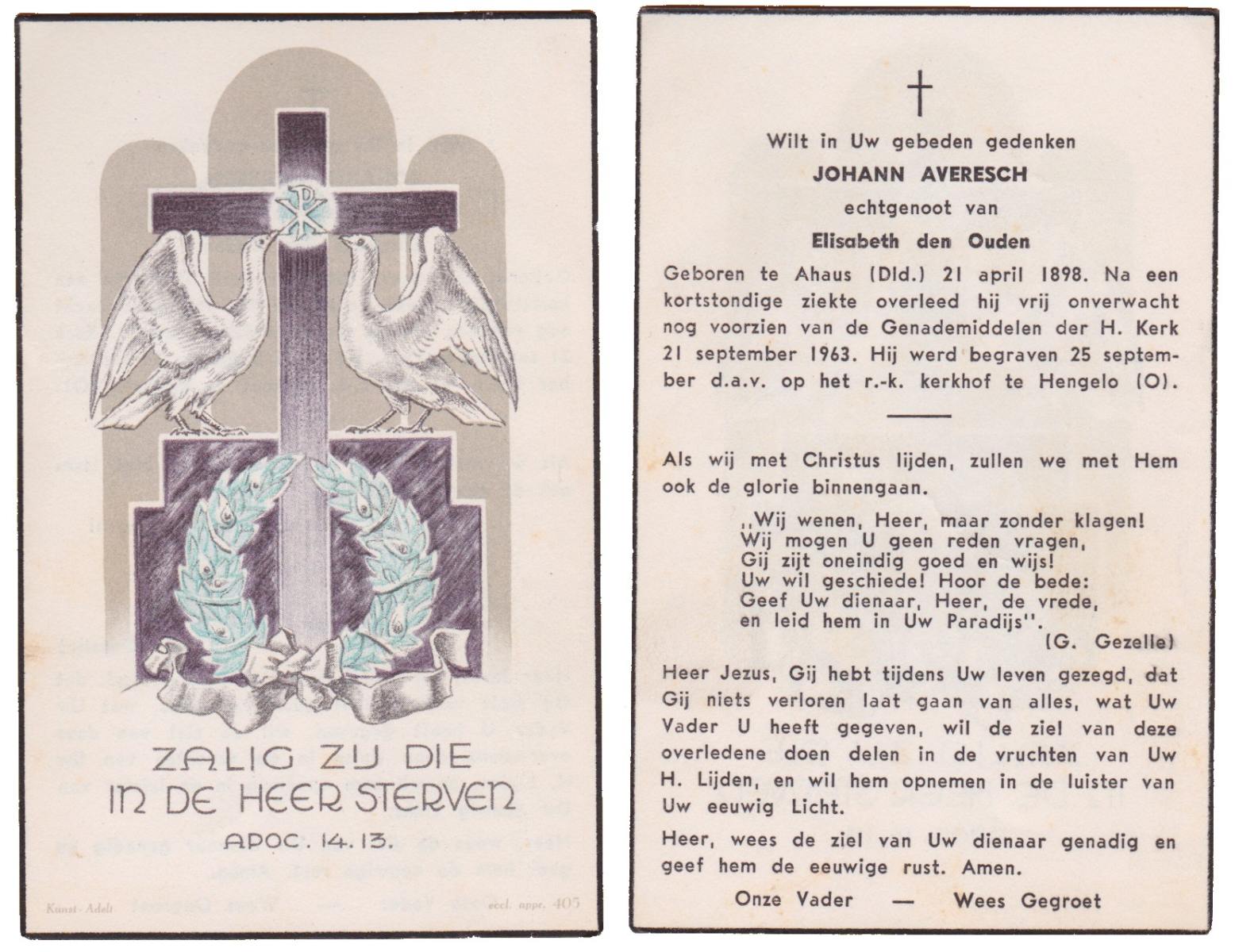 AVERESCH, Johann, geboren op 21-04-1898 te Ahaus (D), overleden op 21-9-1963 op 65-jarige leeftijd, gecremeerd op 25-9-1963 te Hengelo.