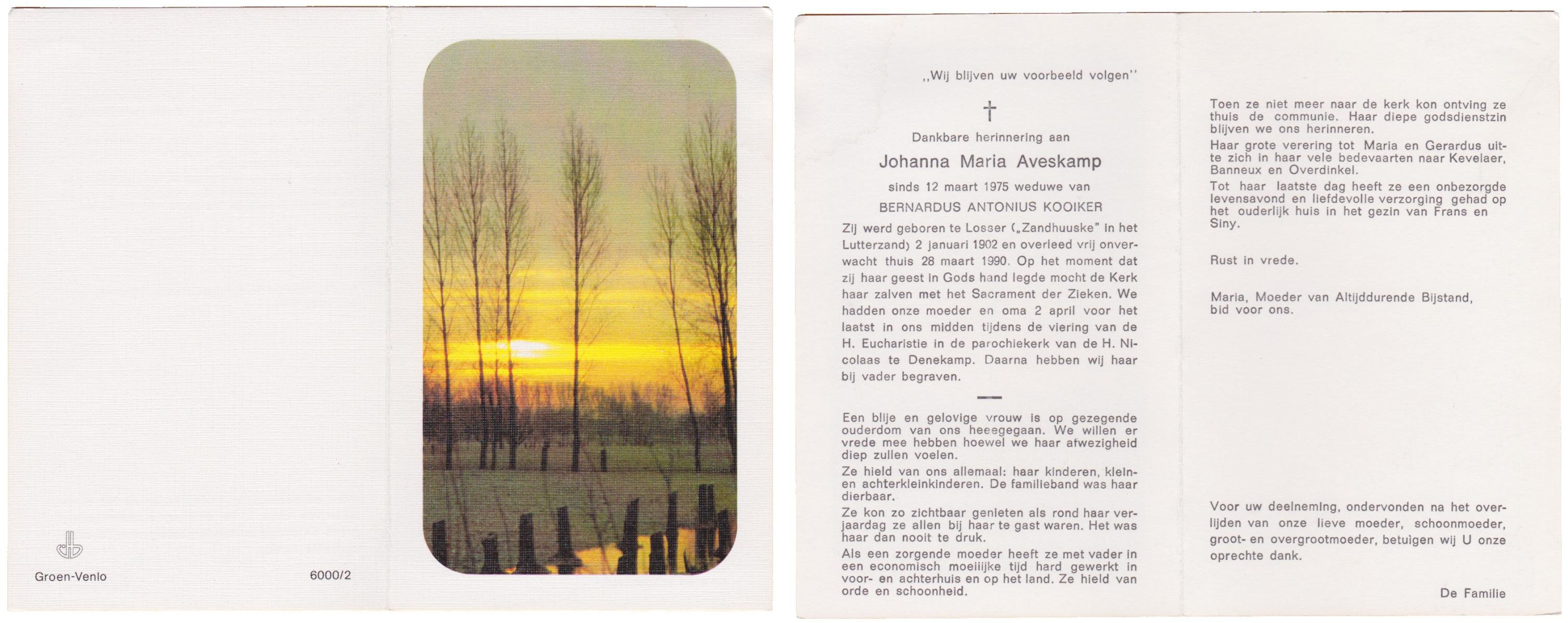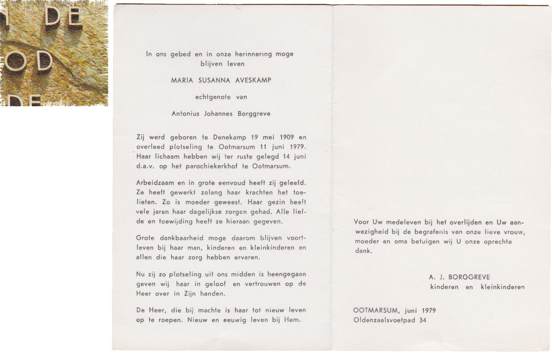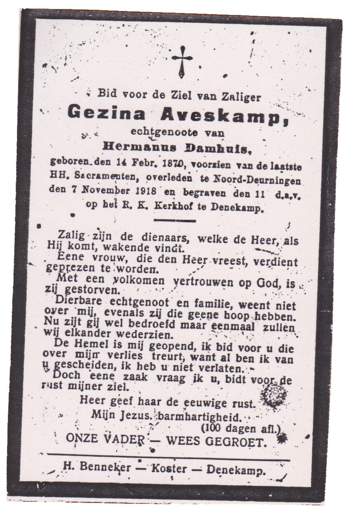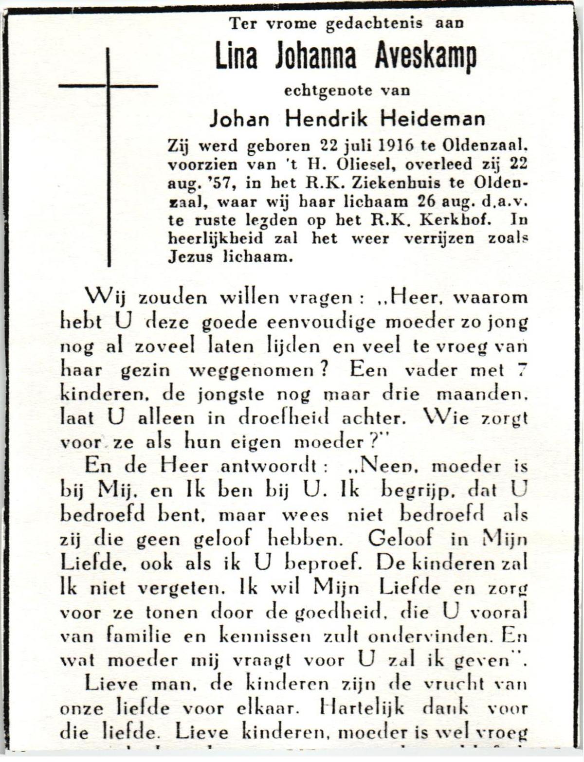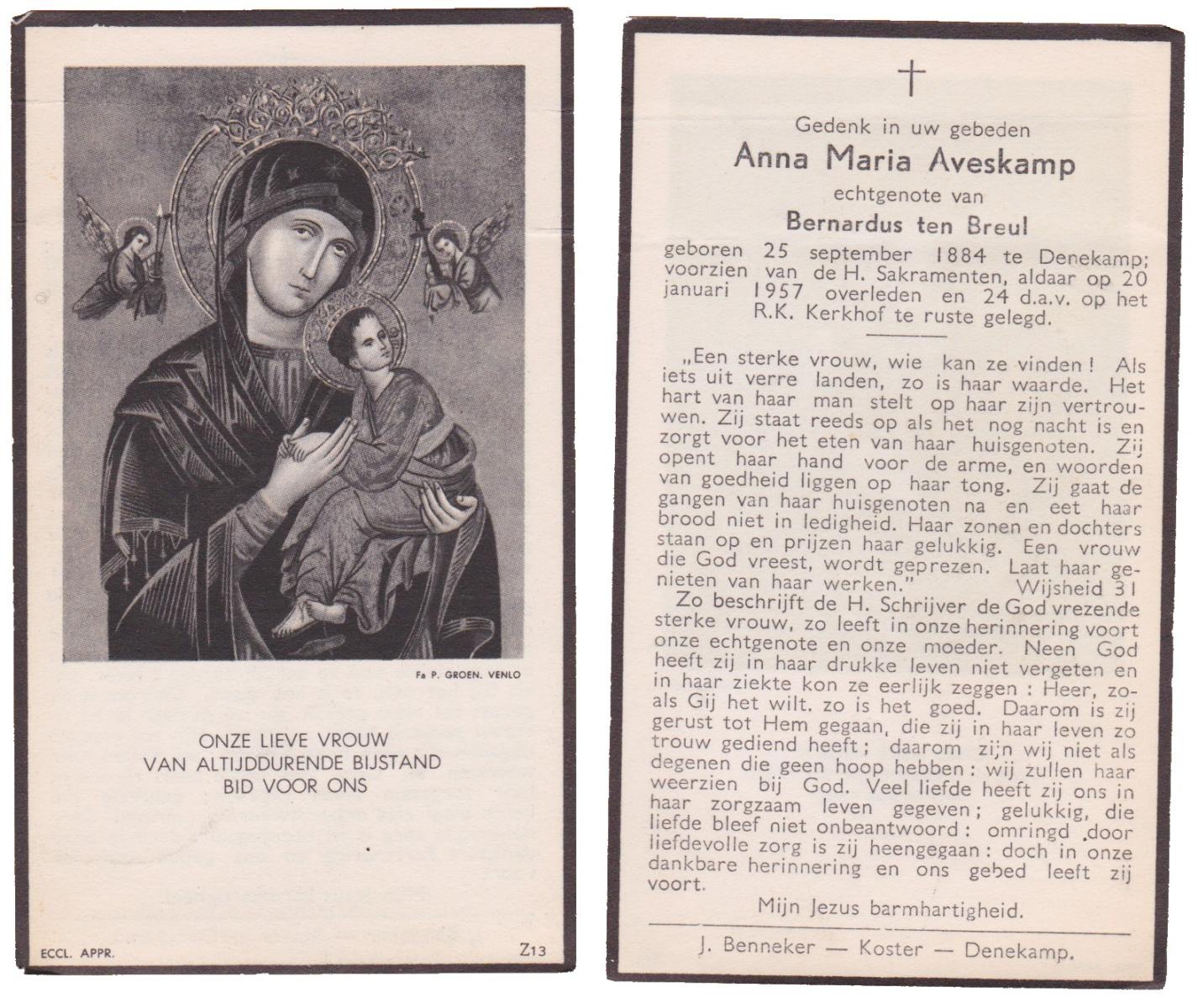 AVESKAMP, Anna Maria, geboren op 25-09-1884 te Denekamp, overleden op 20-1-1957 te Denekamp op 72-jarige leeftijd, begraven op 24-1-1957 te Denekamp.