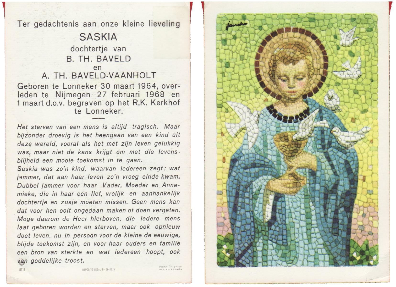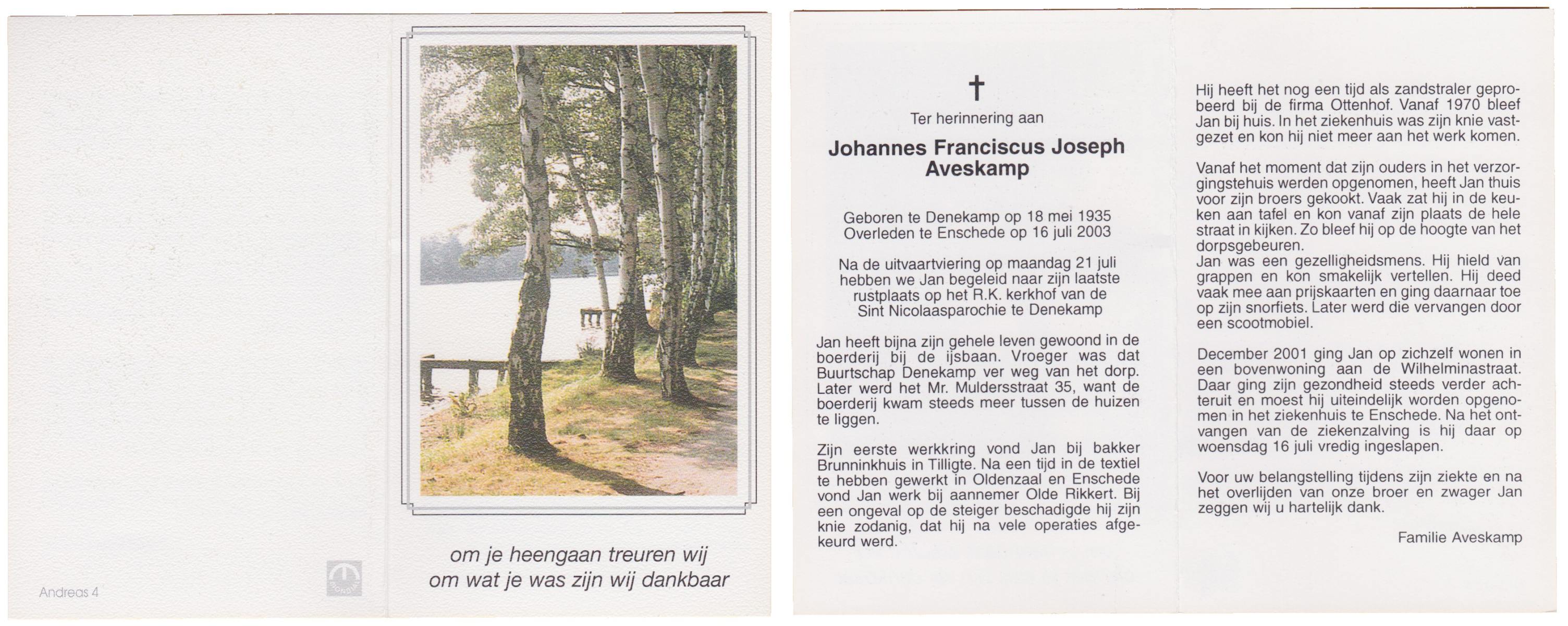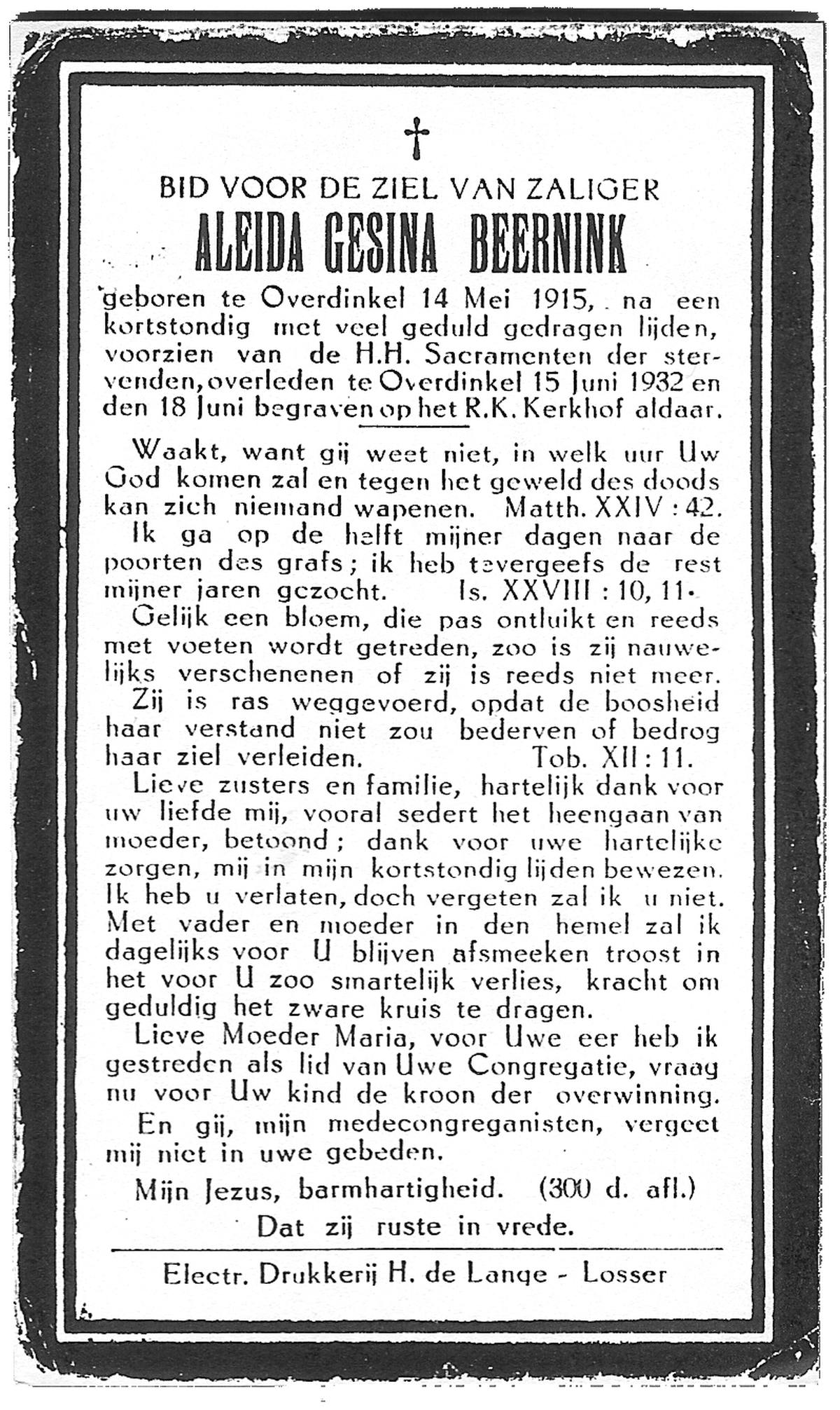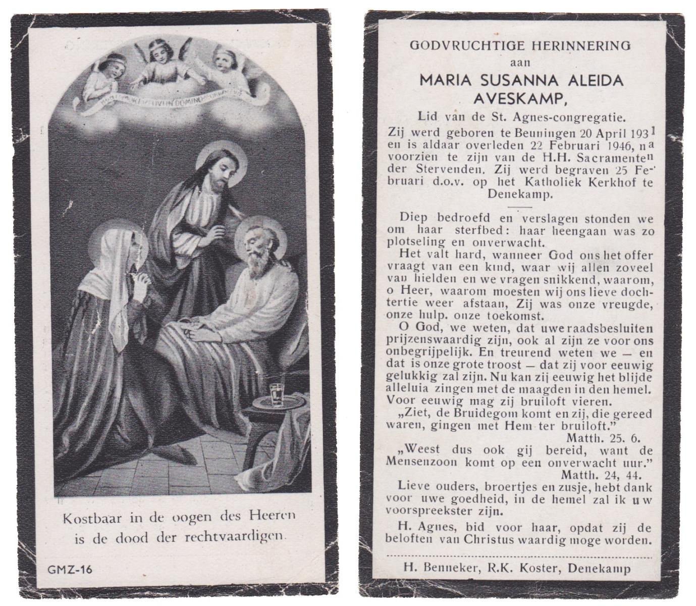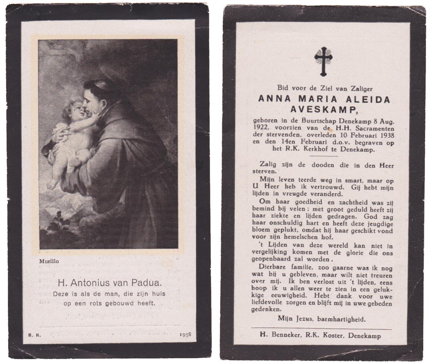 AVESKAMP, Anna Maria Aleida, geboren op 8-8-1922 te Denekamp, overleden op 10-2-1938 op 15-jarige leeftijd, begraven op 14-2-1938 te Denekamp.