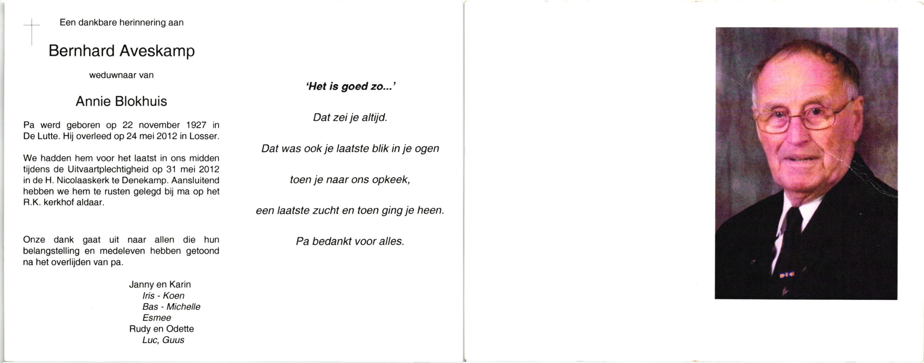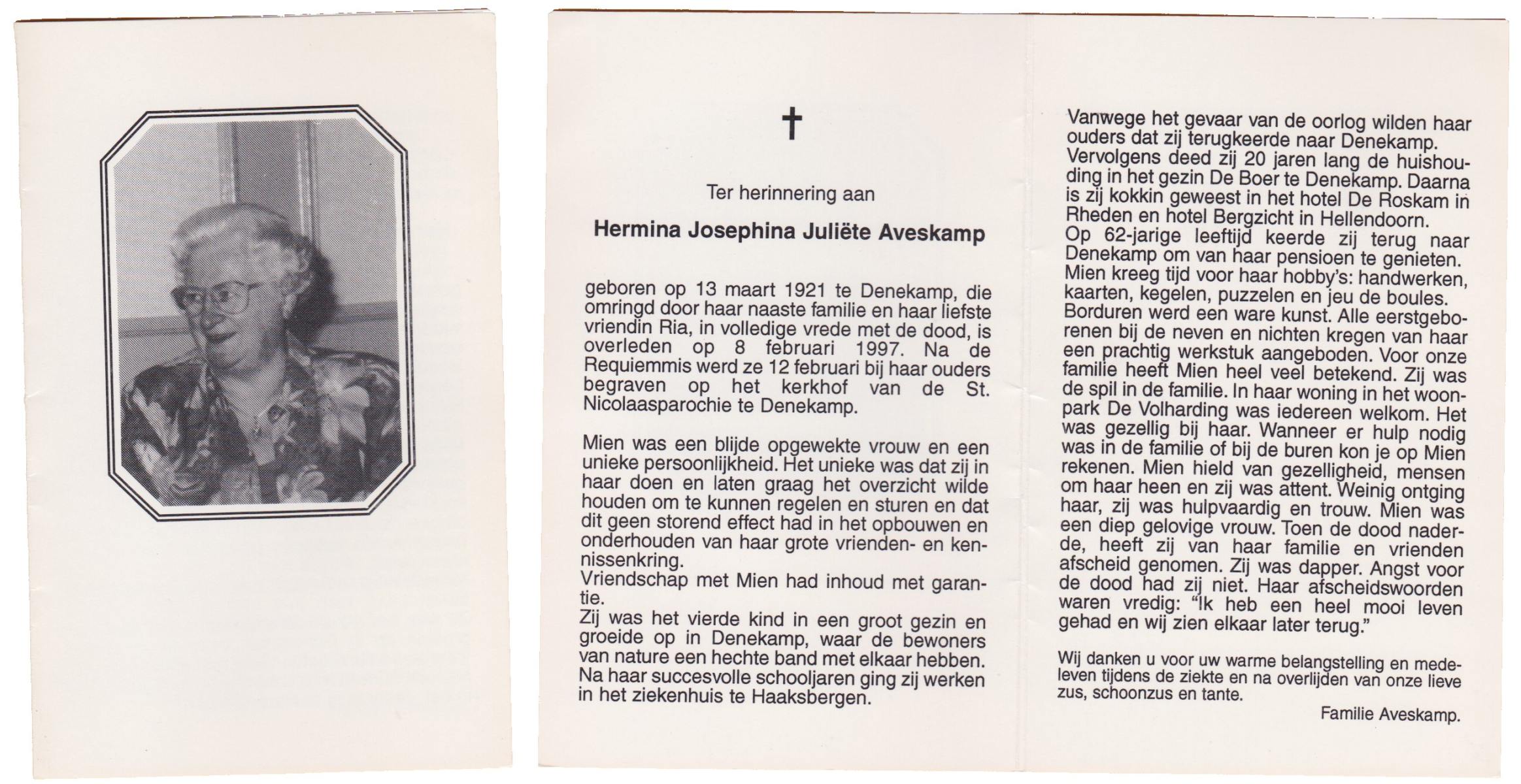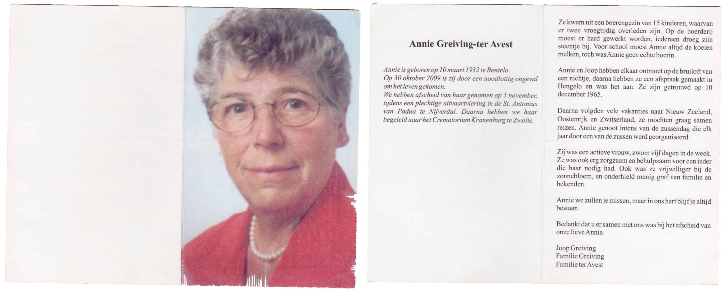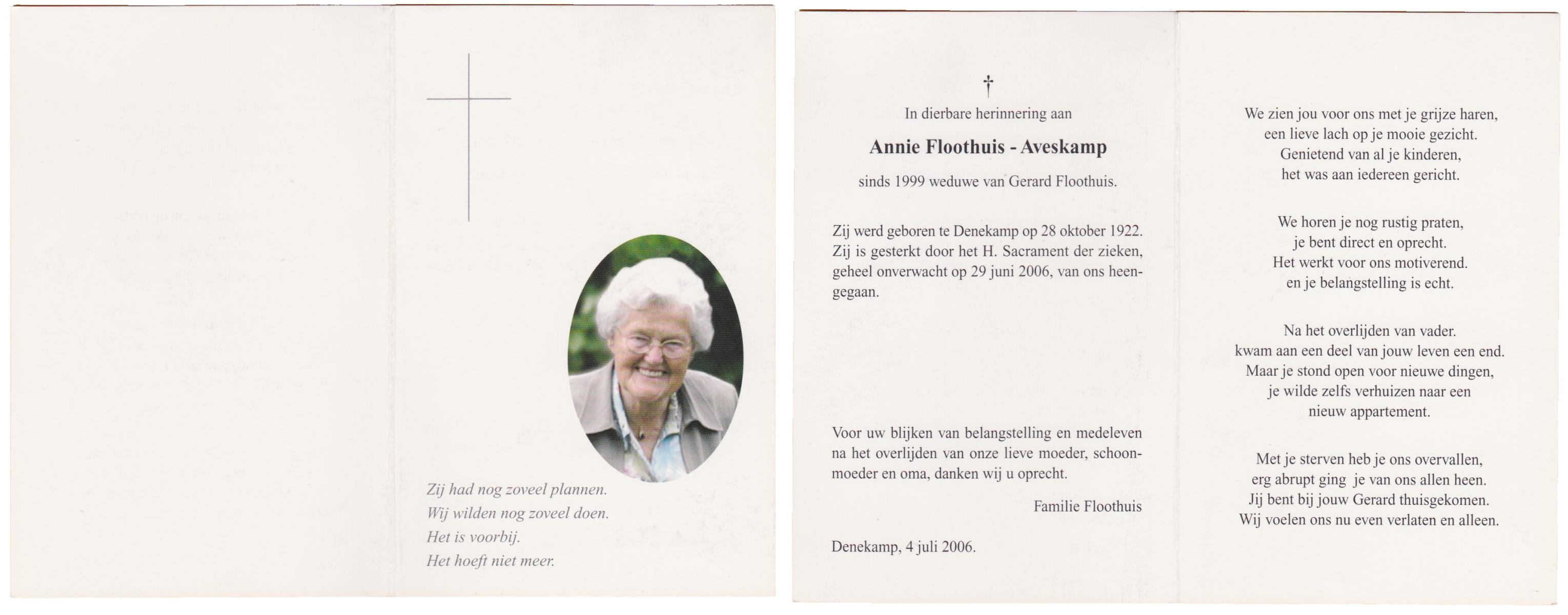 AVESKAMP, Annie, geboren op 28-10-1922 te Denekamp, overleden op 29-6-2006 op 83-jarige leeftijd.