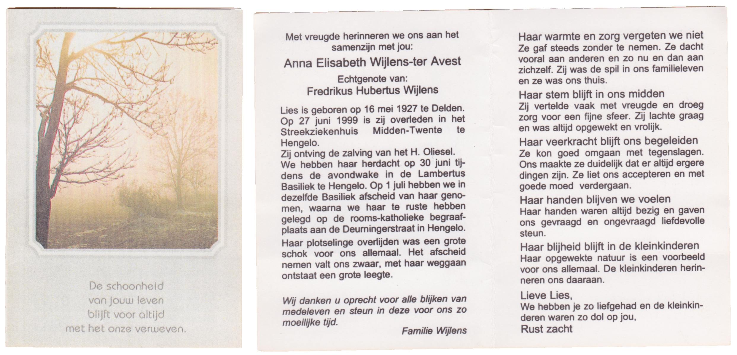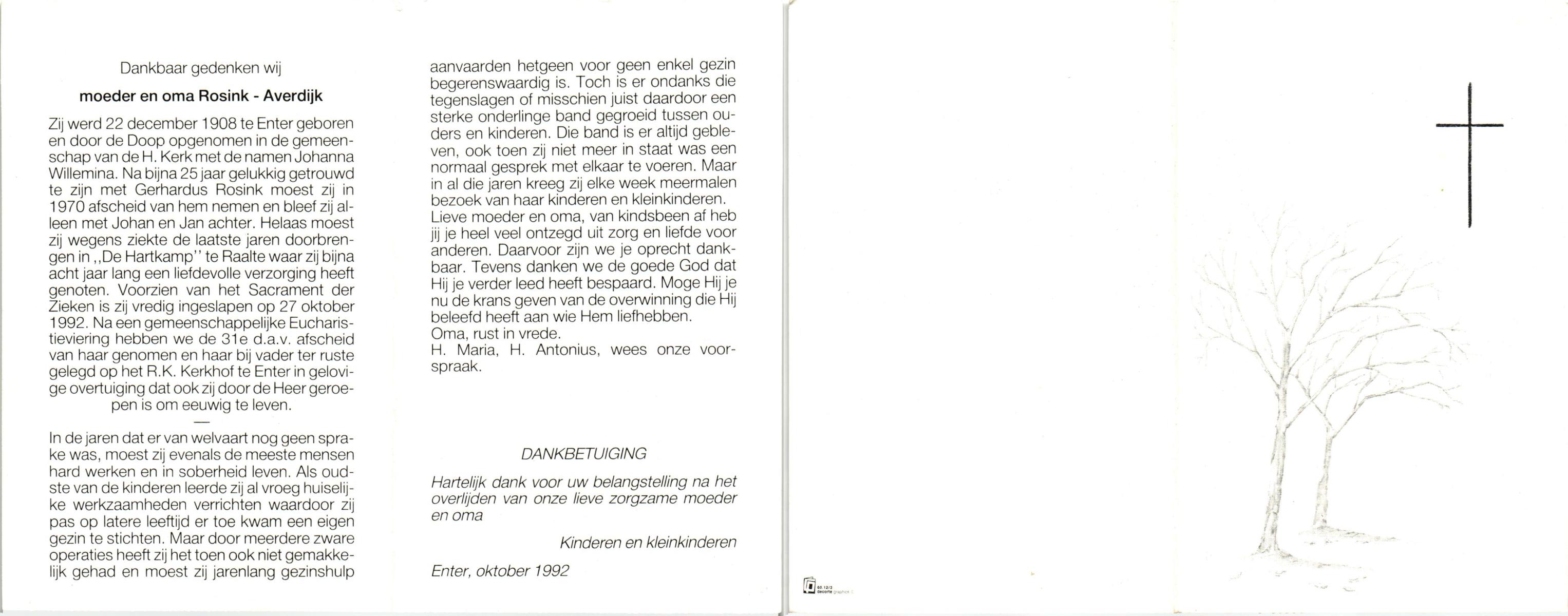 AVERDIJK, Johanna Willemina, geboren op 22-12-1908 te Wierden, Enter, overleden op 27-10-1992 te Raalte op 83-jarige leeftijd, begraven op 31-10-1992 te Wierden, Enter.