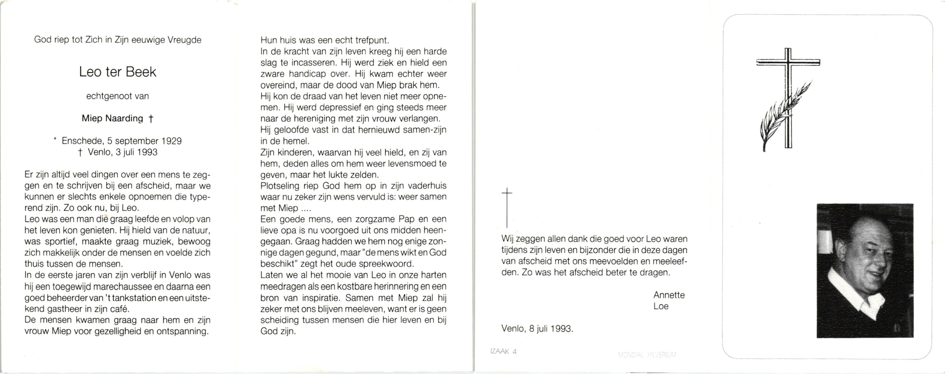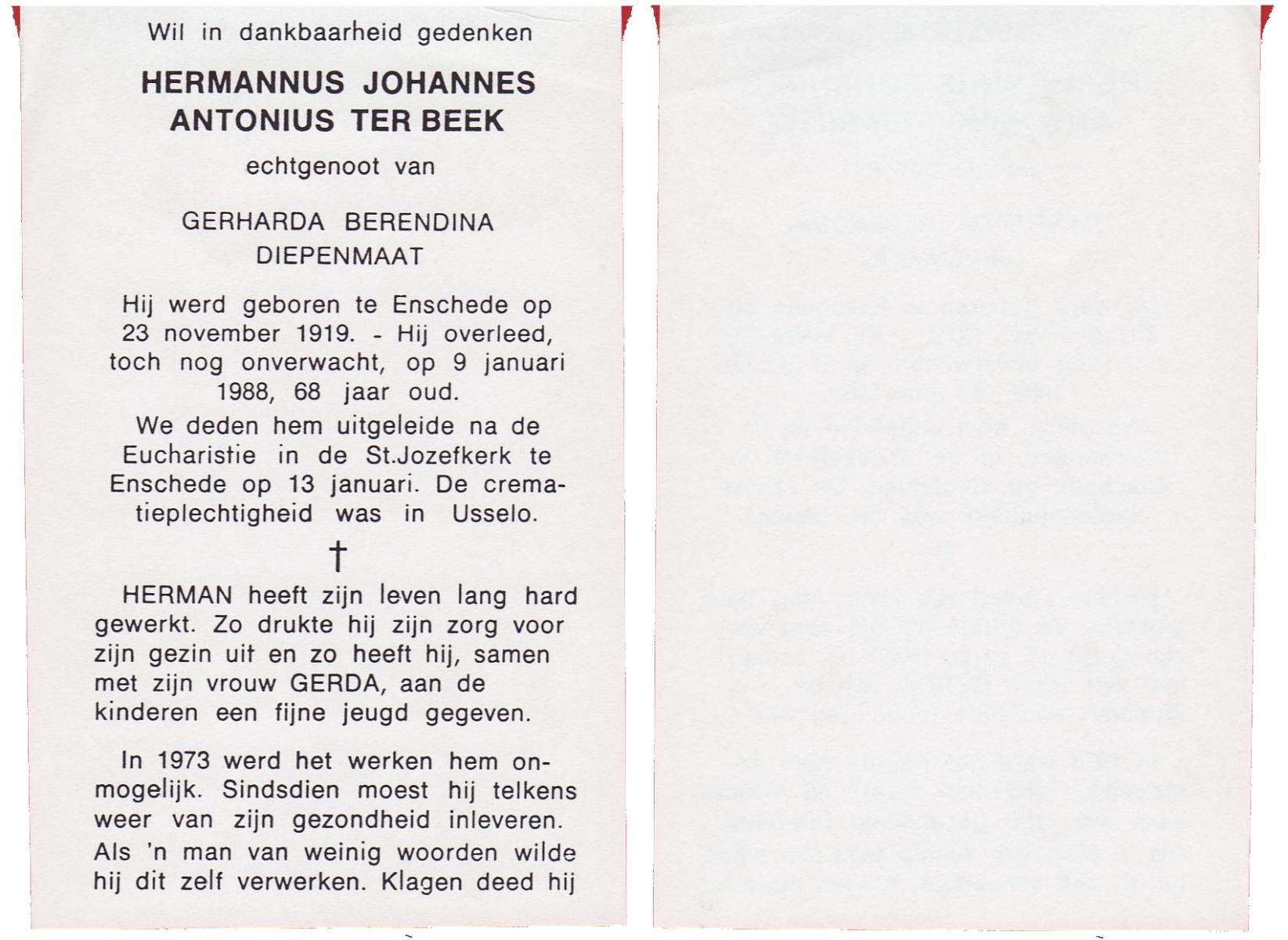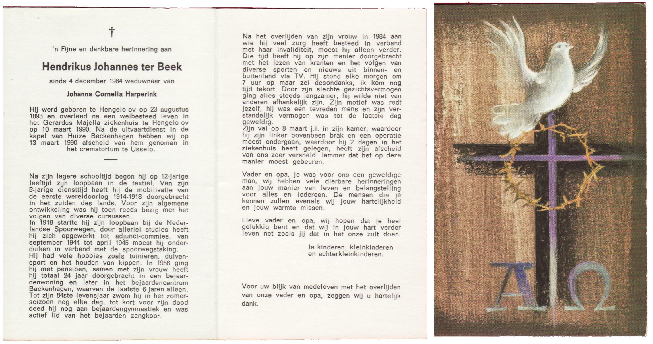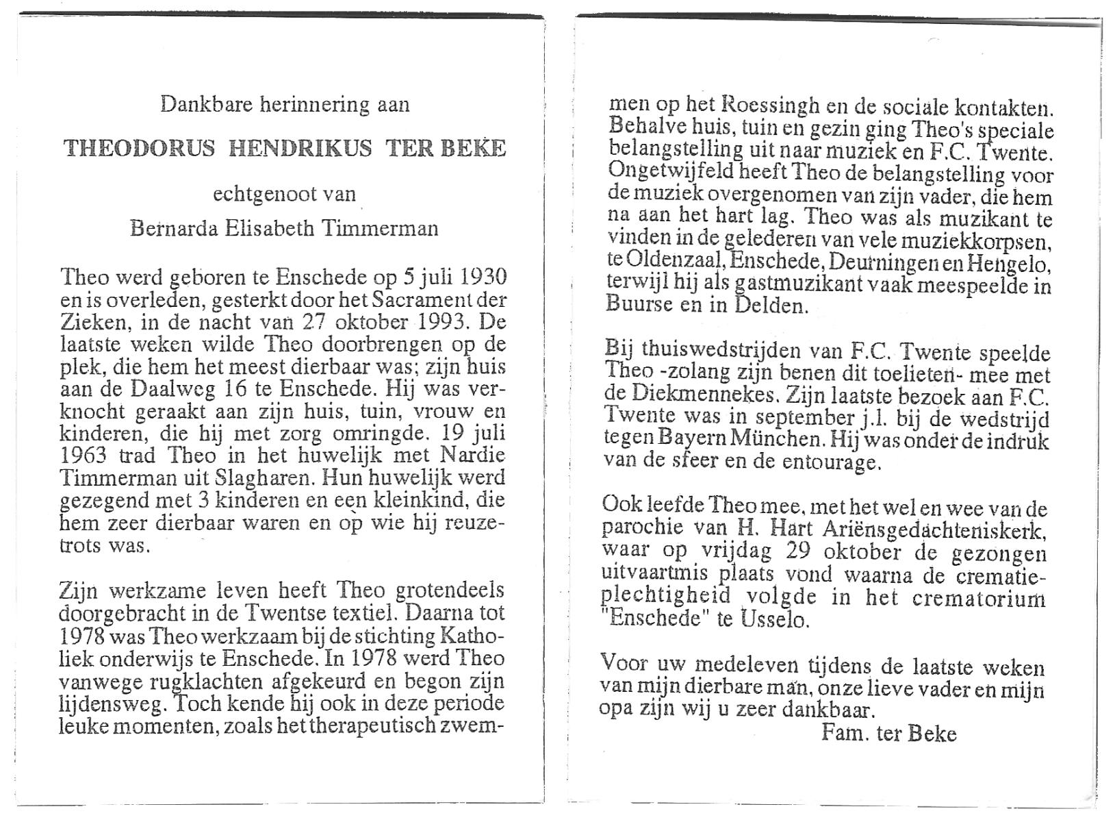 BEKE, ter, Theodorus Hendrikus, geboren op 5-7-1930 te Enschede, overleden op 27-10-1993 te Enschede op 63-jarige leeftijd, gecremeerd op 29-10-1993 te Usselo.