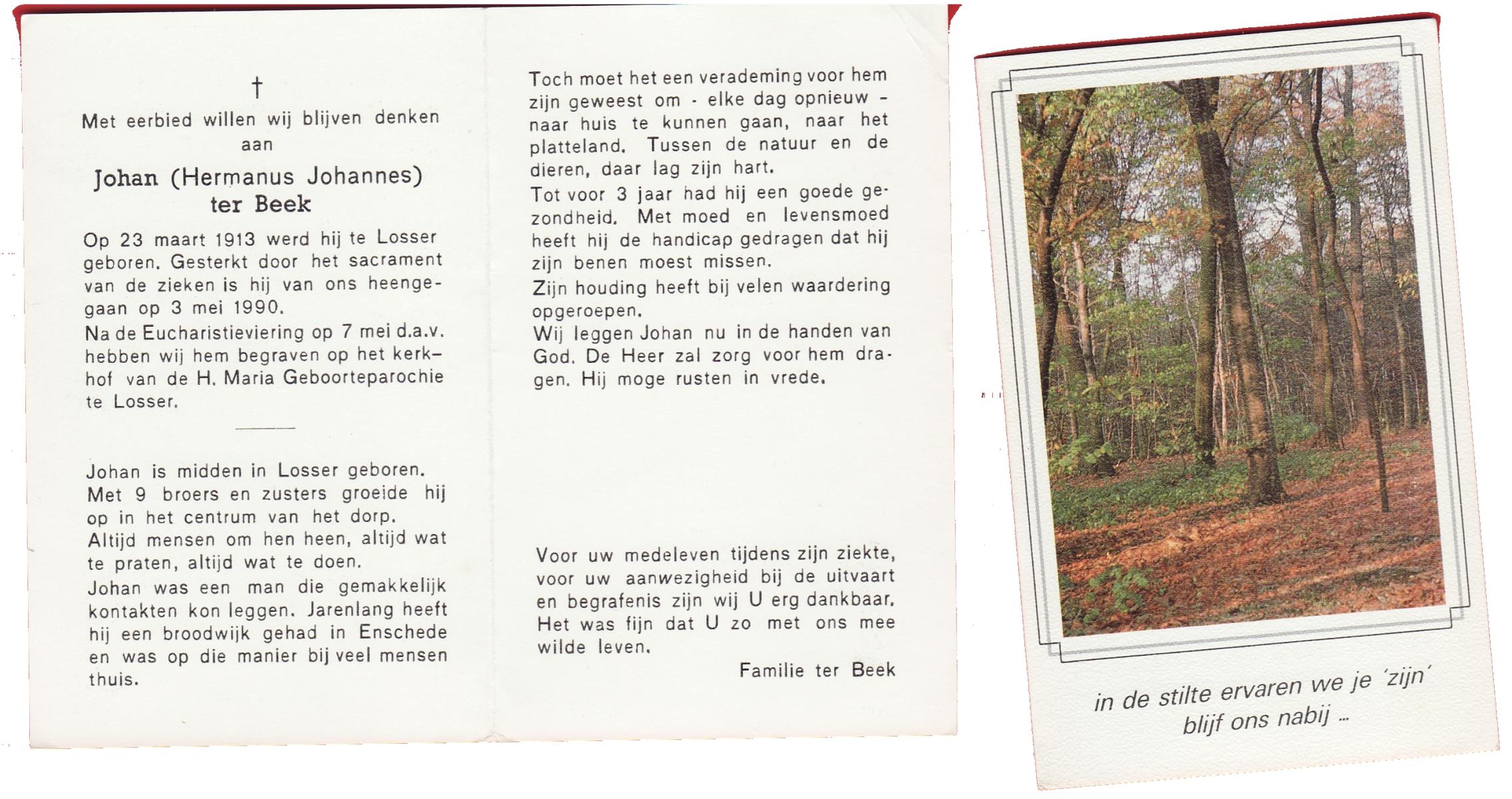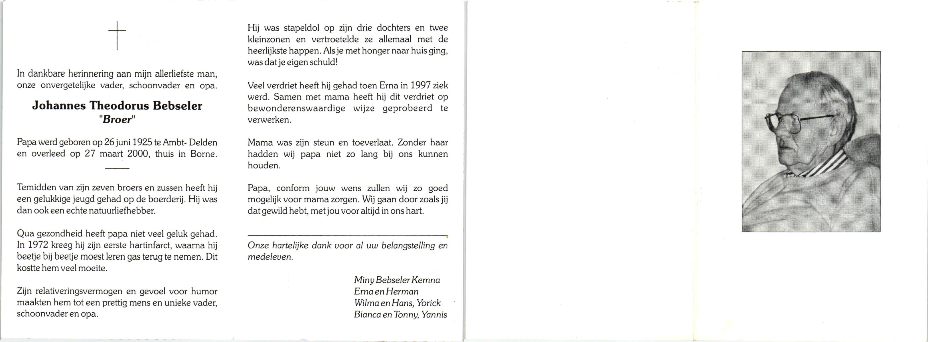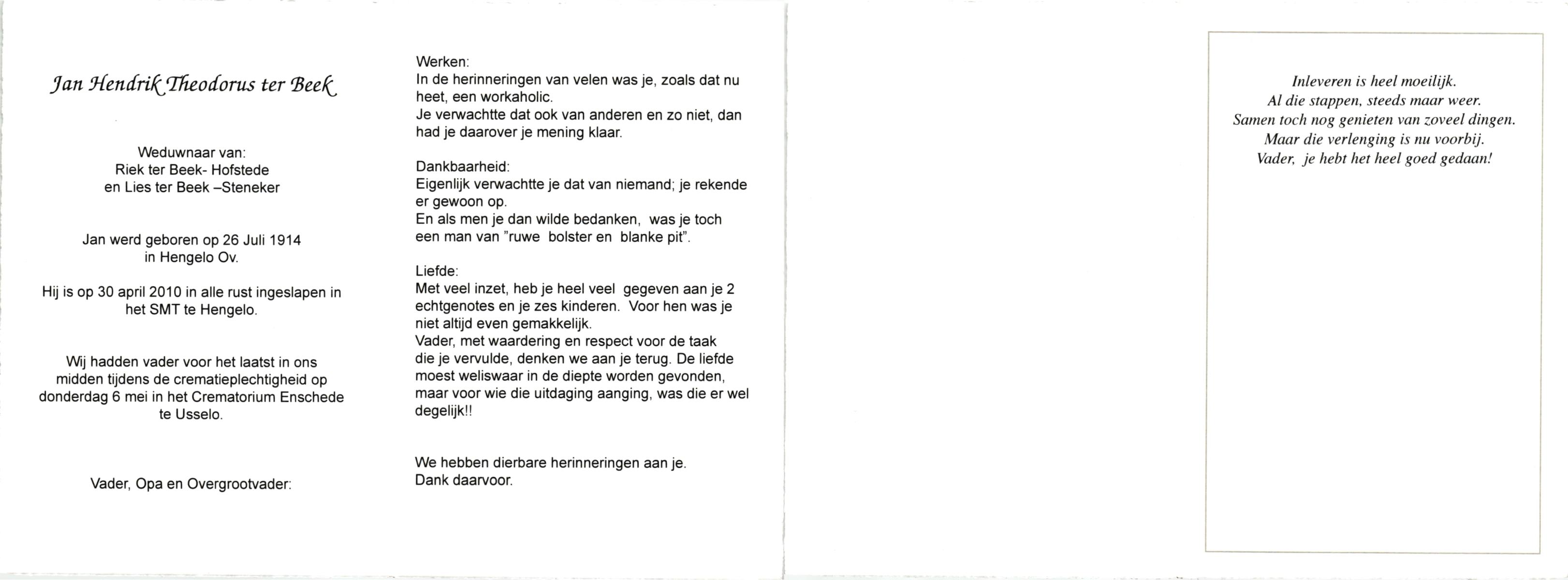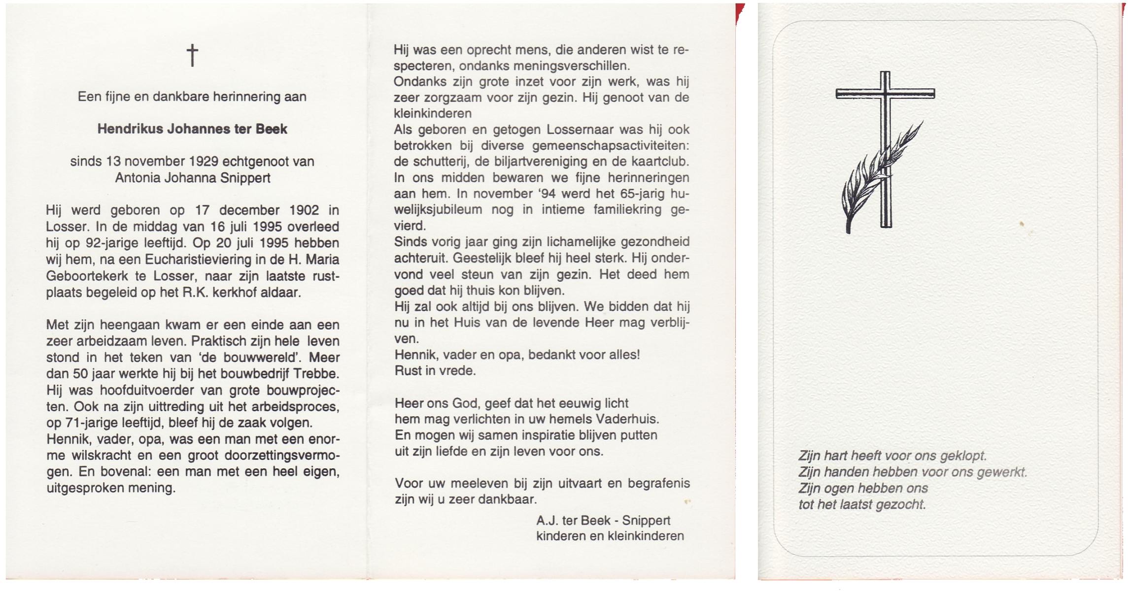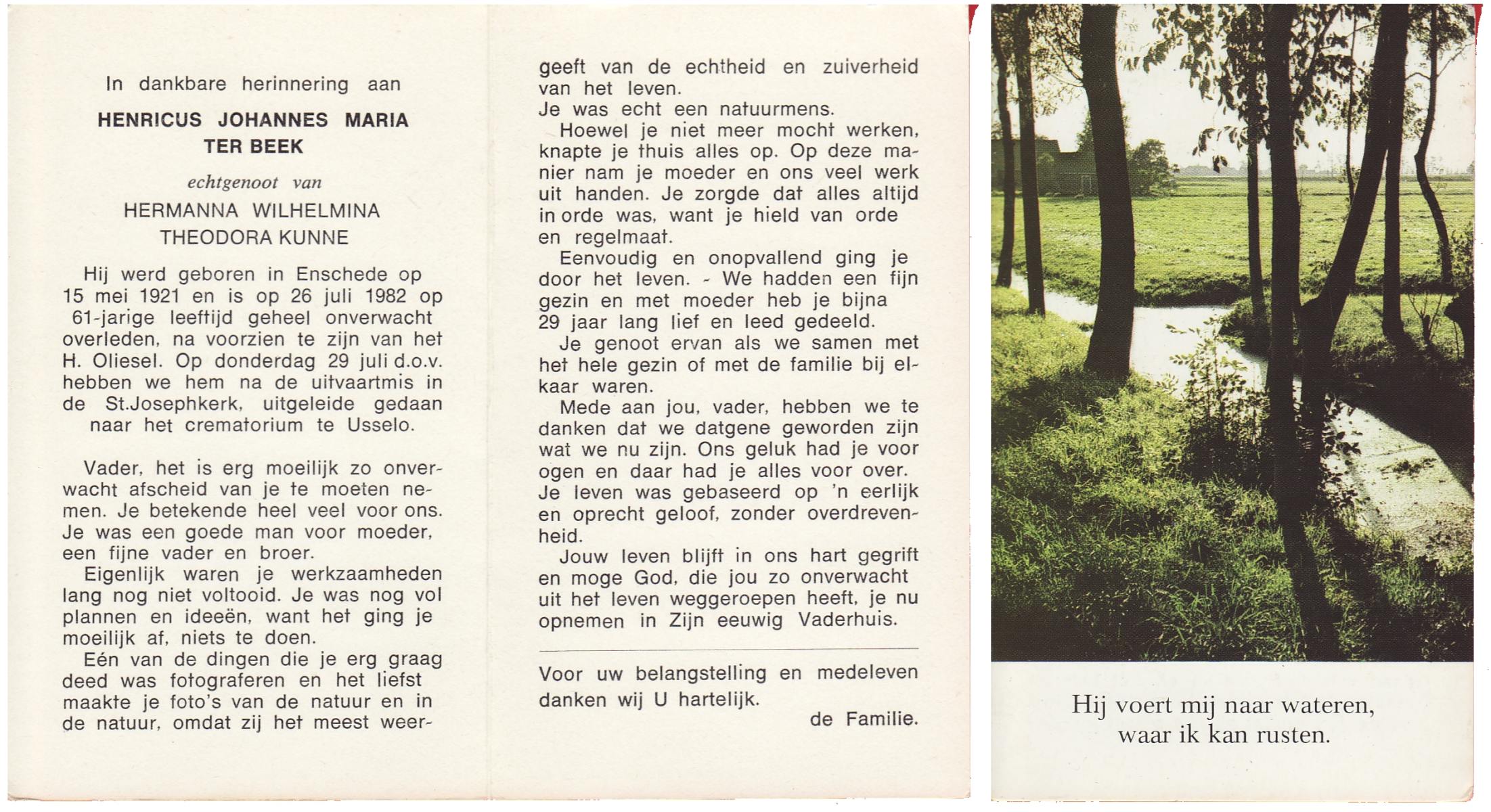 BEKE, ter, Theodorus Hendrikus, geboren op 5-7-1930 te Enschede, overleden op 27-10-1993 te Enschede op 63-jarige leeftijd, gecremeerd op 29-10-1993 te Usselo.
