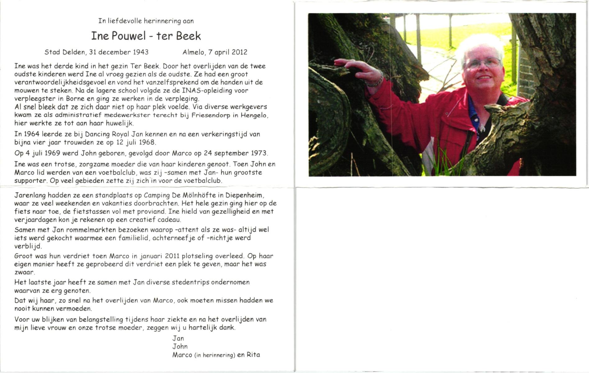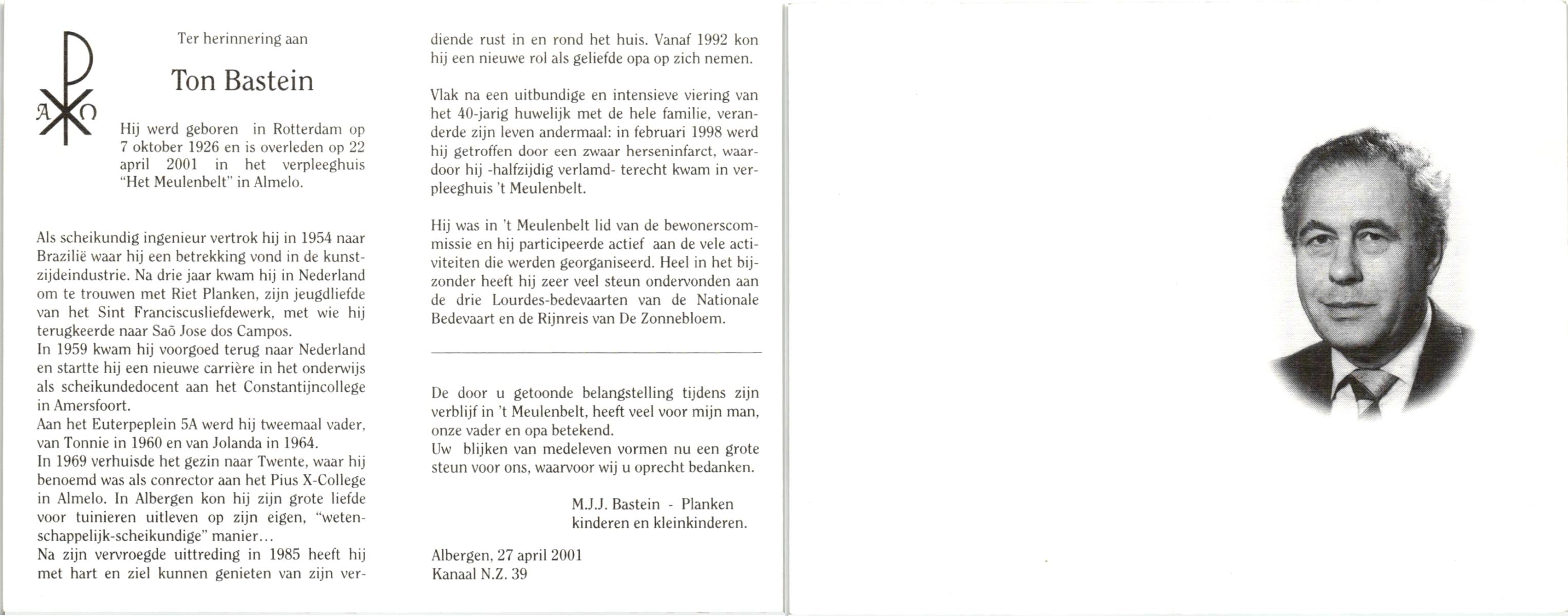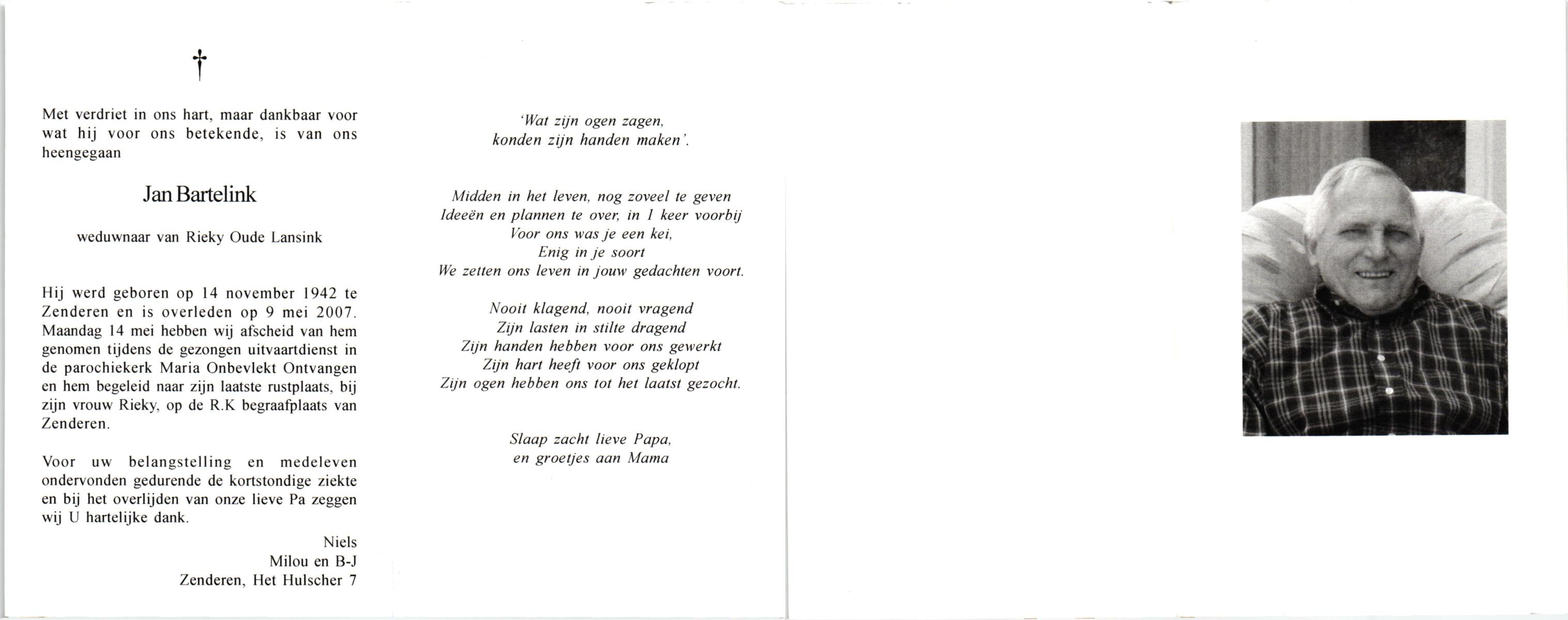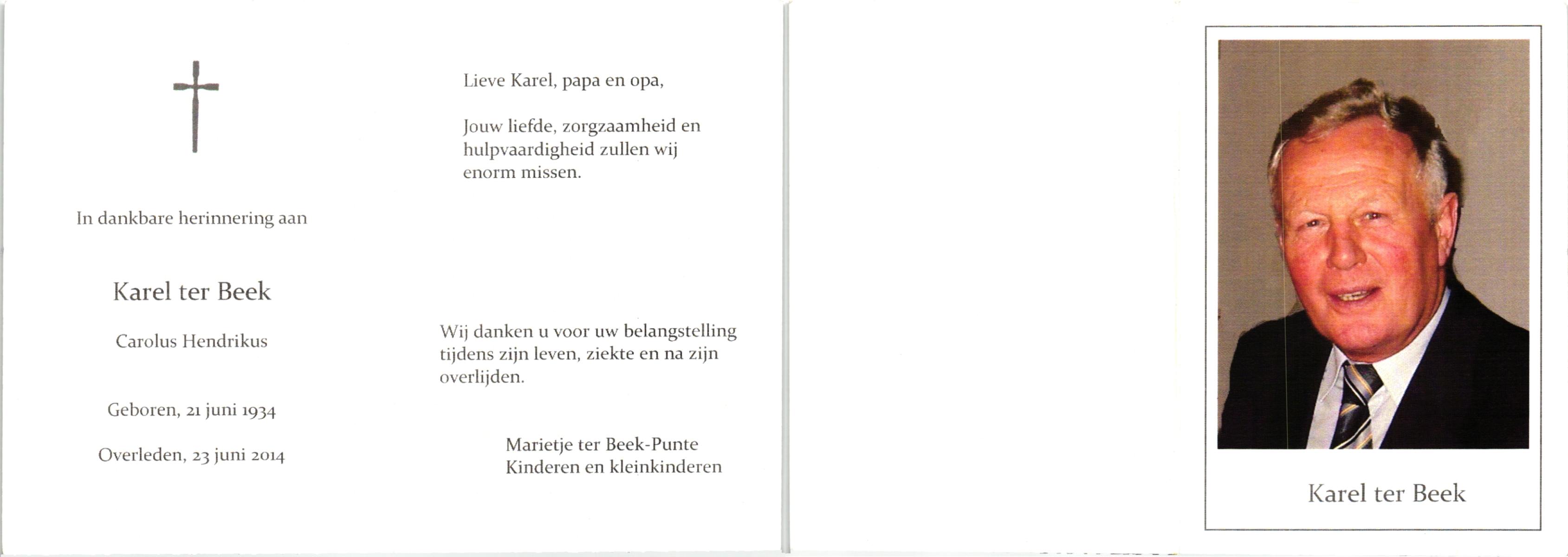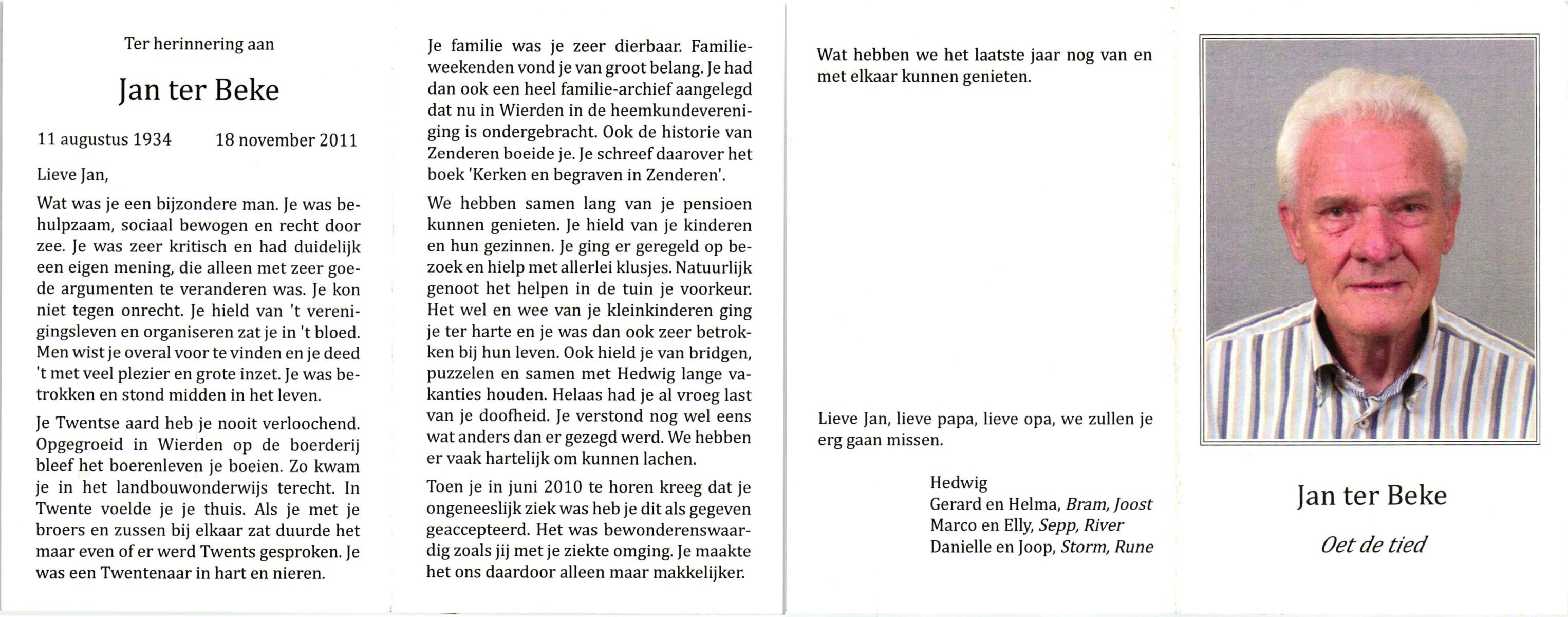 BEKE, ter, Jan, geboren op 11-8-1934 te Wierden, overleden op 18-11-2011 te Zenderen op 77-jarige leeftijd.