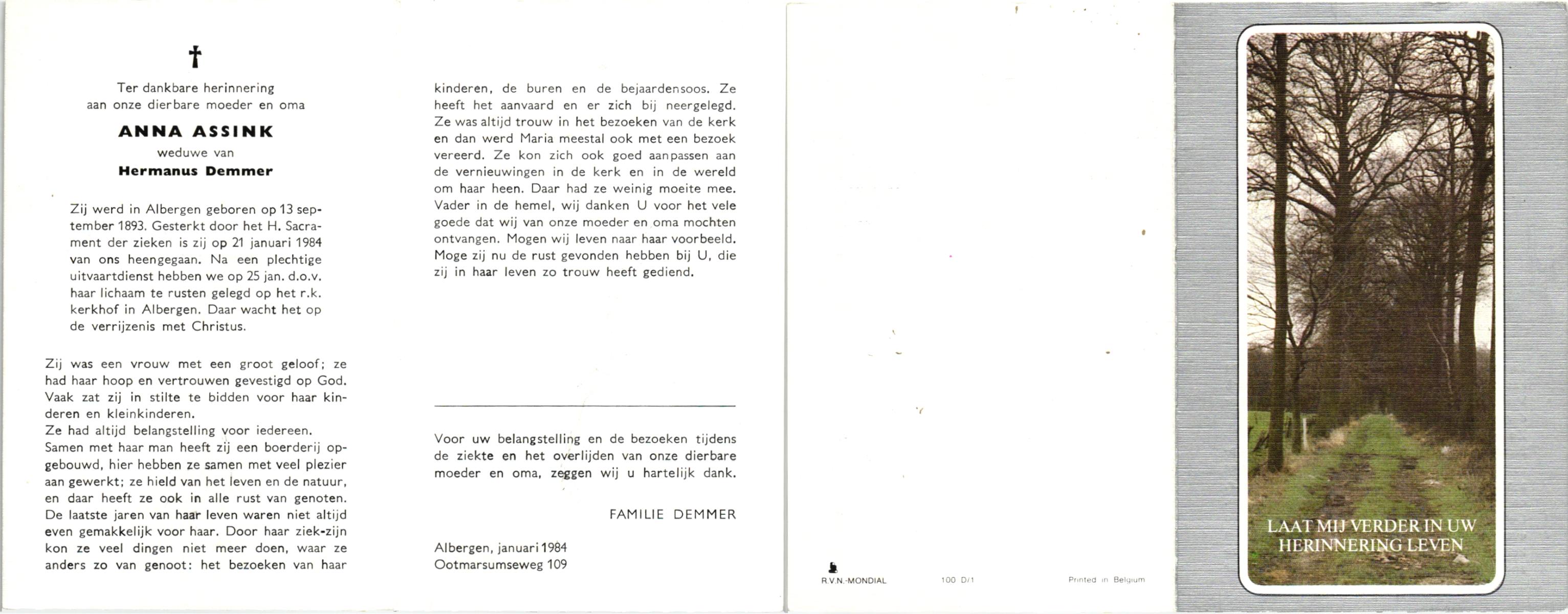 ASSINK, , Anna, geboren op 13-09-1893 te Albergen, overleden op 21-1-1984 op 90-jarige leeftijd, begraven op 25-1-1984 te Albergen.