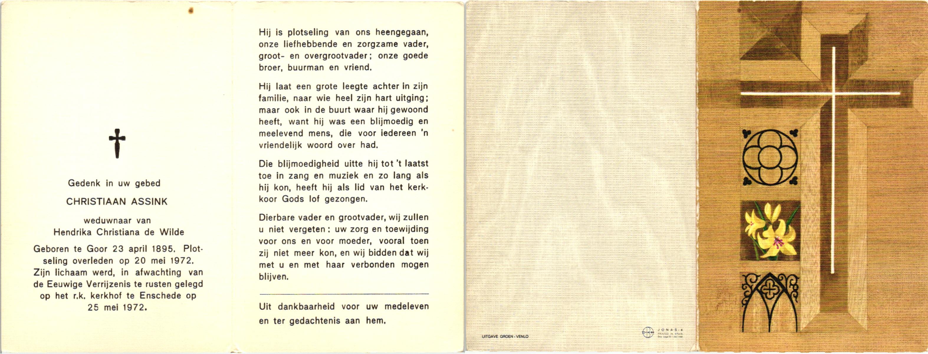ASSINK, , Christiaan, geboren op 23-04-1895 te Goor, overleden op 20-5-1972 op 77-jarige leeftijd, begraven op 25-5-1972 te Enschede.