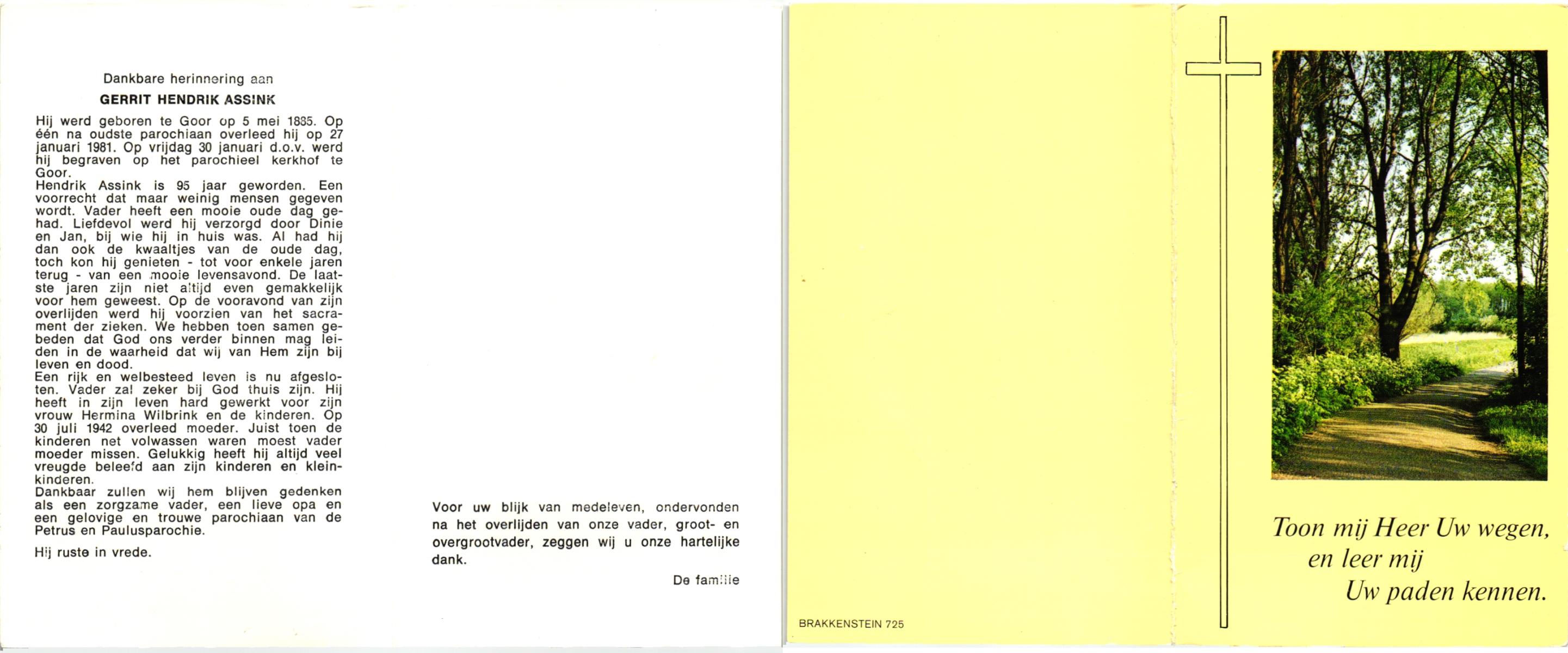 ASSINK, , Gerrit Hendrik, geboren op 05-05-1885 te Goor, overleden op 27-1-1981 te Goor op 95-jarige leeftijd, begraven op 30-1-1981 te Goor.