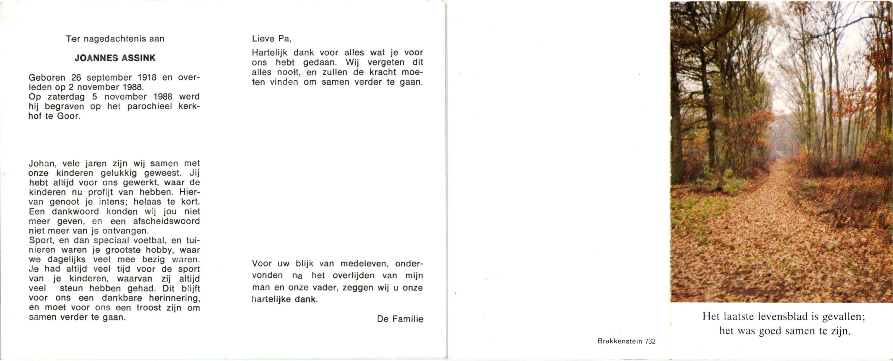 ASSINK, , Joannes, geboren op 26-9-1918, overleden op 2-11-1988 op 70-jarige leeftijd, begraven op 5-11-1988 te Goor.