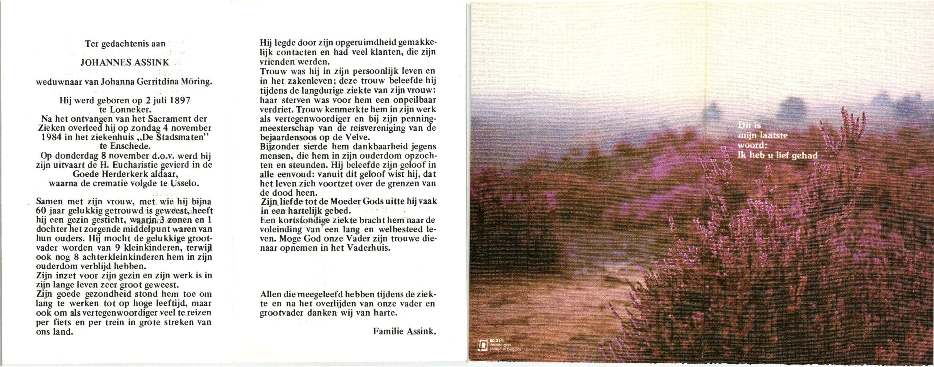 ASSINK, , Joannes, geboren op 02-07-1897 te Lonneker, overleden op 4-11-1984 te Enschede op 87-jarige leeftijd, gecremeerd op 8-11-1984 te Usselo.