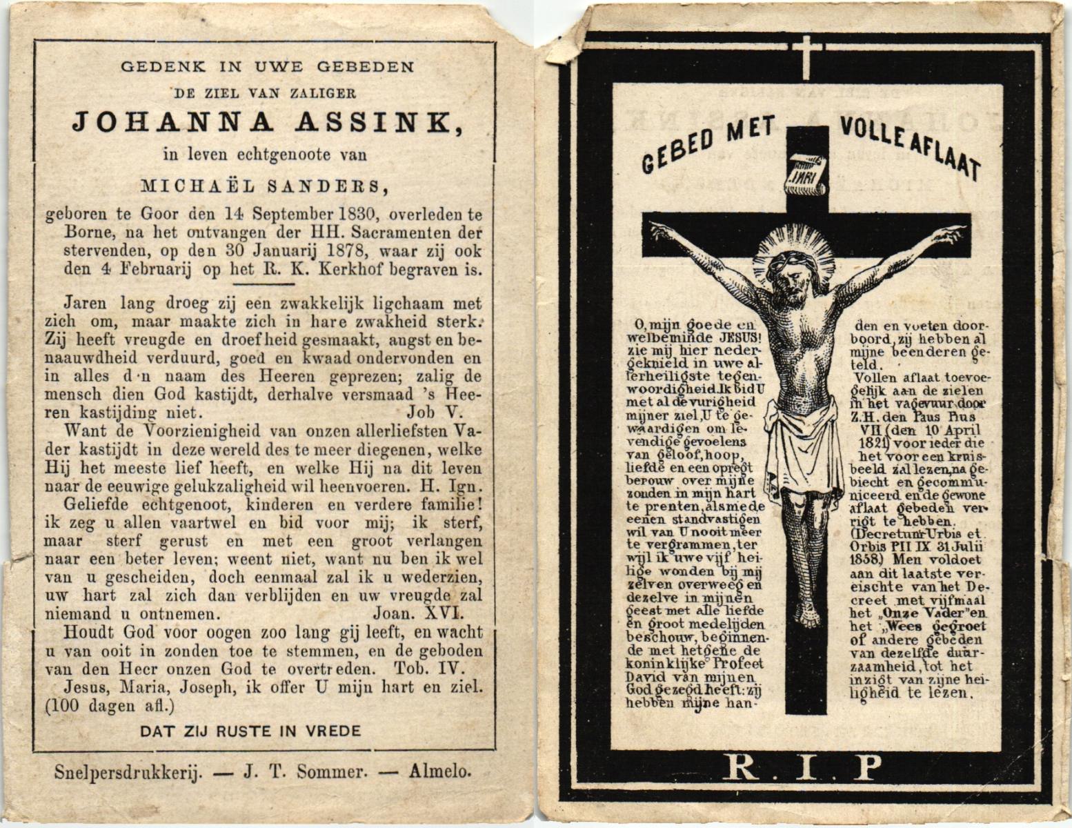 ASSINK, , Johanna, geboren op 14-09-1830 te Goor, overleden op 30-01-1878 te Borne op 47-jarige leeftijd, begraven op 04-02-1878 te Borne.