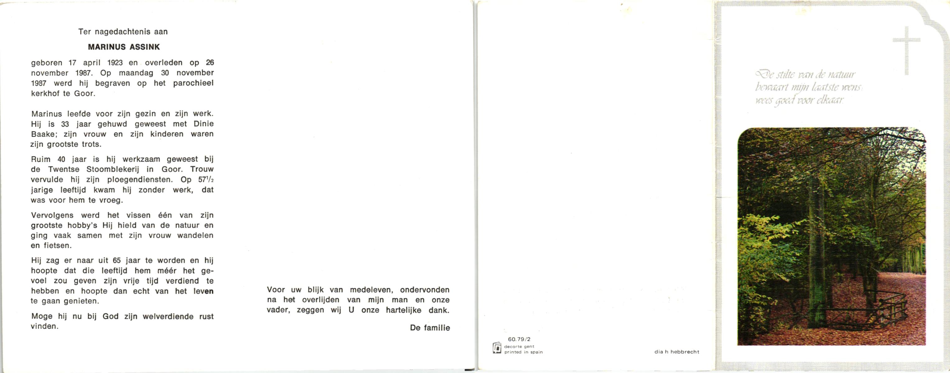 ASSINK, , Marinus, geboren op 17-4-1923, overleden op 26-11-1987 op 64-jarige leeftijd, begraven op 30-11-1987 te Goor.