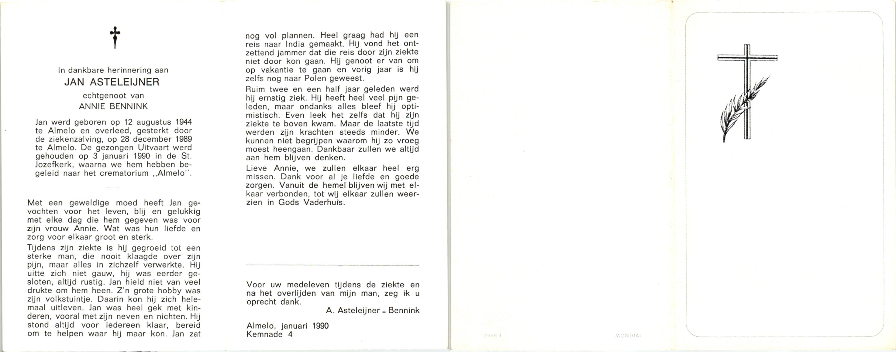 ASTELEIJNER, , Jan, geboren op 12-8-1944 te Almelo, overleden op 28-12-1989 te Almelo op 45-jarige leeftijd, gecremeerd op 3-1-1990 te Almelo.