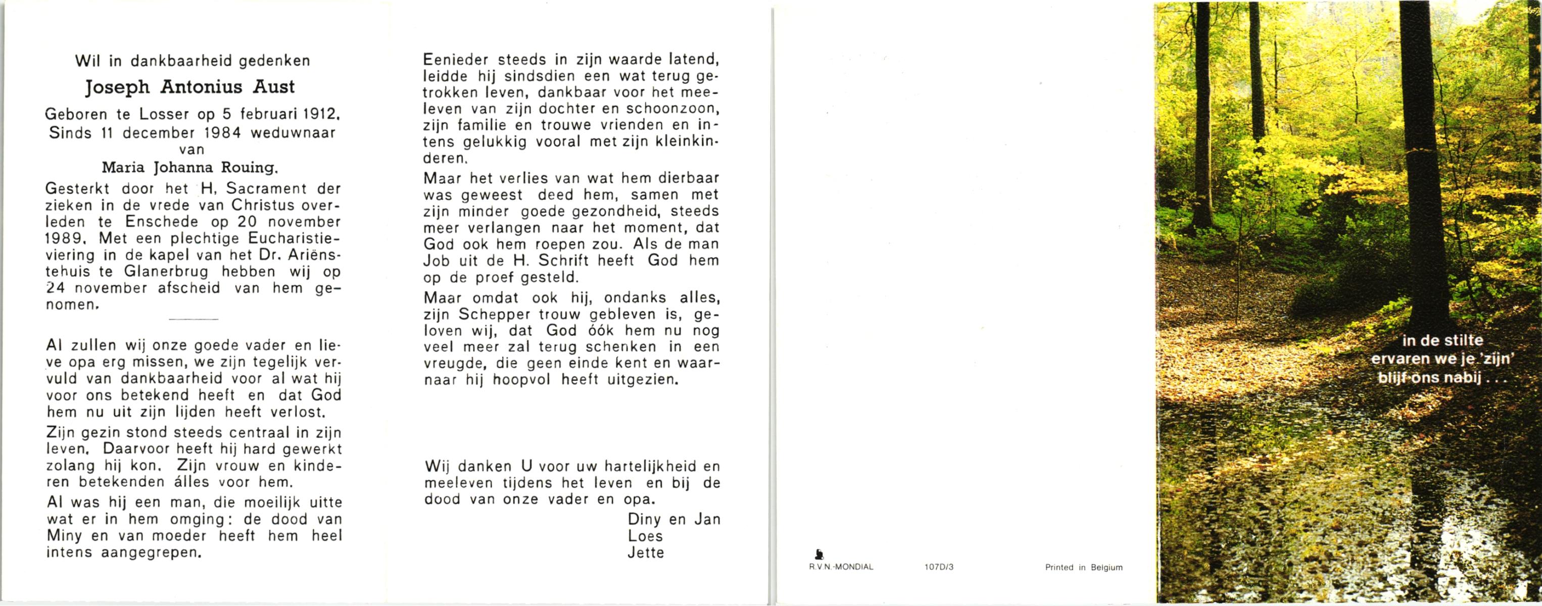 AUST, , Joseph Antonius, geboren op 5-2-1912 te Losser, overleden op 20-11-1989 te Enschede op 77-jarige leeftijd.