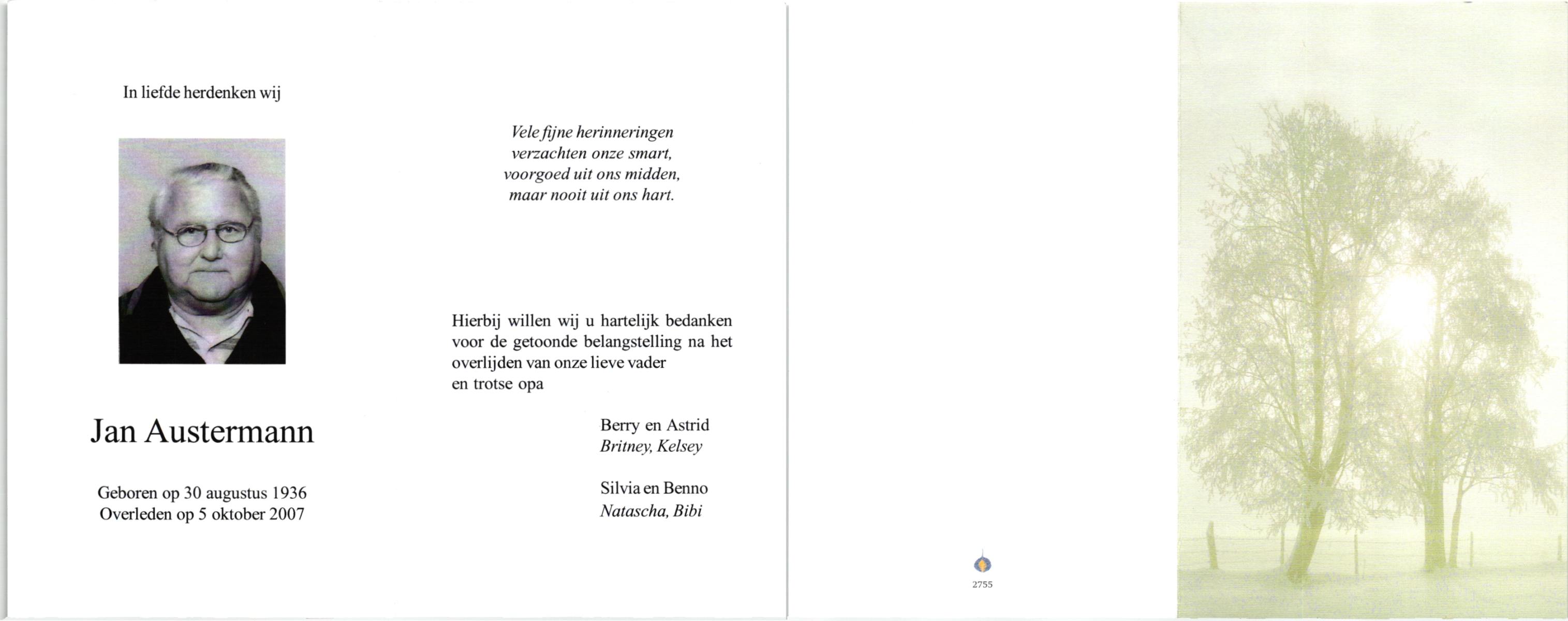 AUSTERMANN, , Jan, geboren op 30-8-1936, overleden op 5-10-2007 op 71-jarige leeftijd.