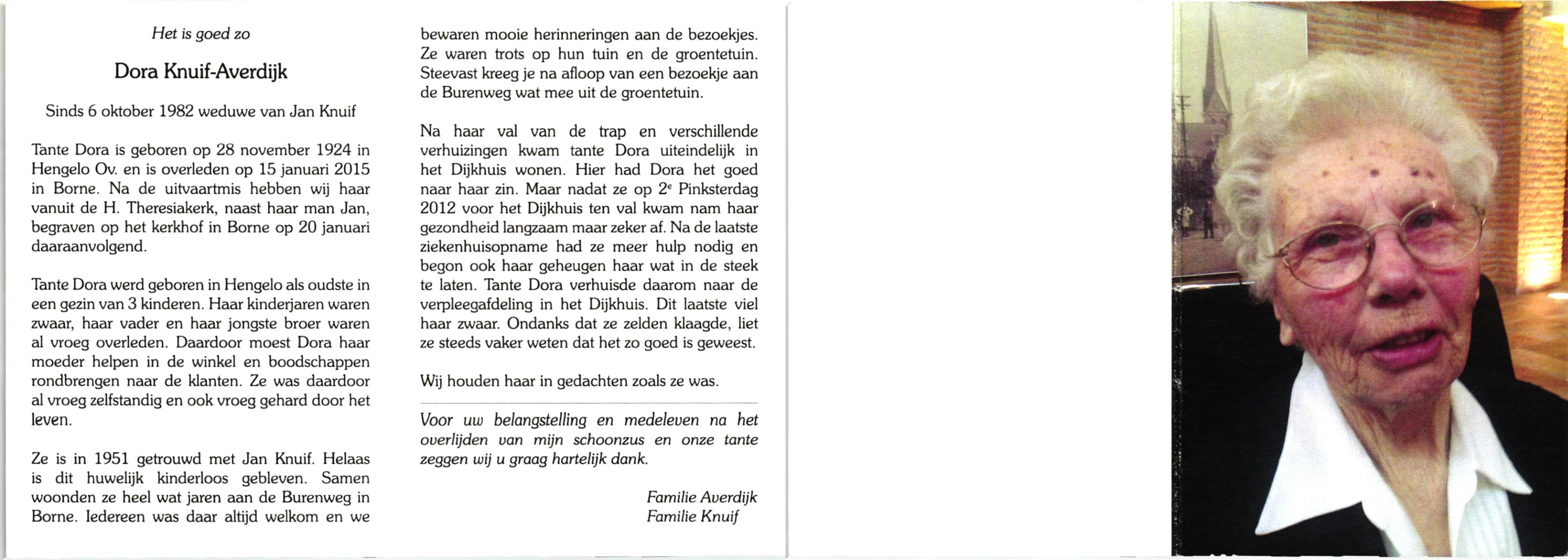 AVERDIJK, , Dora, geboren op 28-11-1924 te Hengelo (O), overleden op 15-1-2015 te Borne op 90-jarige leeftijd, begraven op 20-1-2015 te Borne.