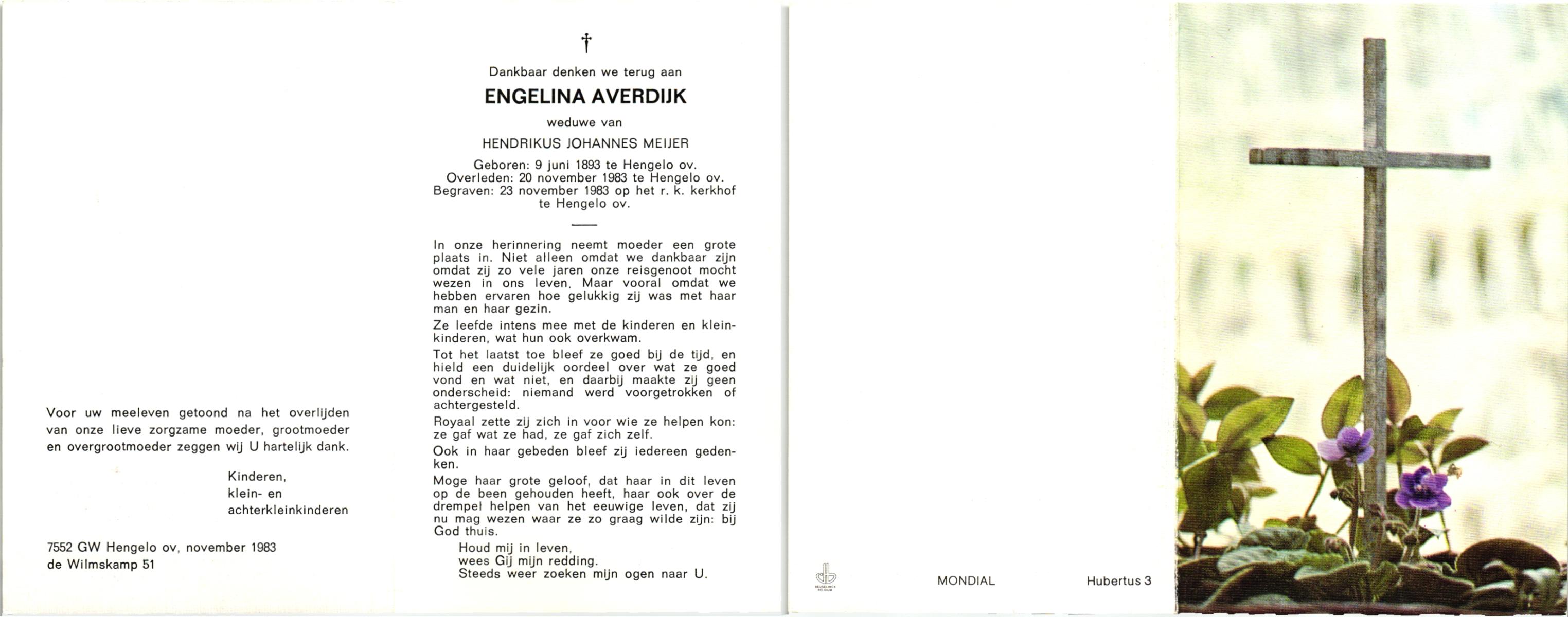 AVERDIJK, , Engelina, geboren op 09-06-1893 te Hengelo (O), overleden op 20-11-1983 te Hengelo (O) op 90-jarige leeftijd, begraven op 23-11-1983 te Hengelo.