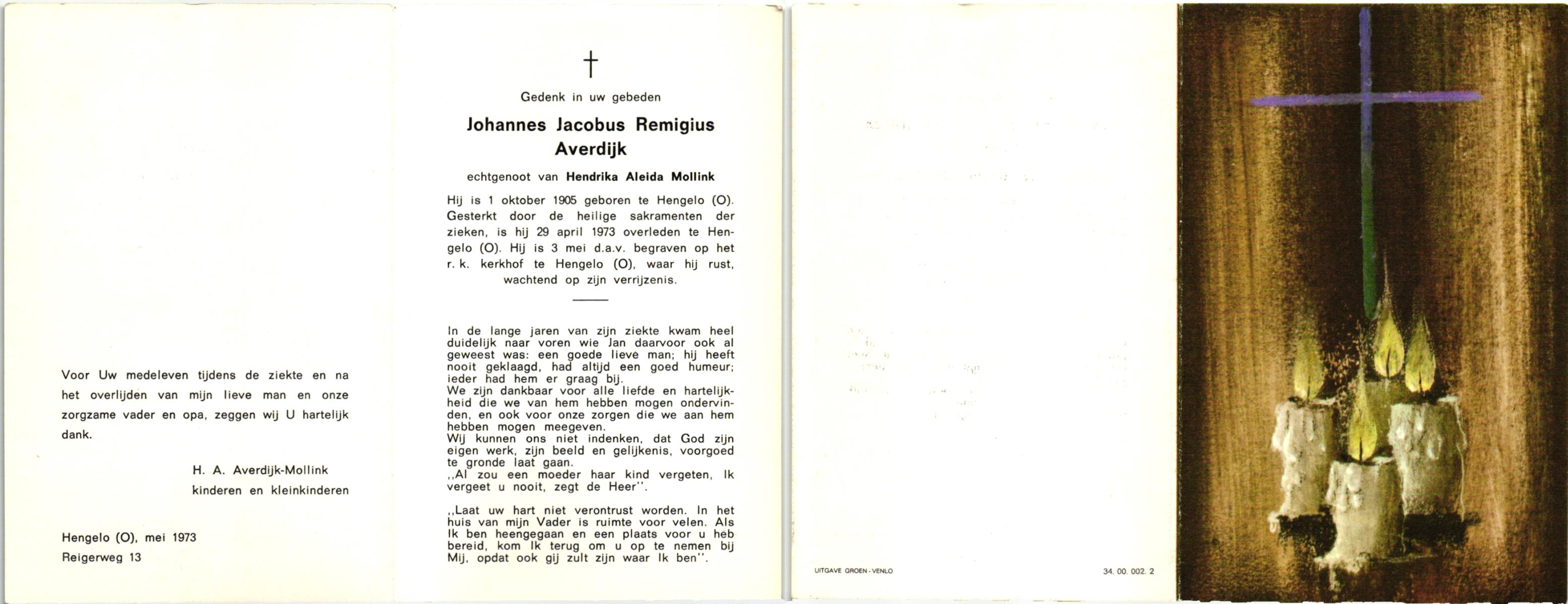 AVERDIJK, , Johannes Jacobus Remigius, geboren op 1-10-1905 te Hengelo (O), overleden op 29-4-1973 te Hengelo (O) op 67-jarige leeftijd, begraven op 3-5-1973 te Hengelo.