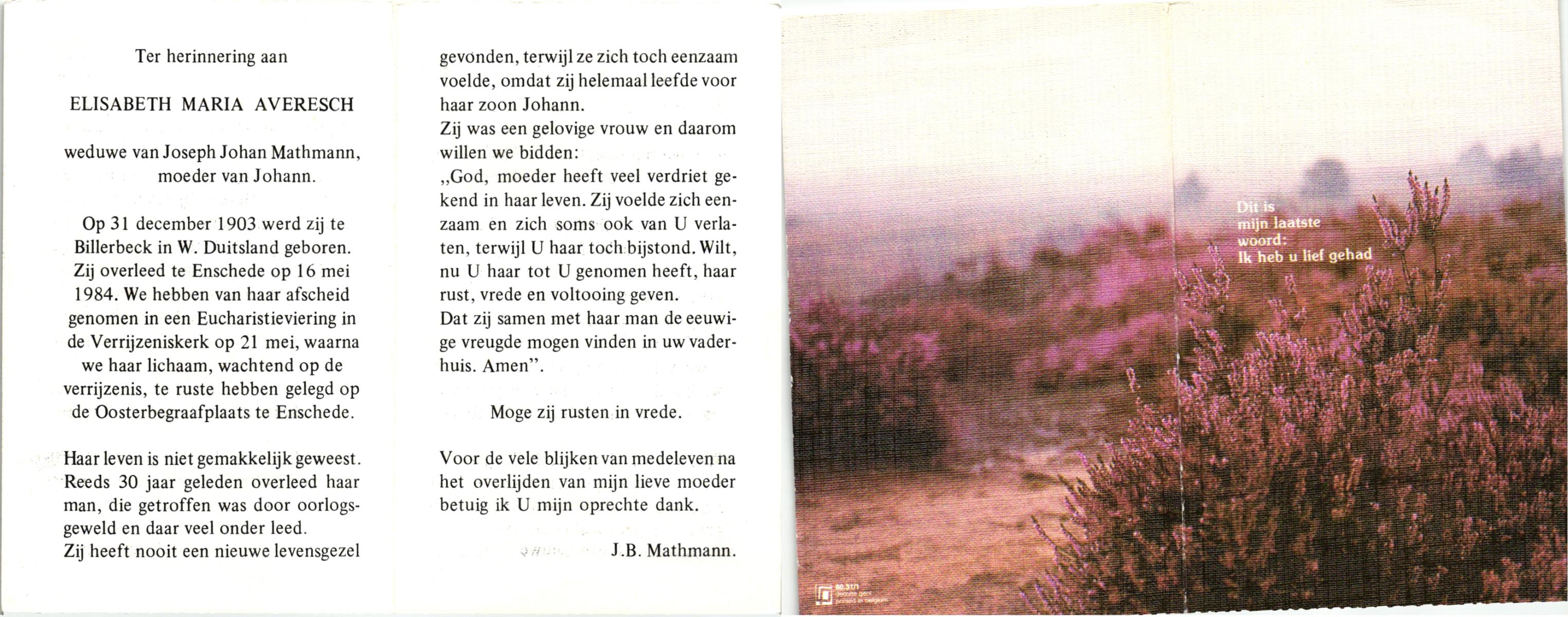 AVERESCH, , Elisabeth Maria, geboren op 31-12-1903 te Billerbeck. Dld, overleden op 16-5-1984 te Enschede op 80-jarige leeftijd, begraven op 21-5-1984 te Enschede.