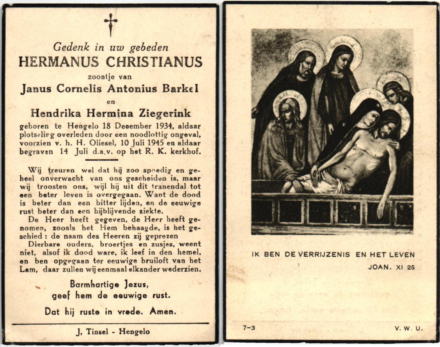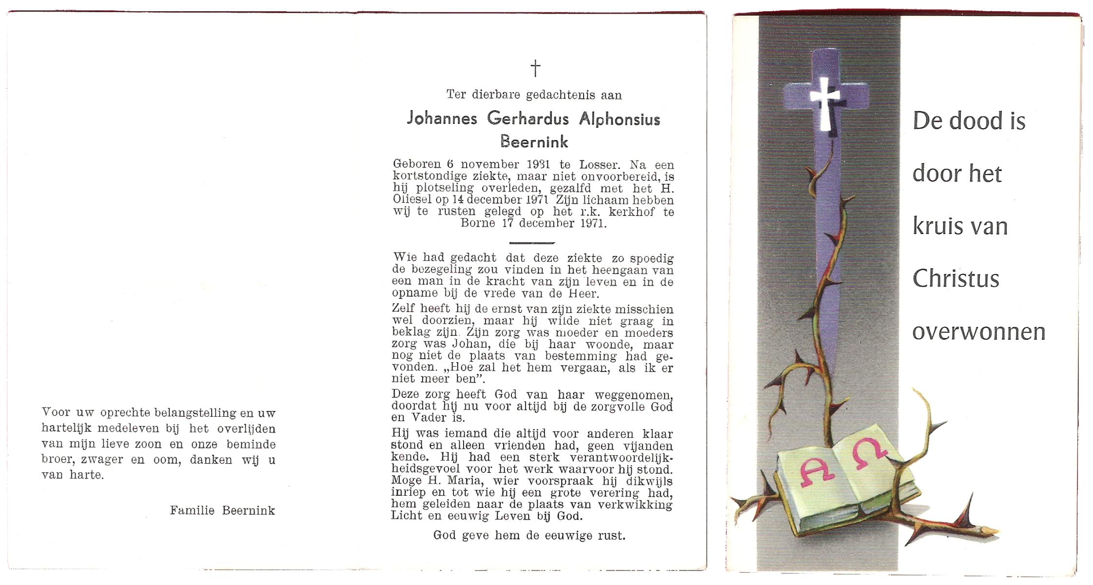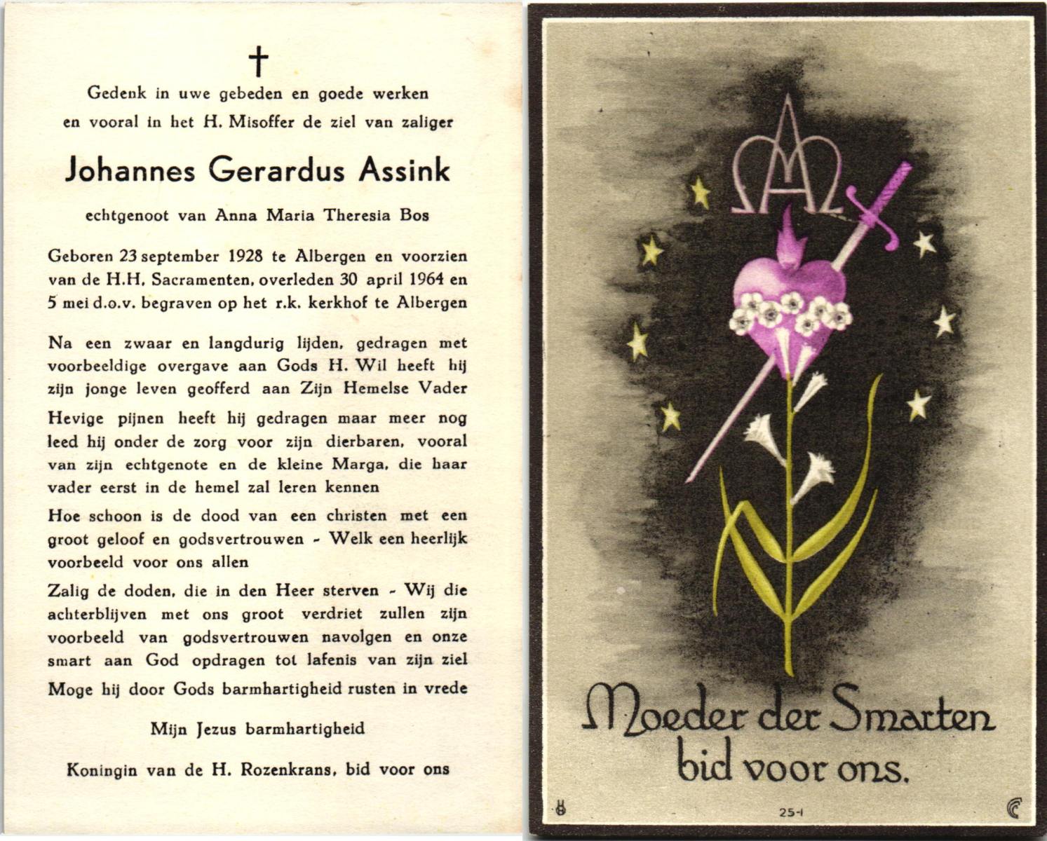 ASSINK, Johannes Gerardus, geboren op 23-9-1928 te Albergen, overleden op 30-4-1964 te Albergen op 35-jarige leeftijd, begraven op 5-5-1964 te Albergen.