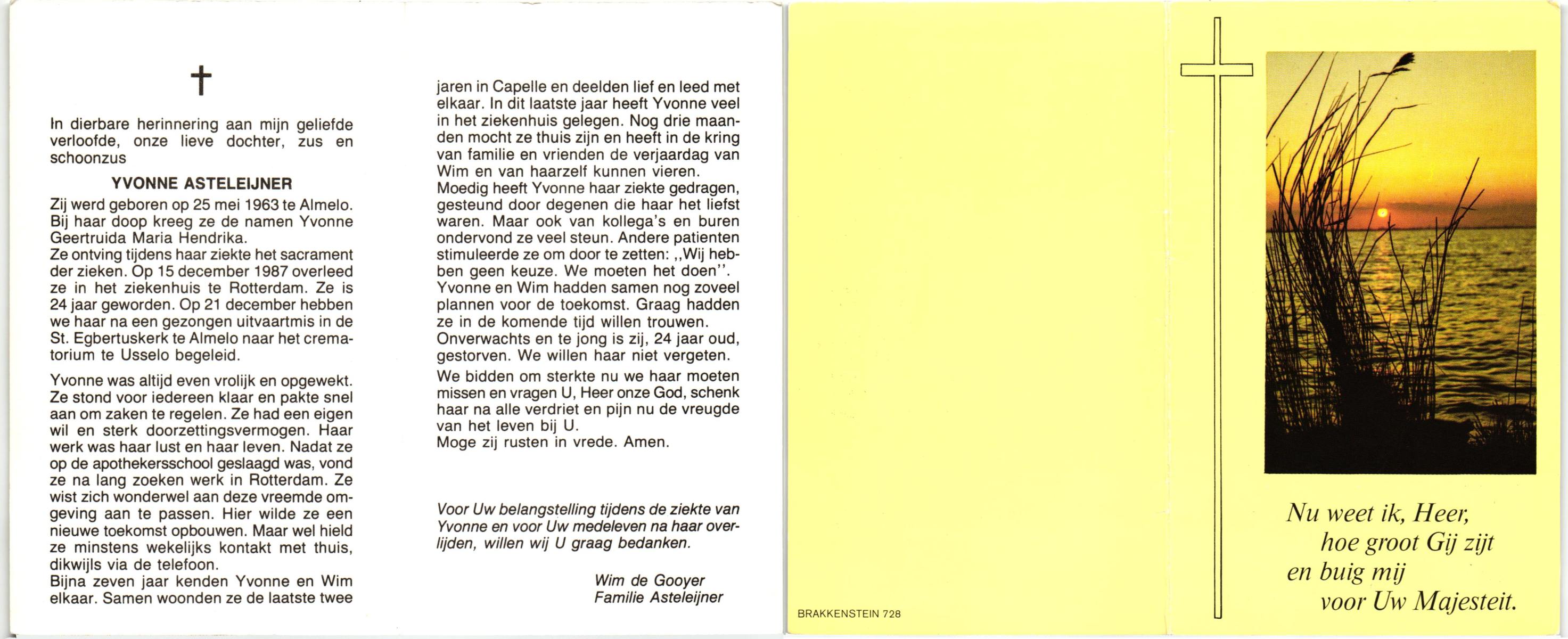 ASTELEIJNER, Yvonne, geboren op 25-5-1963 te Almelo, overleden op 15-12-1987 te Rotterdam, ziekenhuis op 24-jarige leeftijd, gecremeerd op 21-12-1987 te Usselo.