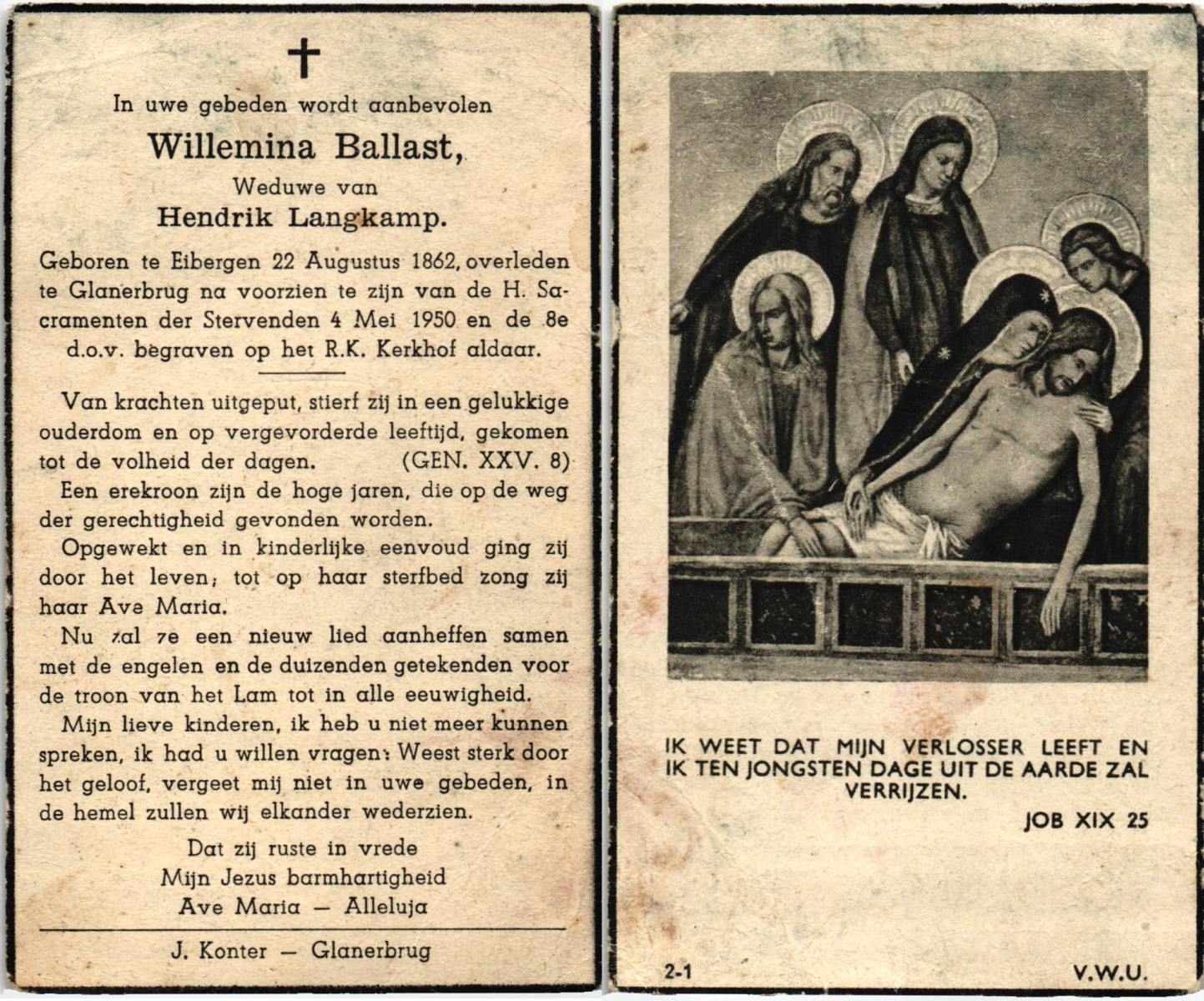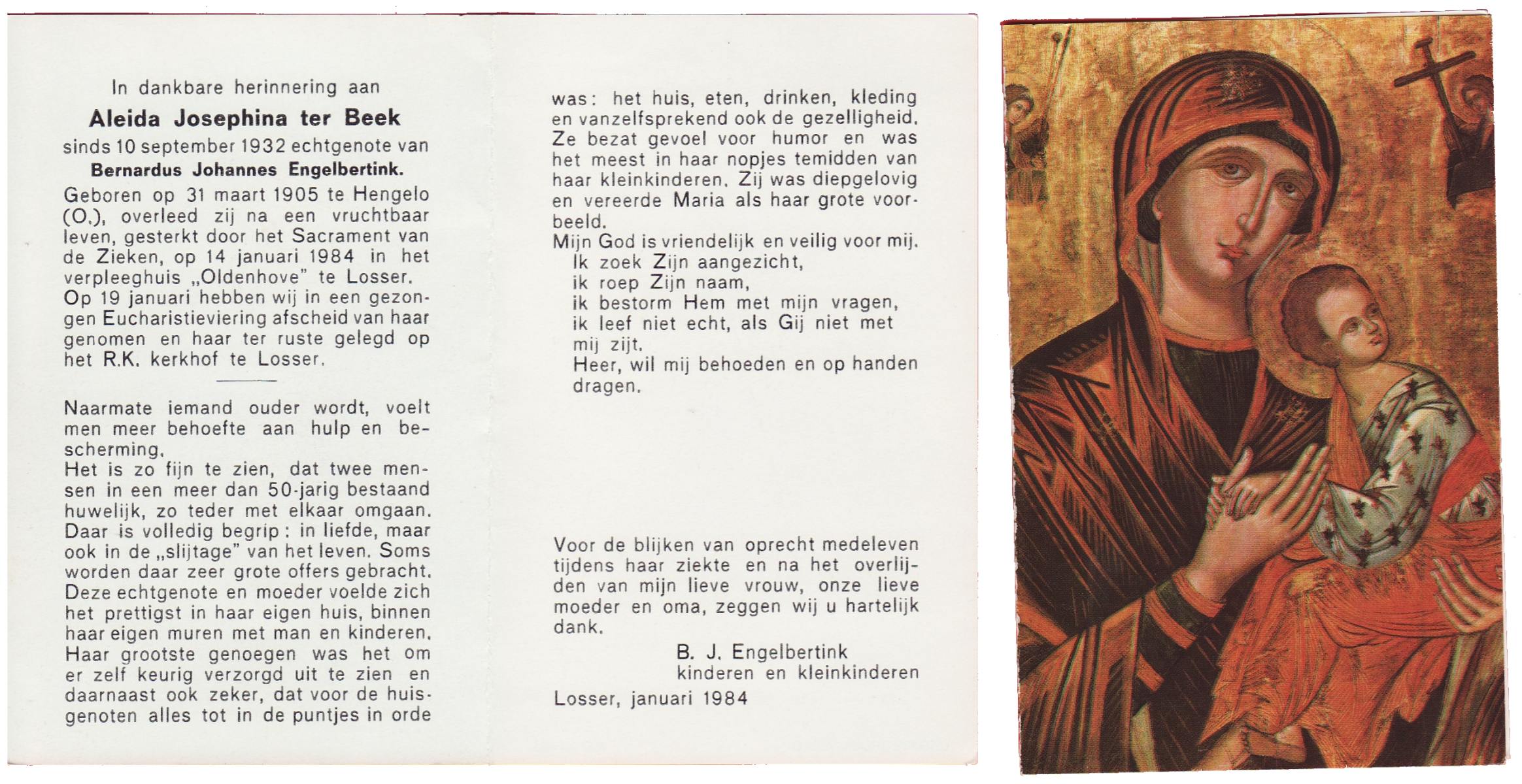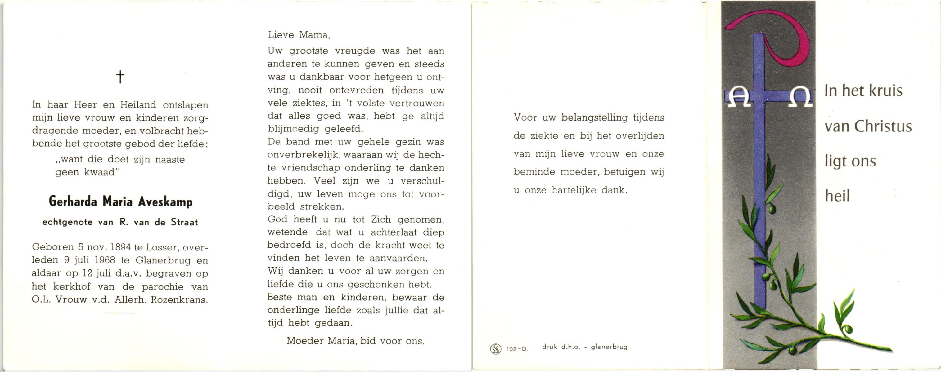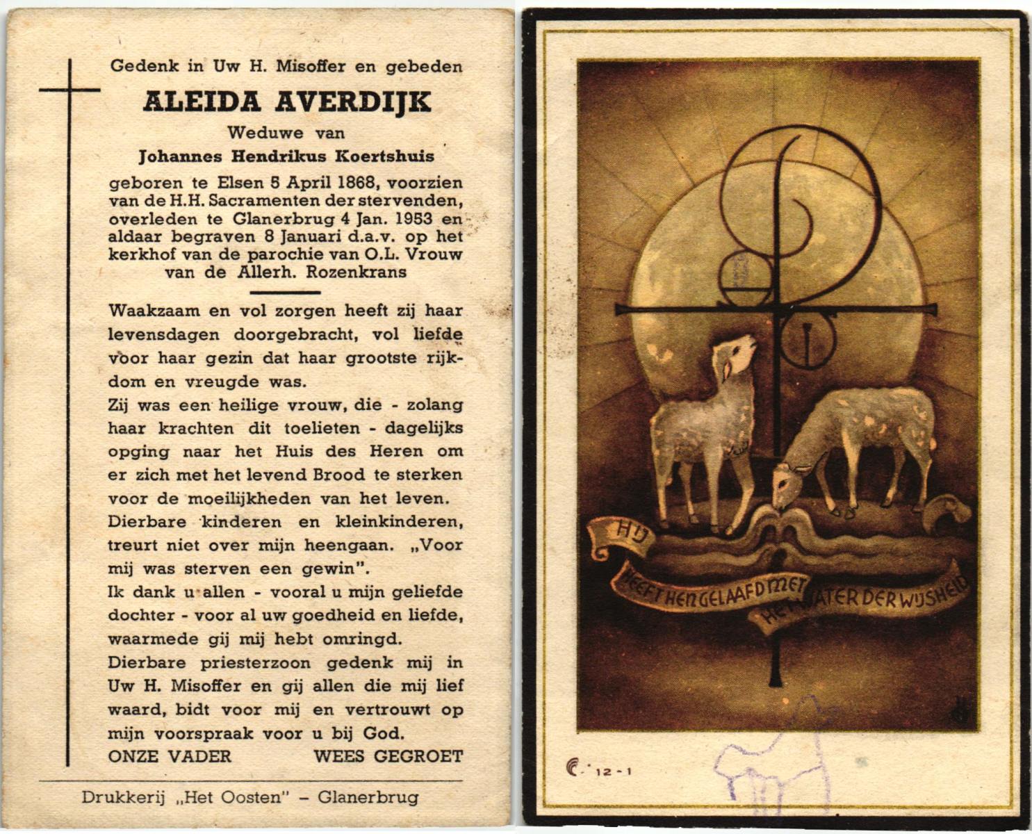 AVERDIJK, Aleida, geboren op 08-04-1868 te Elsen, overleden op 4-1-1953 te Glanerbrug op 84-jarige leeftijd, begraven op 8-1-1953 te Glanerbrug.