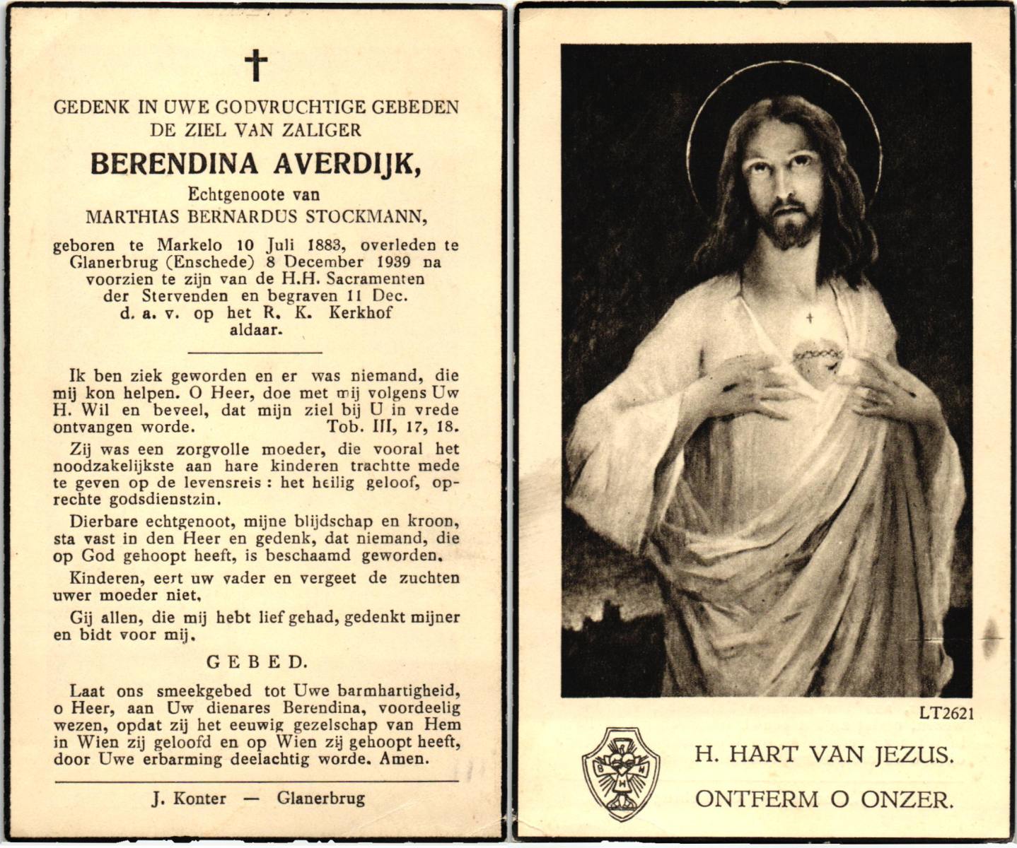 AVERDIJK, Berendina, geboren op 10-07-1883 te Markelo, overleden op 8-12-1939 te Glanerbrug op 56-jarige leeftijd, begraven op 11-12-1939 te Glanerbrug.
