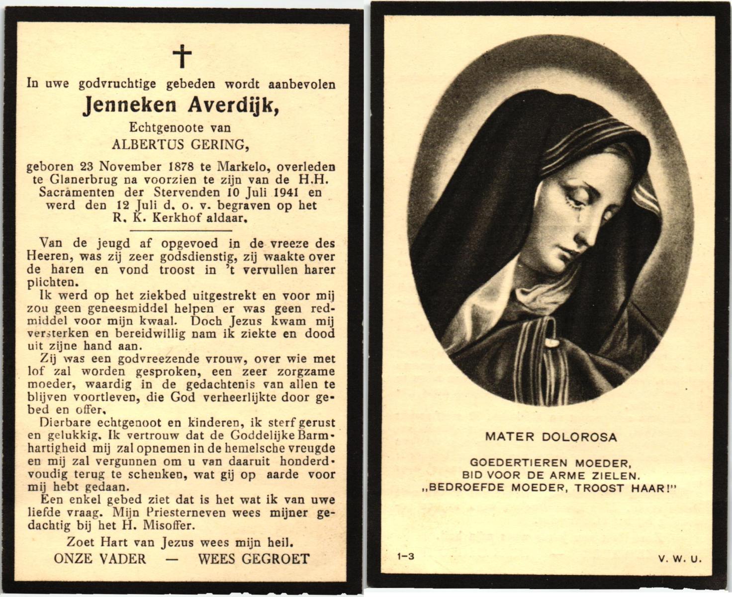 AVERDIJK, Jenneken, geboren op 23-11-1878 te Markelo, overleden op 10-7-1941 te Glanerbrug op 62-jarige leeftijd, begraven op 12-7-1941 te Glanerbrug.