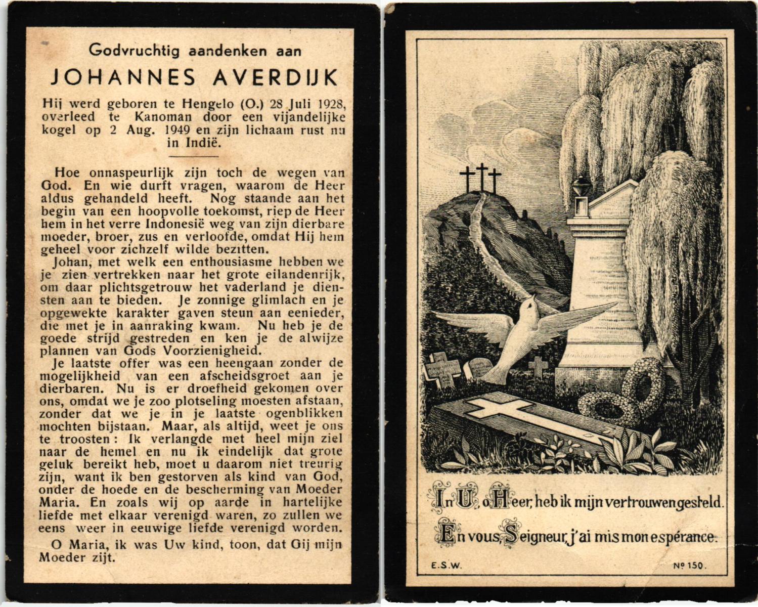 AVERDIJK, Johannes, geboren op 28-7-1928 te Hengelo, overleden op 2-8-1949 te Kanoman, Indië op 21-jarige leeftijd, begraven te Indië.