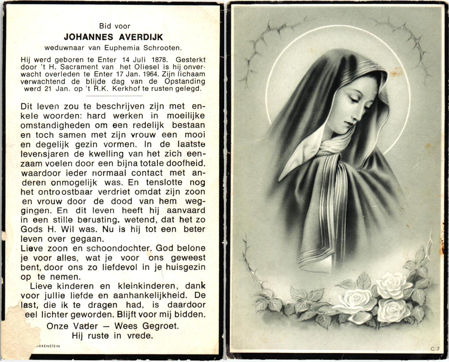 AVERDIJK, Johannes, geboren op 14-07-1878 te Wierden, Enter, overleden op 17-1-1964 te Wierden, Enter op 85-jarige leeftijd, begraven op 21-1-1964 te Wierden, Enter.