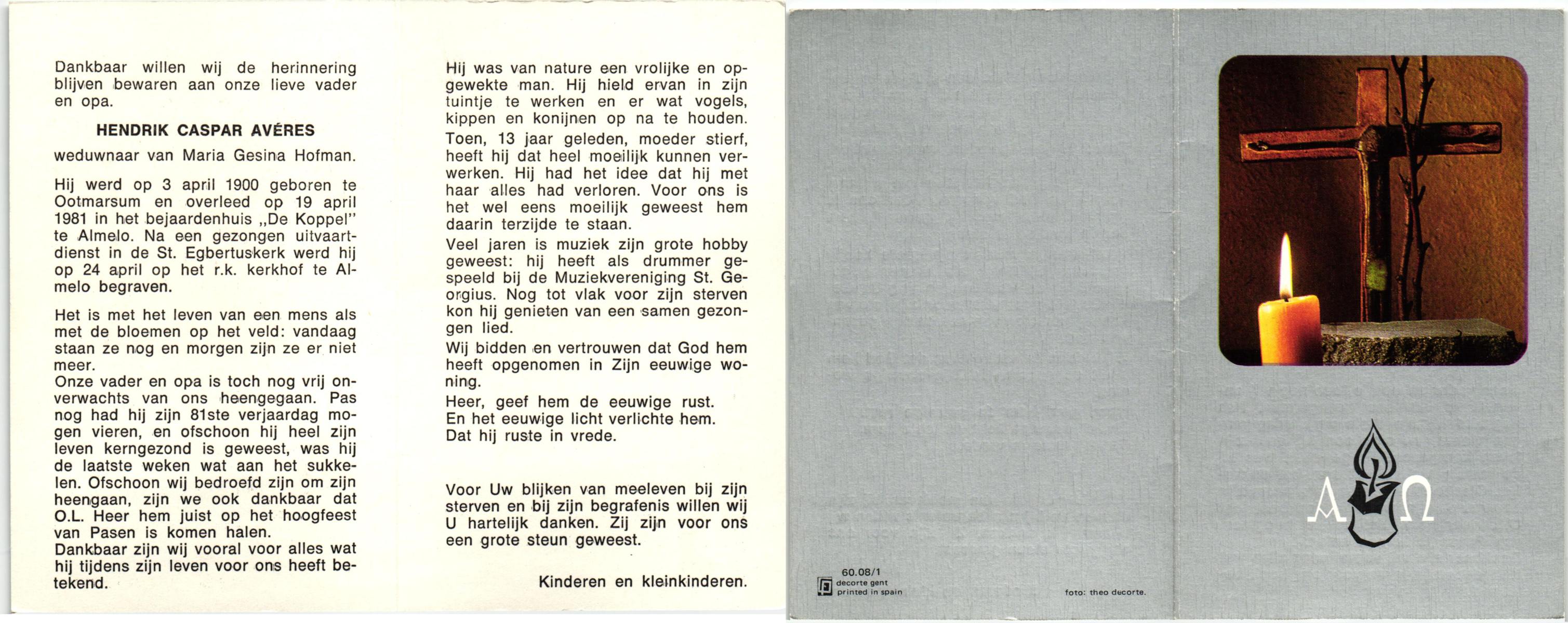 AVERES, Hendrik Caspar, geboren op 3-4-1900 te Ootmarsum, overleden op 19-4-1981 te Almelo op 81-jarige leeftijd, begraven op 24-4-1981 te Almelo.