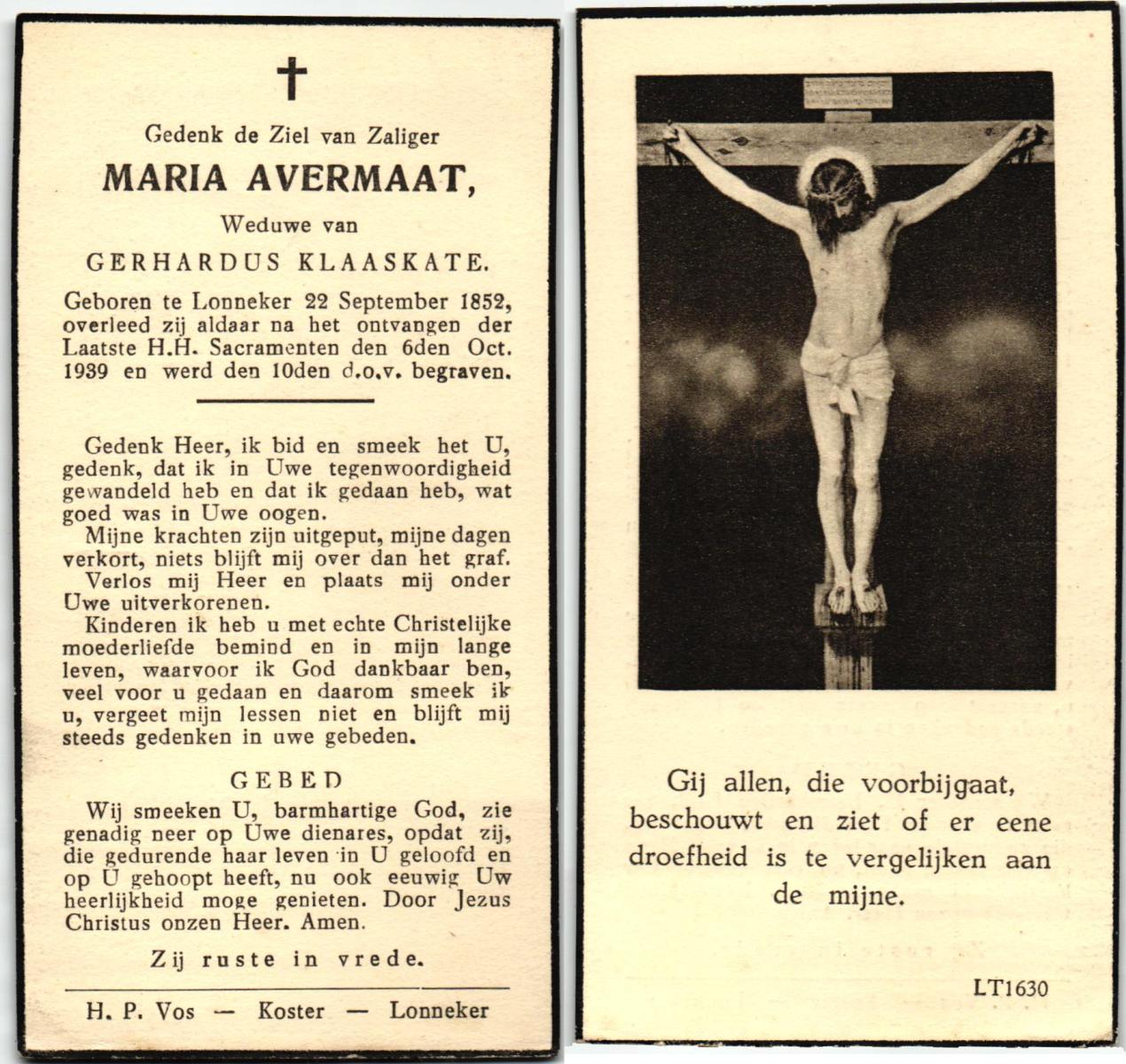 AVERMAAT, Maria, geboren op 22-09-1852 te Lonneker, overleden op 6-10-1939 te Lonneker op 87-jarige leeftijd, begraven op 10-10-1939 te Lonneker.