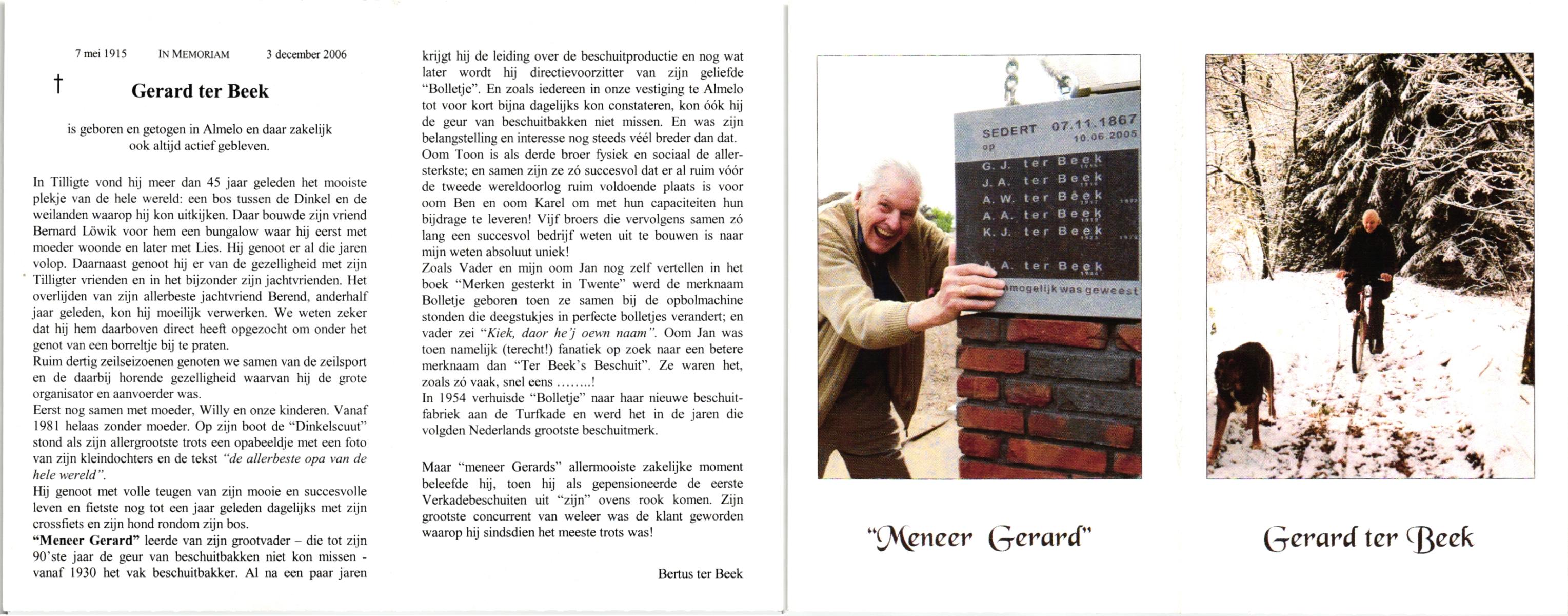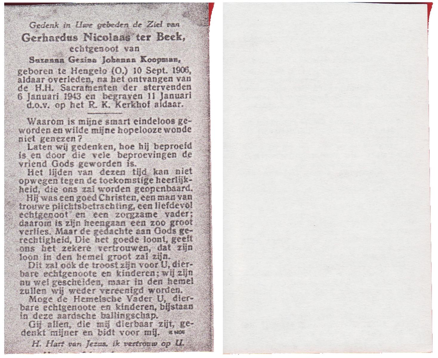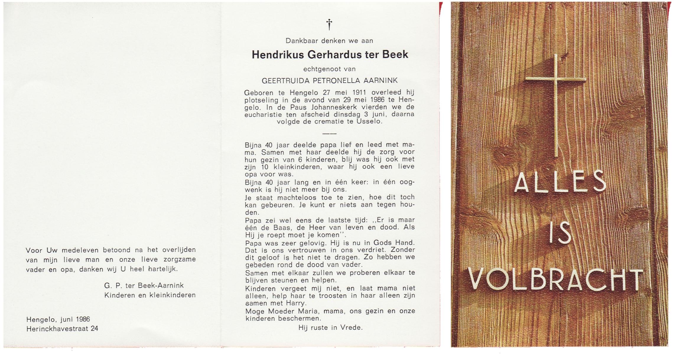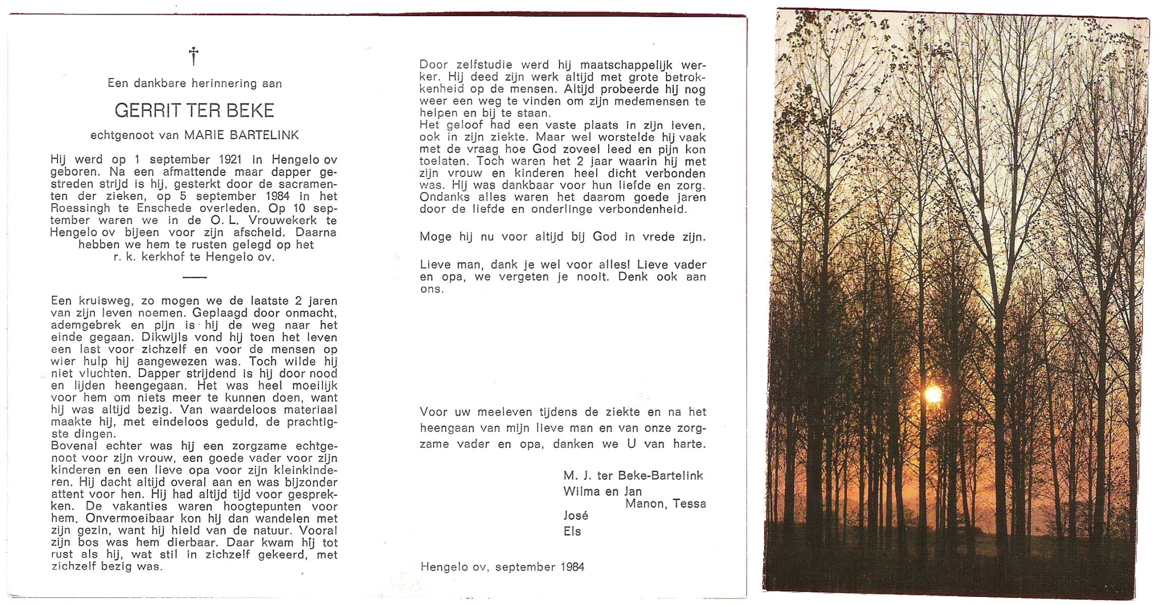 BEKE, ter, Gerrit, geboren op 1-9-1921 te Hengelo (O), overleden op 5-9-1984 te Enschede op 63-jarige leeftijd, begraven op 10-9-1984 te Hengelo (Ov.).
