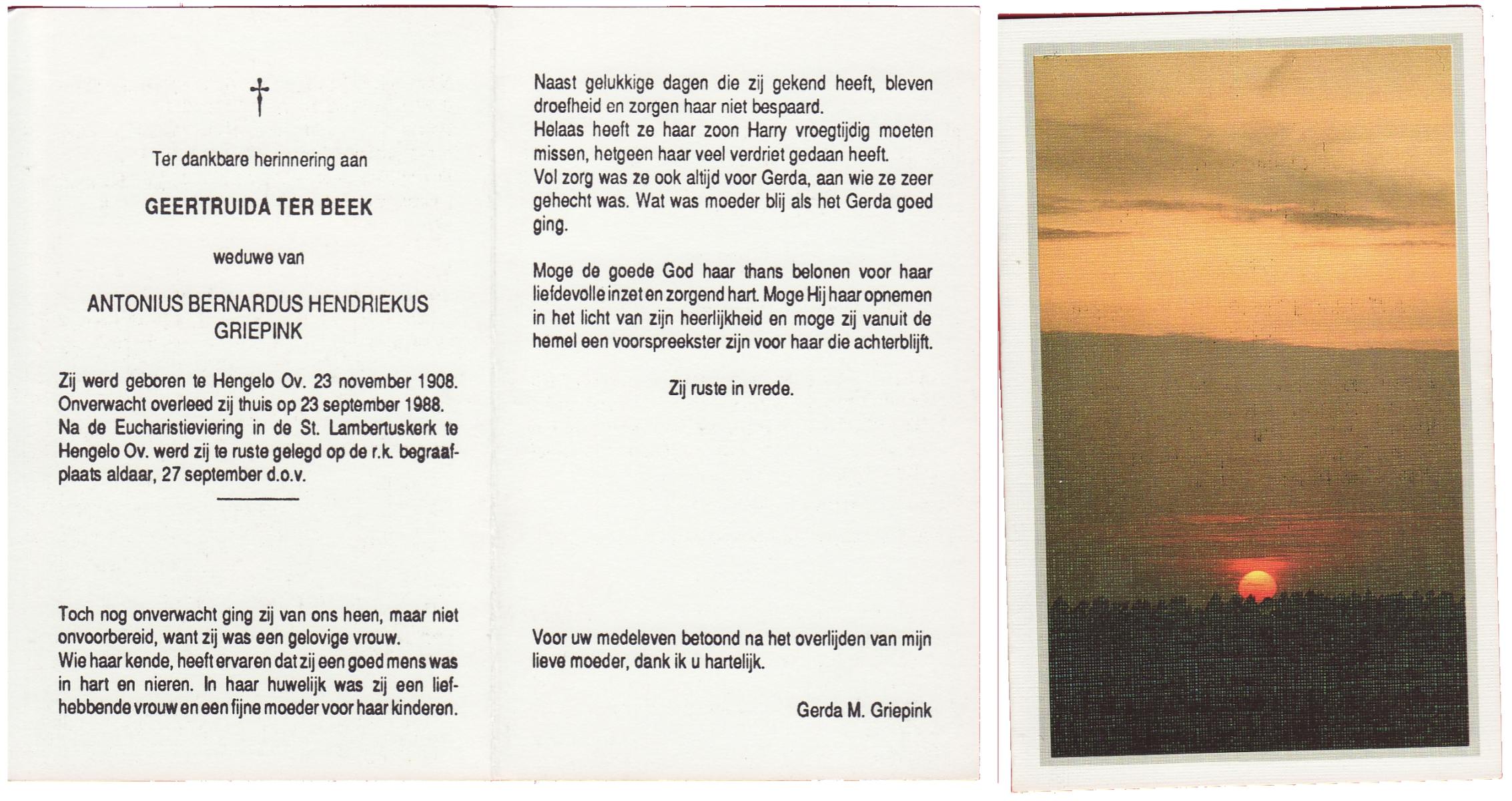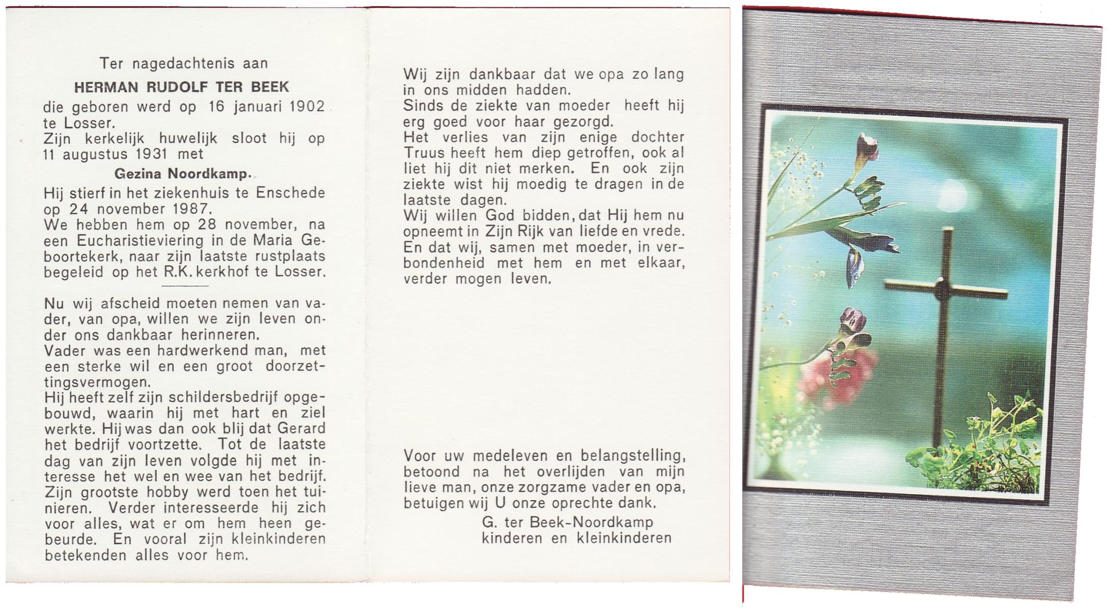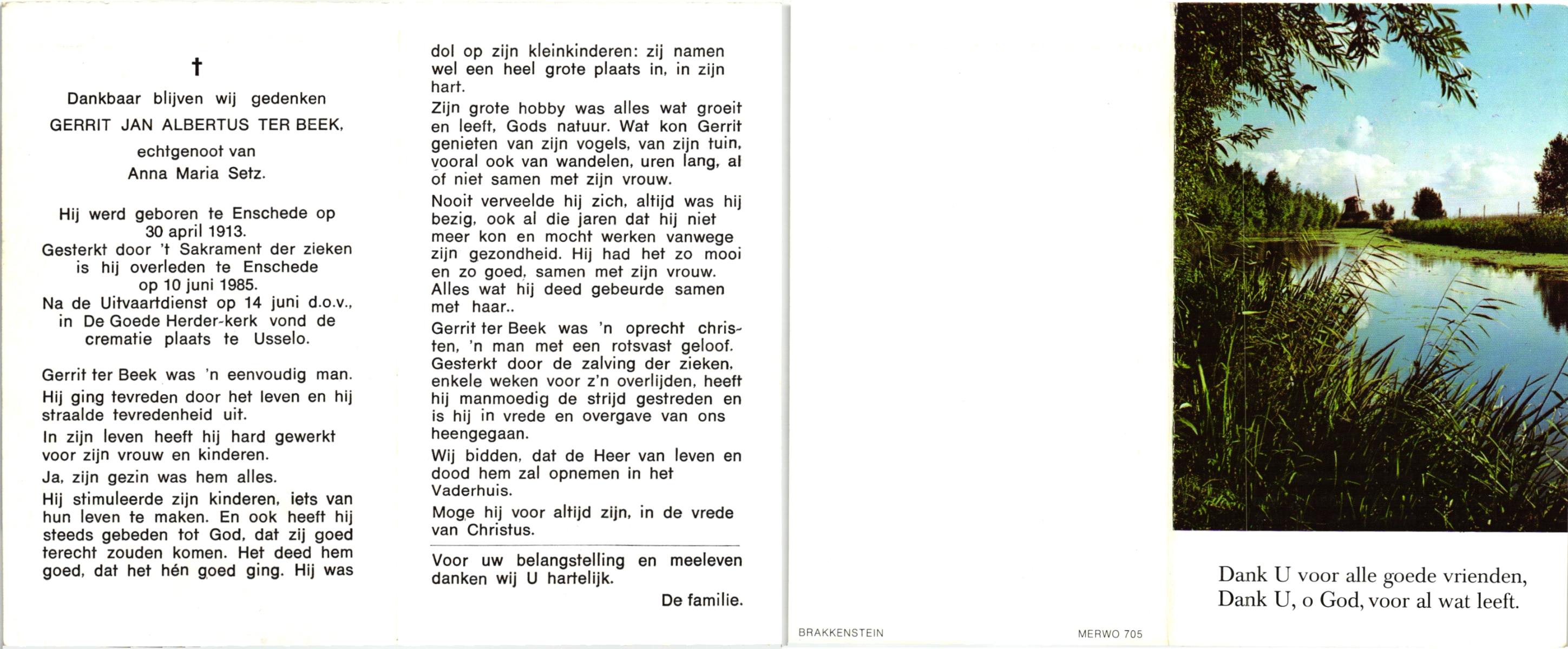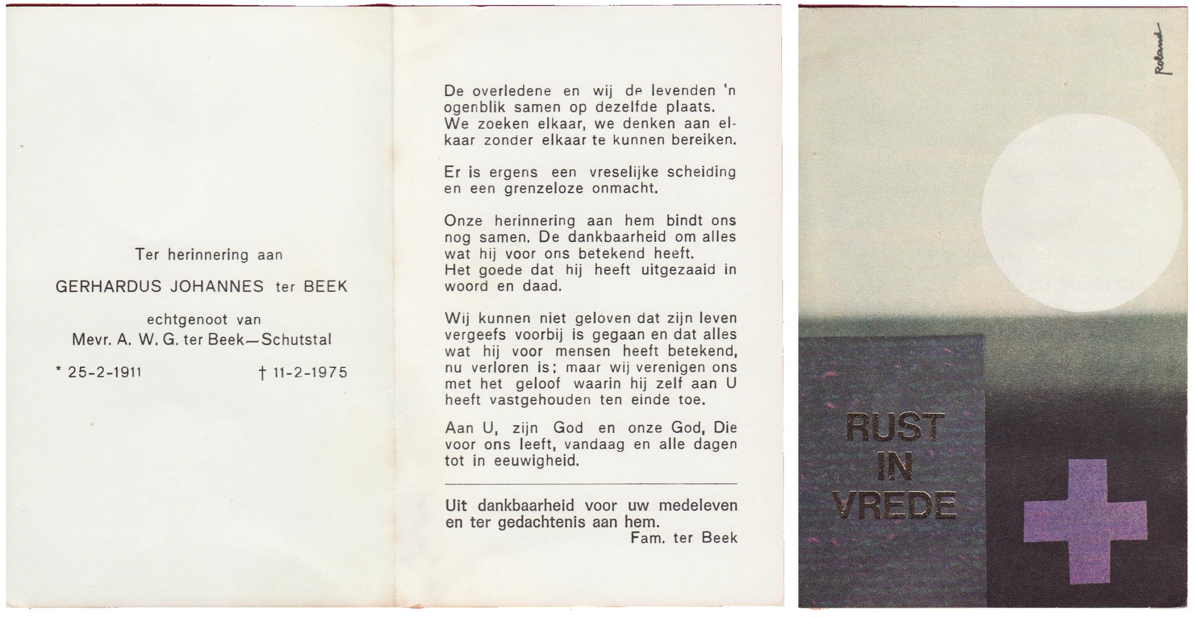 BEKE, ter, Gerrit, geboren op 1-9-1921 te Hengelo (O), overleden op 5-9-1984 te Enschede op 63-jarige leeftijd, begraven op 10-9-1984 te Hengelo (Ov.).