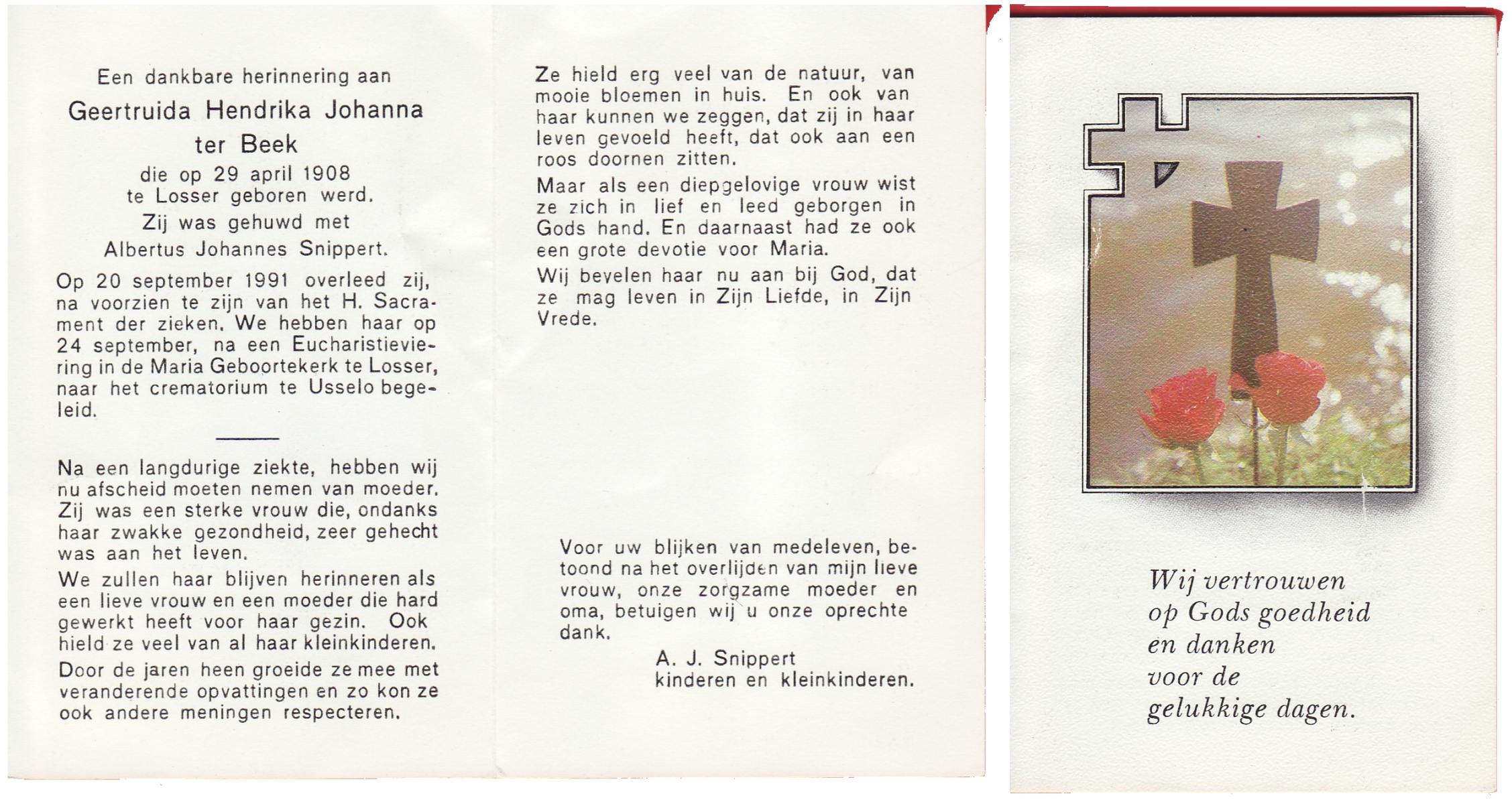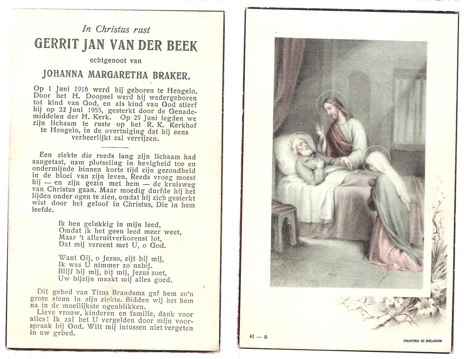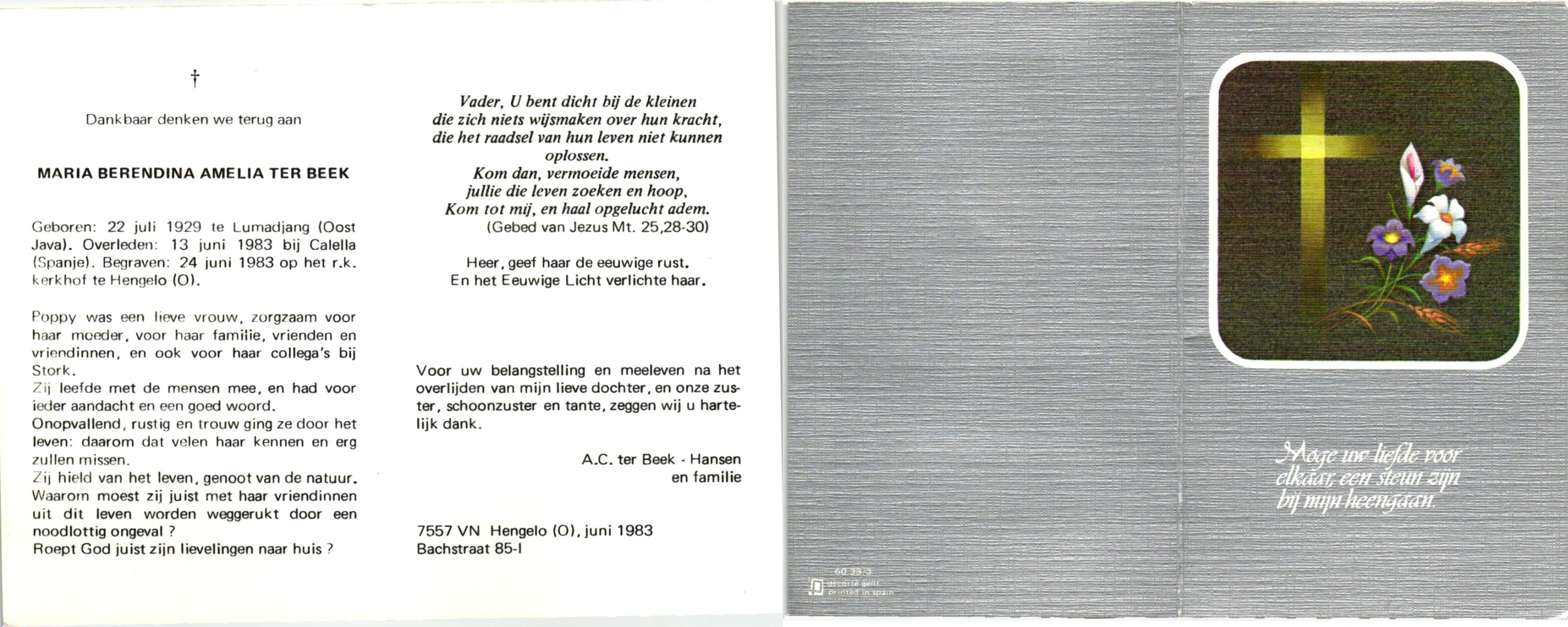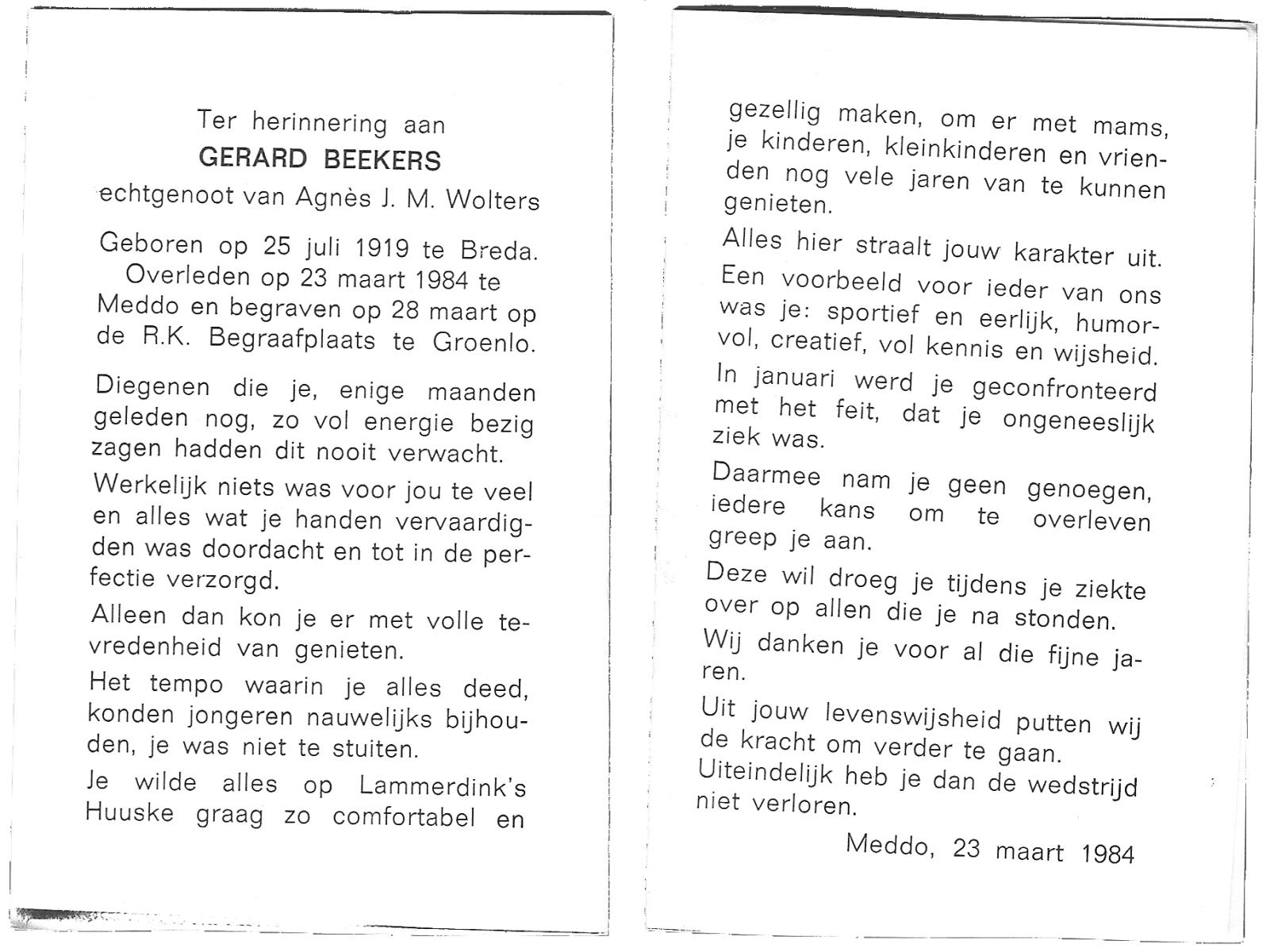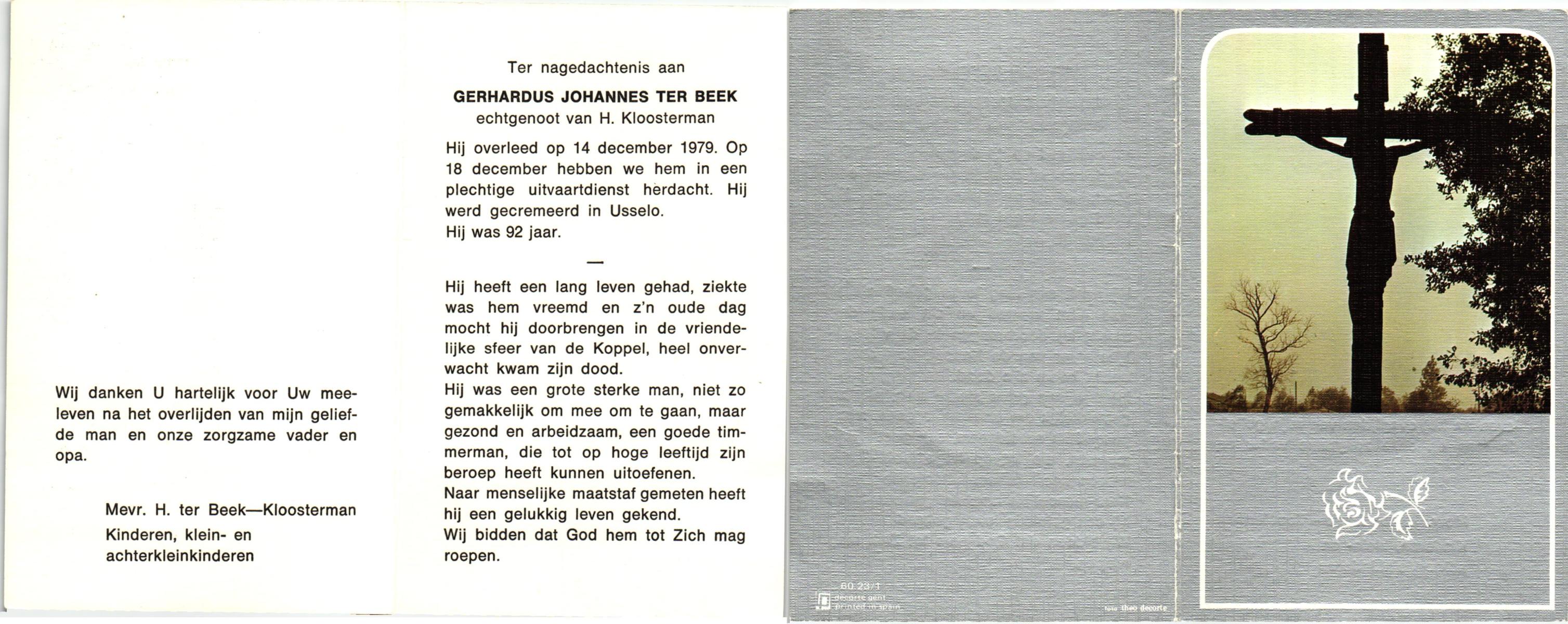 BEKE, ter, Gerrit, geboren op 1-9-1921 te Hengelo (O), overleden op 5-9-1984 te Enschede op 63-jarige leeftijd, begraven op 10-9-1984 te Hengelo (Ov.).